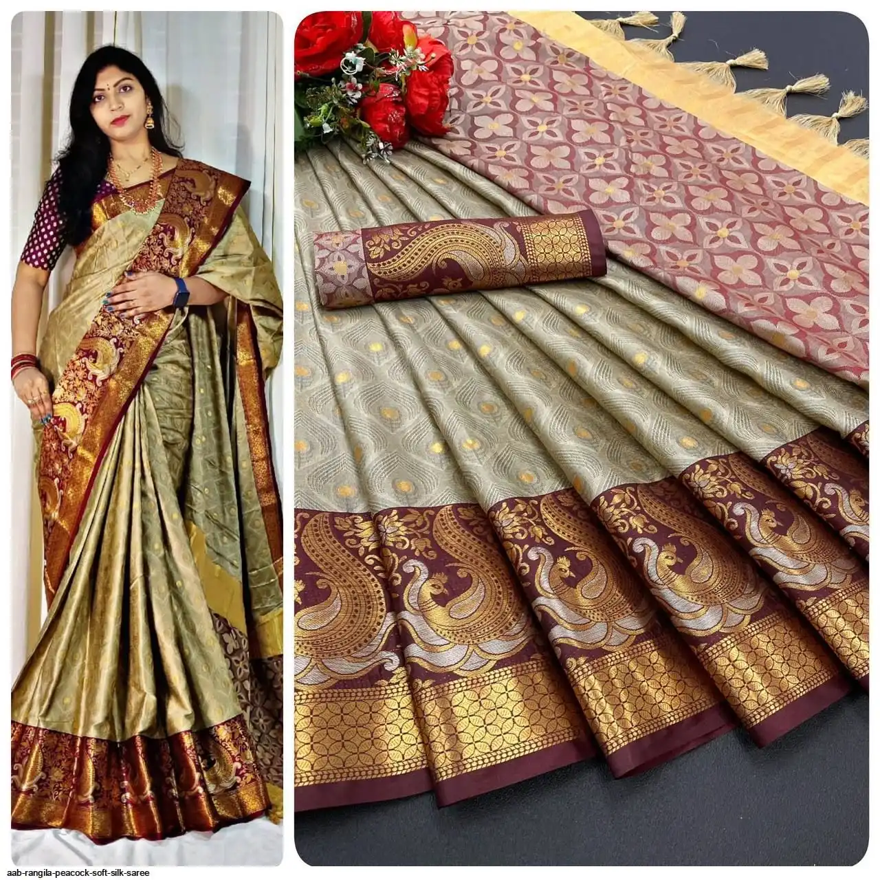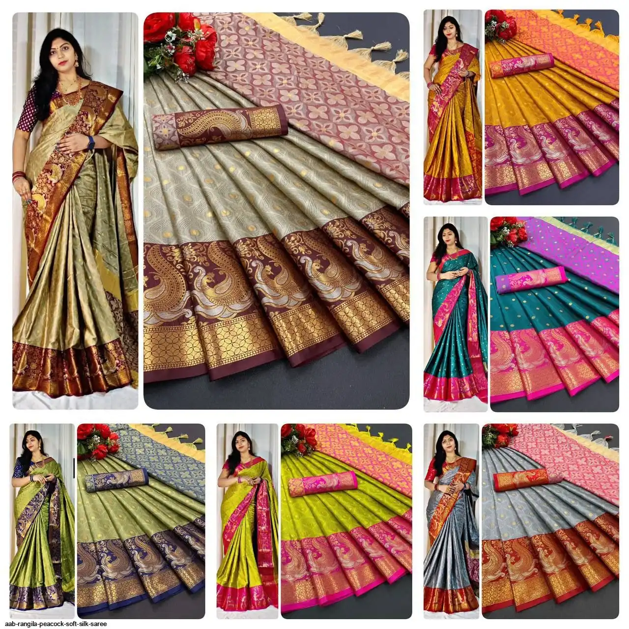 *Fabric - Pure Mercerised Soft Silk in Exclusive Border Design Minawork Silver Gold Peacock Self Viewing All Our Zari Pattern…..*