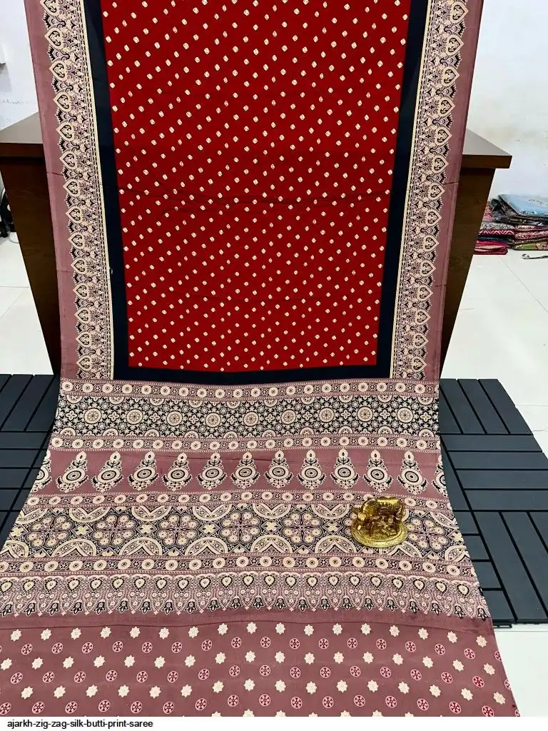 Presenting this Beautiful Ajarkh Pallu with Zig Zag Print in Luxury Modal Silk Saree with Running Blouse of Luxury Modal Silk Butti Print in Blouse