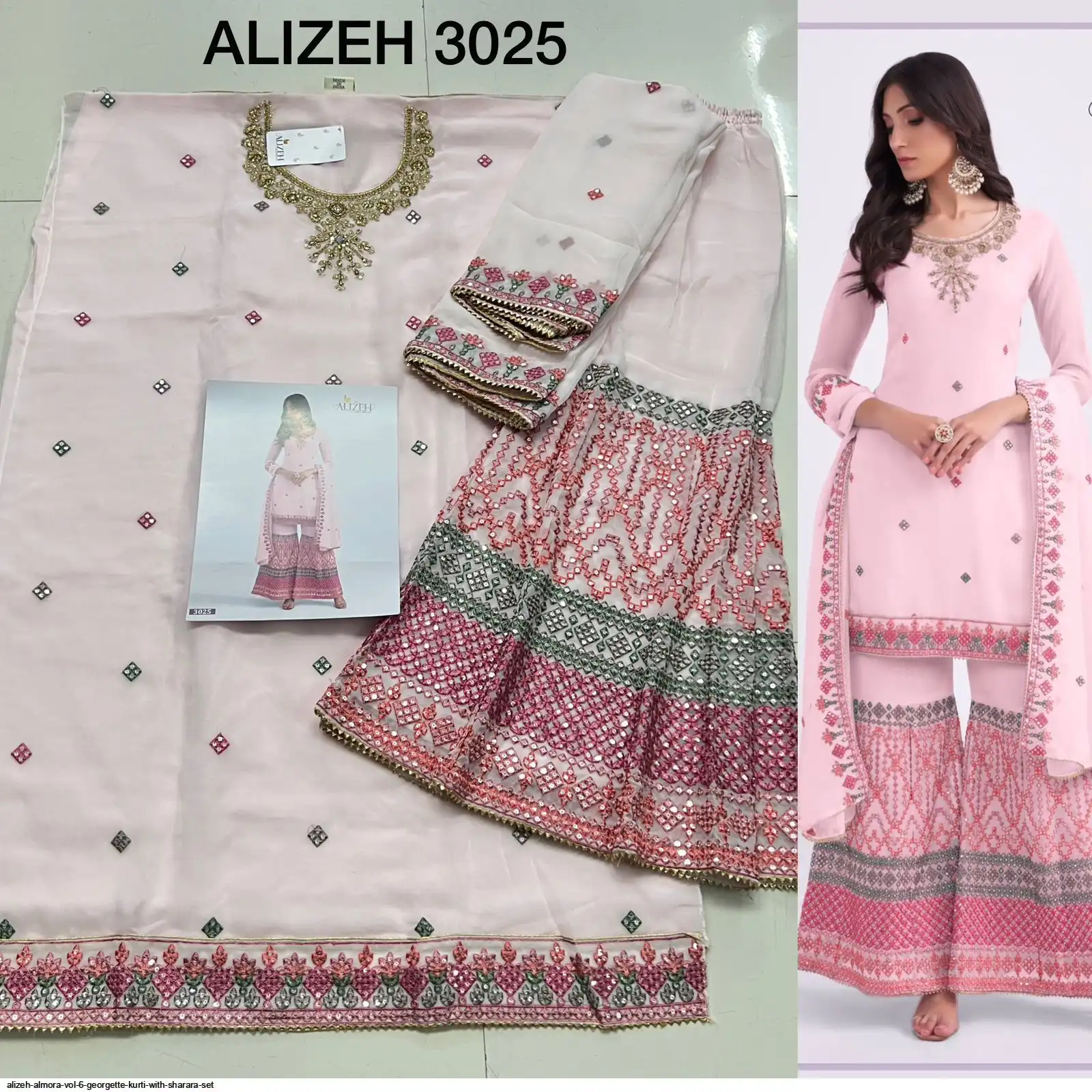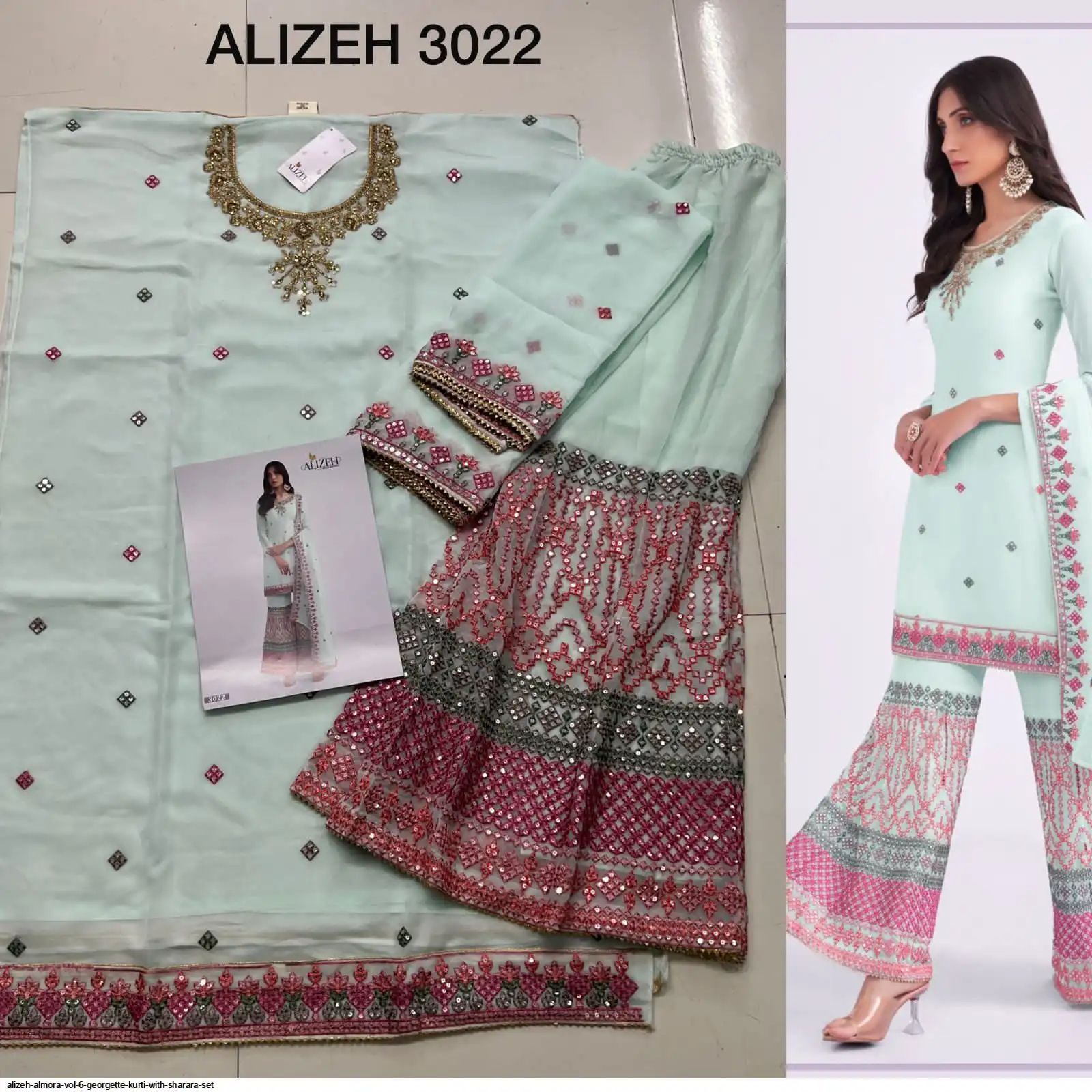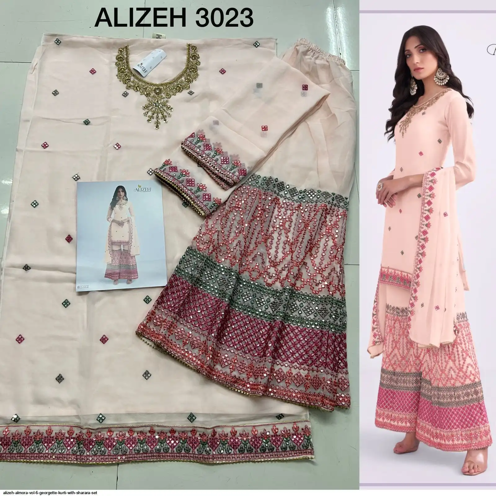 Work: The top features multi-thread, sequins, zari embroidery, and khatli work on the neckline. The sharara has heavy multicolour embroidery, and the dupatta has a two-side border and butti embroidery.