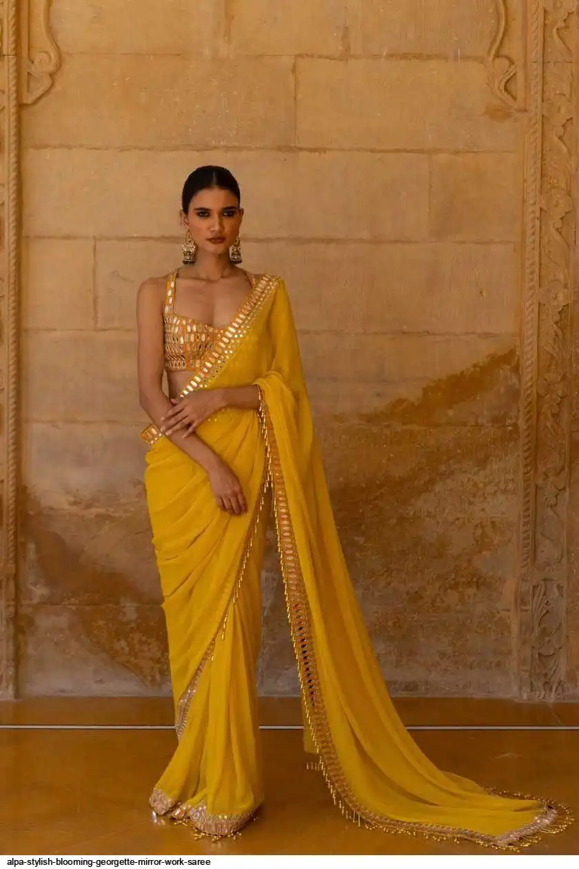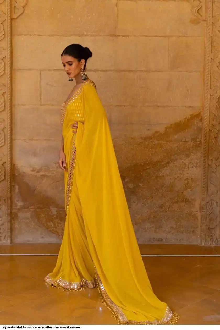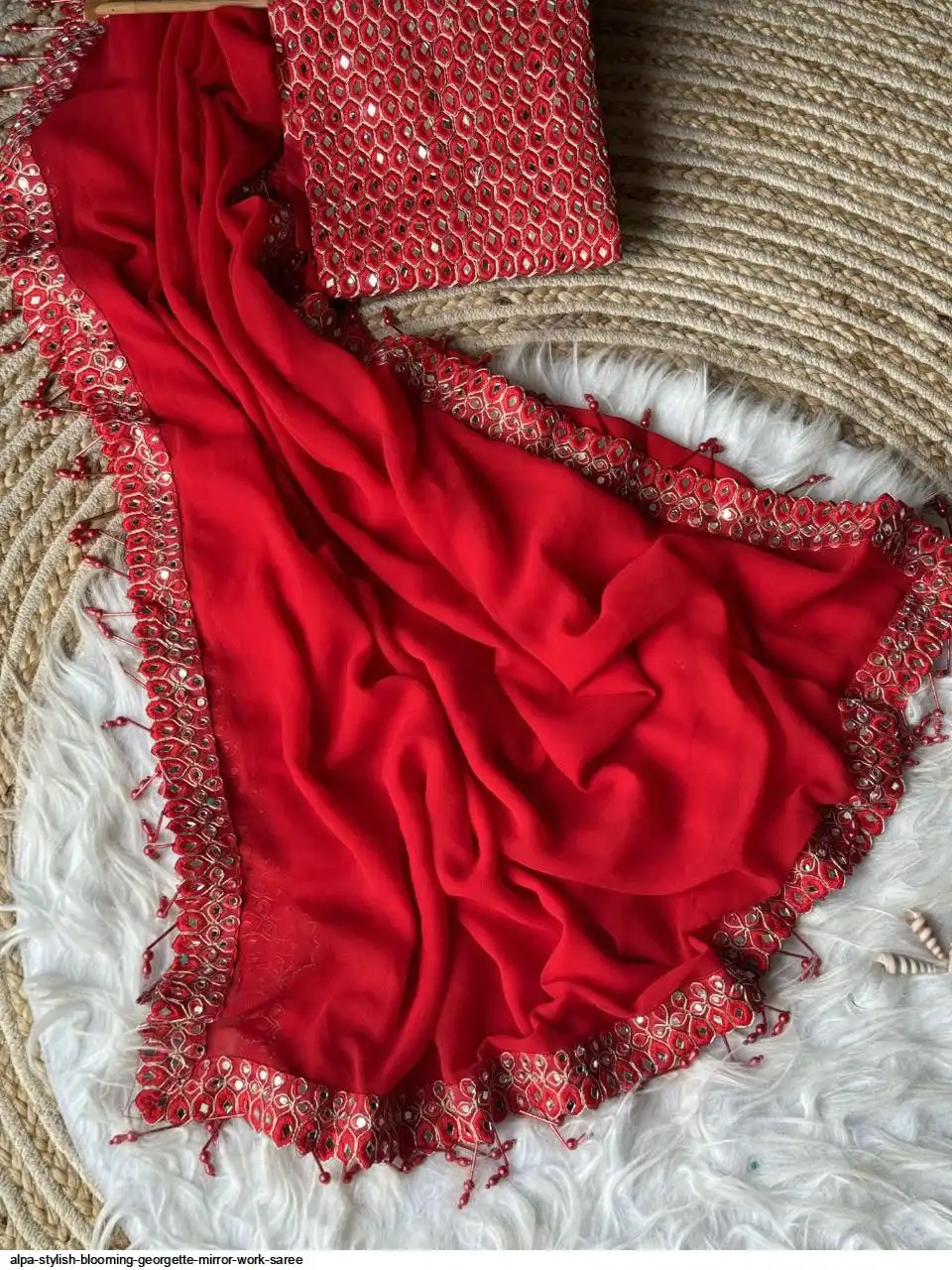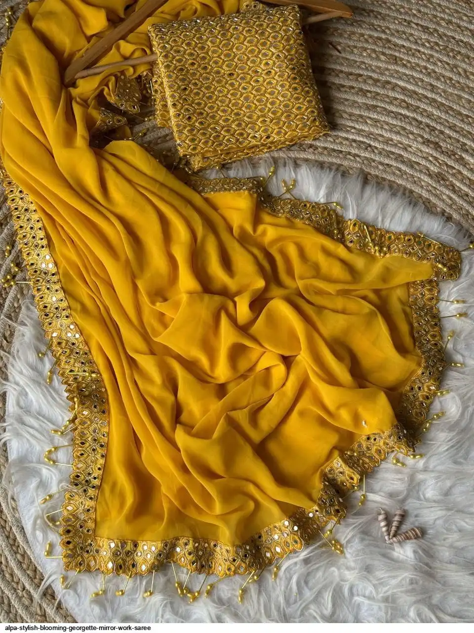 Fabric: PURE BLOOMING GEORGETTE FABRIC SAREE EMBROIDERED WITH HEAVY MIRROR WORK AND LATKANS