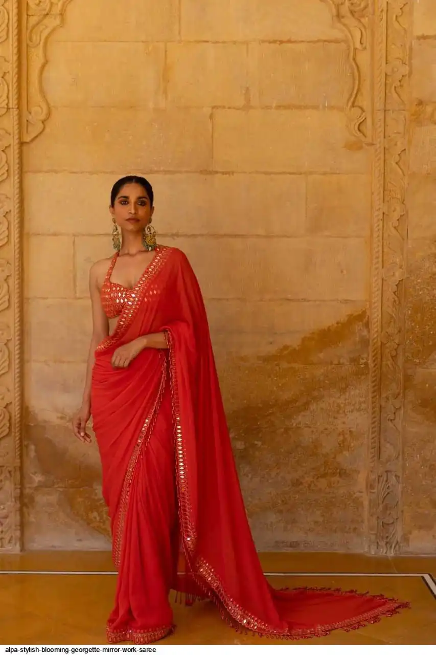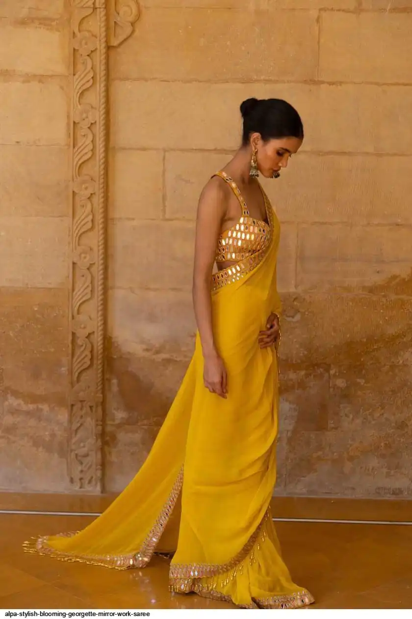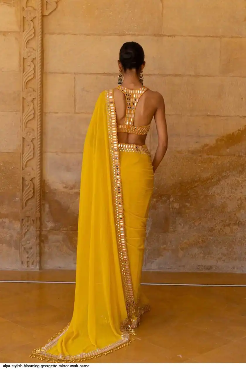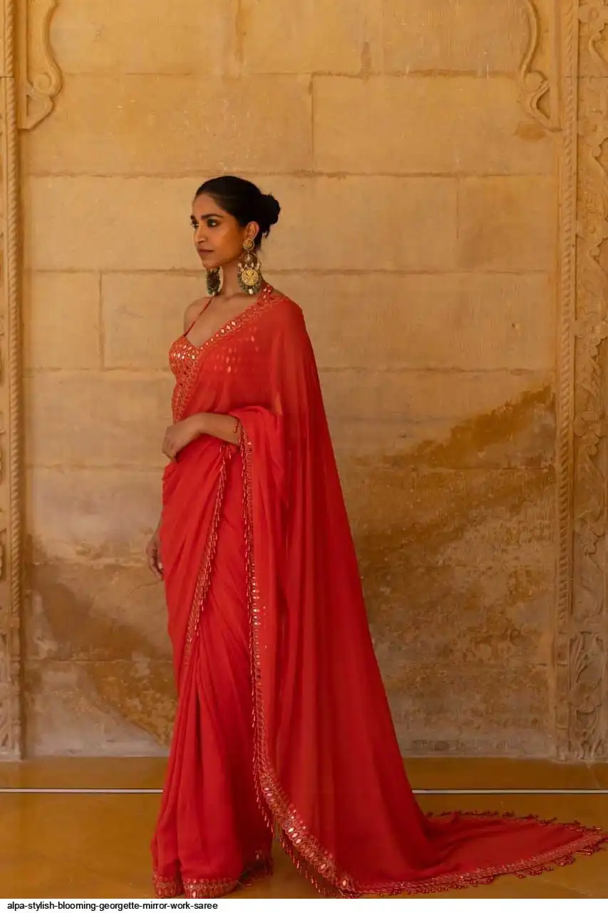 Fabric: PURE BLOOMING GEORGETTE FABRIC SAREE EMBROIDERED WITH HEAVY MIRROR WORK AND LATKANS