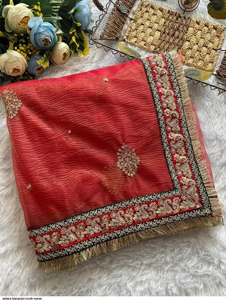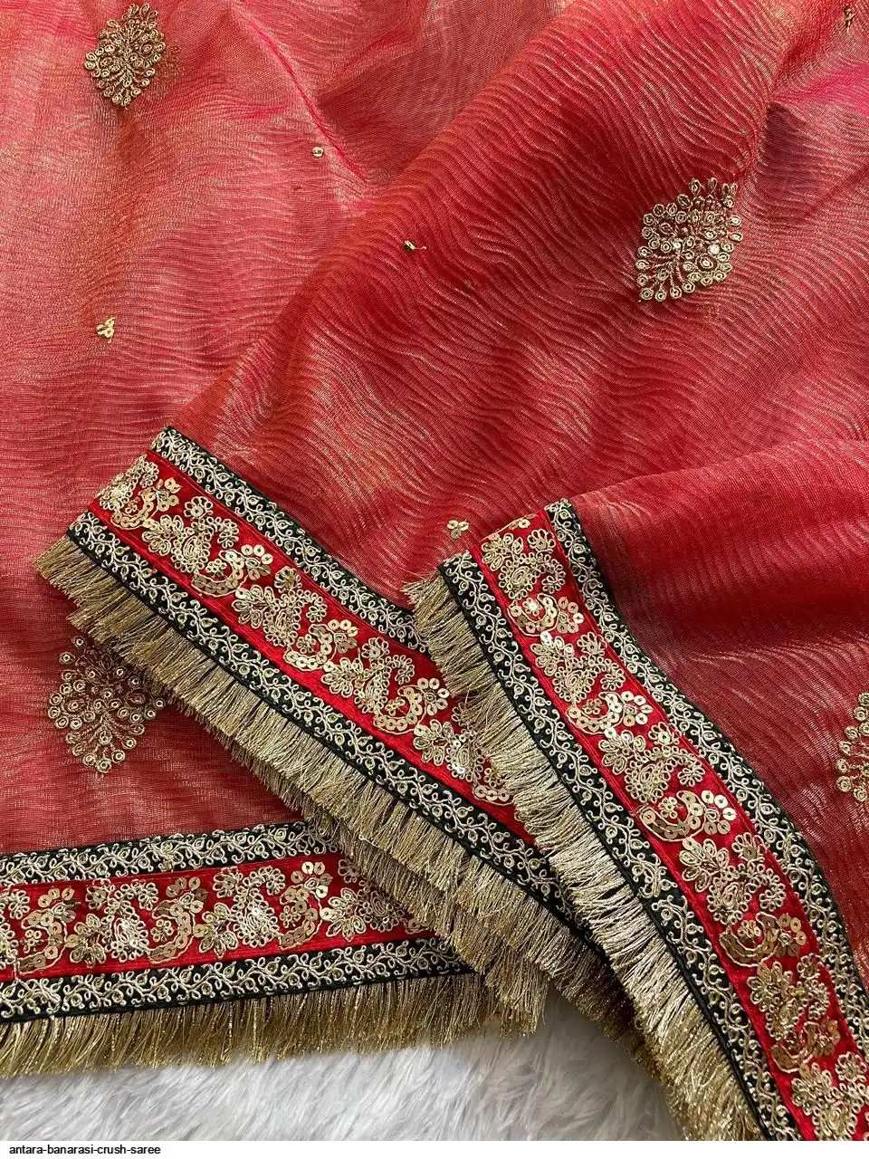 SAREES FABRICS:-Banarasi Crush with embroidery work butta of Hari thread and 3 mm /5mm sequins with zari Dori embroidery work lace on the border
