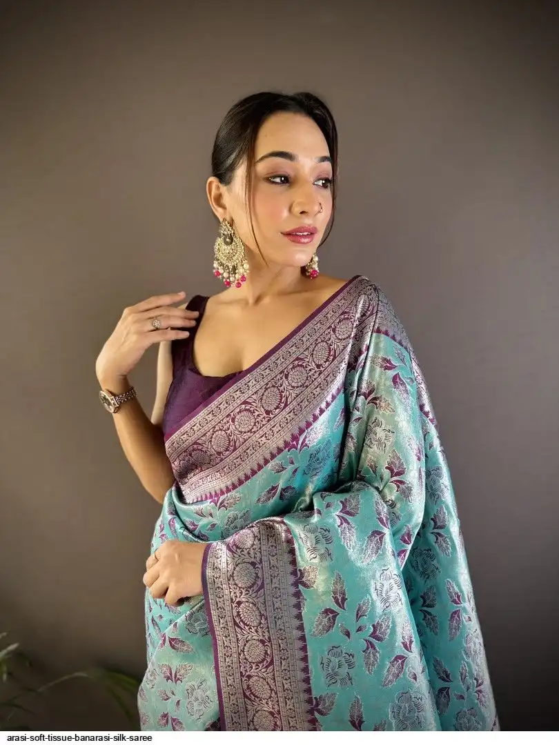 Exult this festival/wedding season with these incredible weaved pure Soft Tissue Banarasi silk sarees, that is high in quality and weaving all over the body with Zari work And majestic contrast Flower Zari Design Print and royal Ombre kinda pallu.