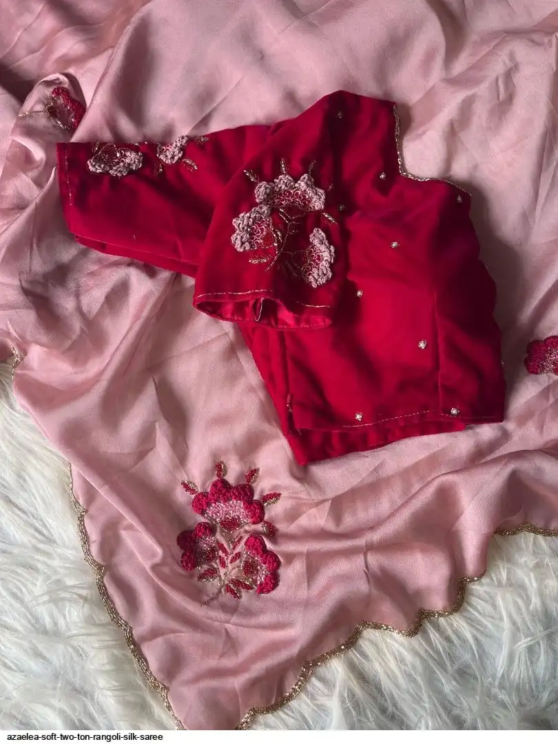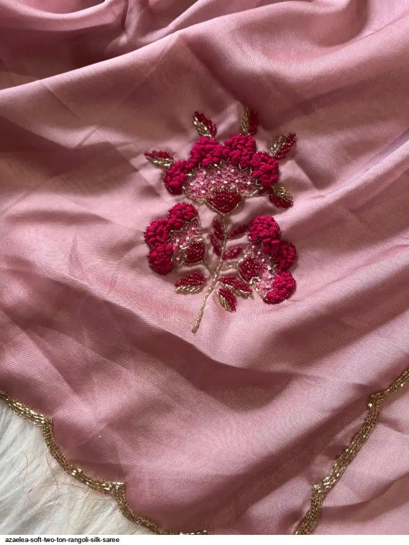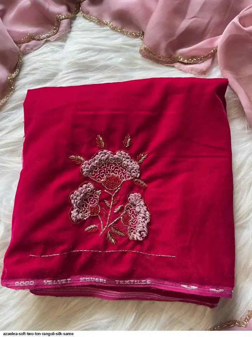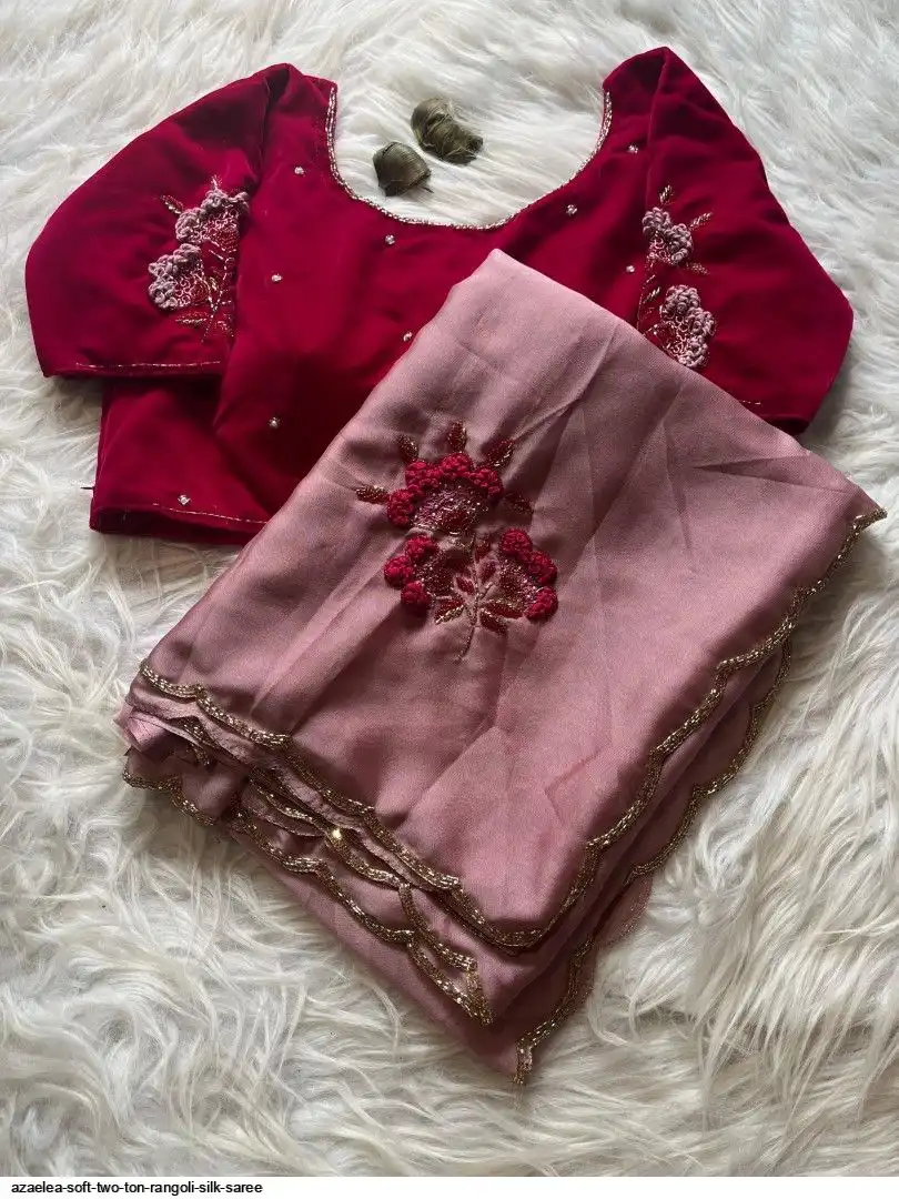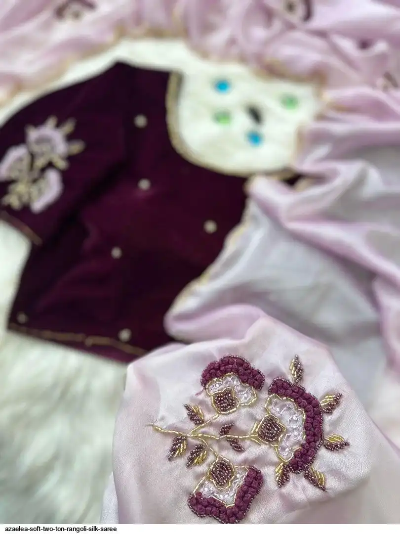 Soft Two Ton Rangoli Silk Cover With Three Layer Cutdana Border And Double Layer Arco Border Having Butta All Over Saree Run With Cutdana, Moti And Resham Thread