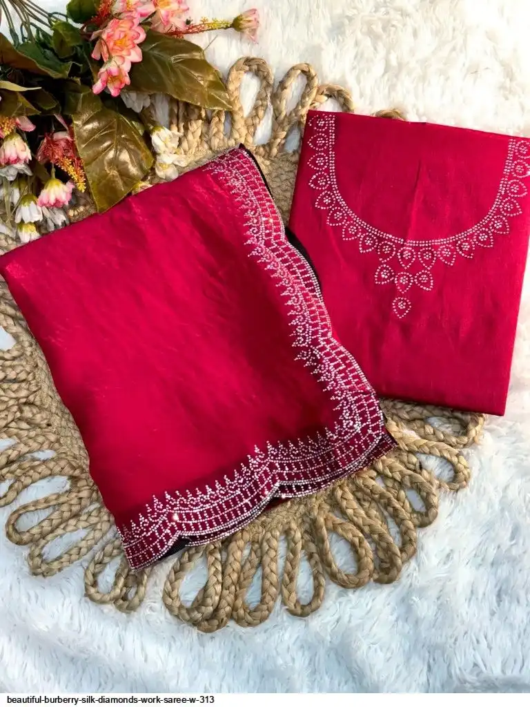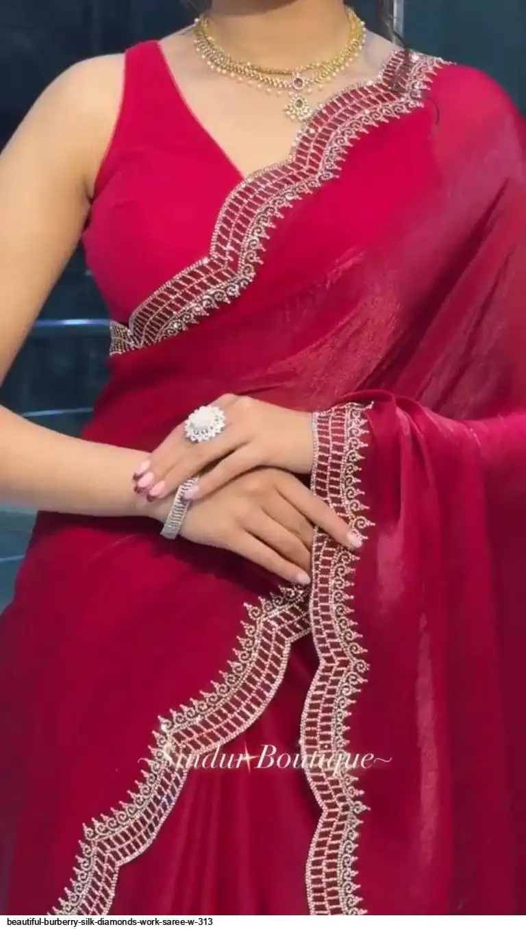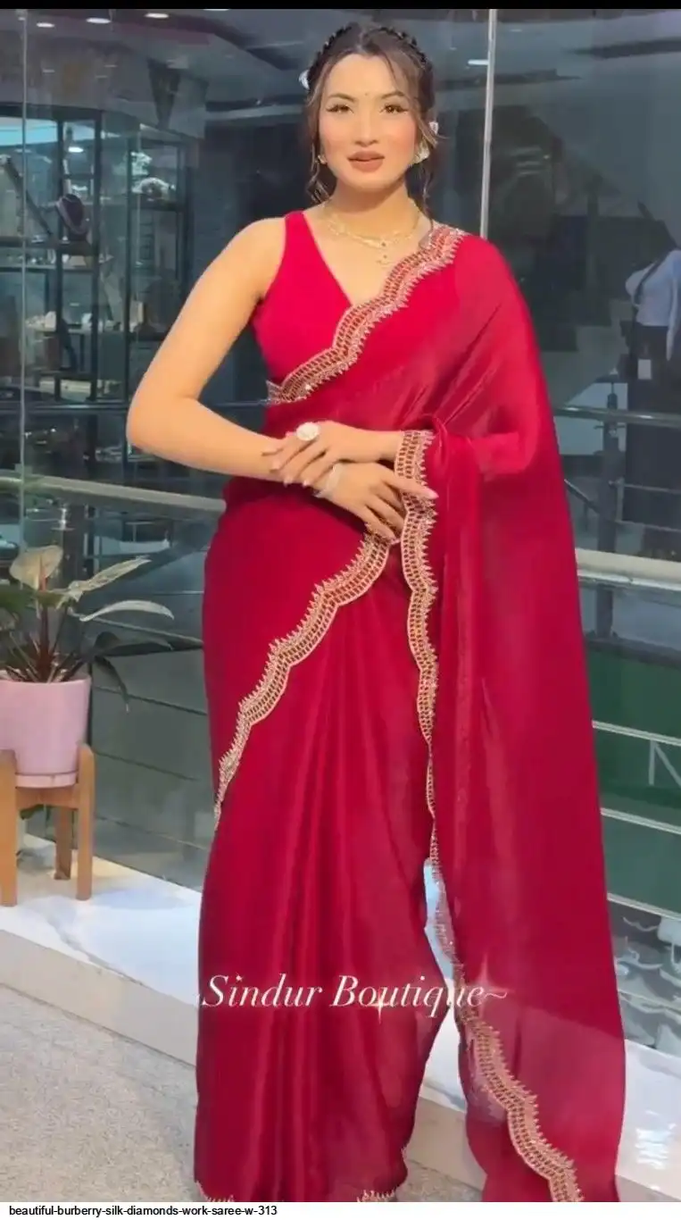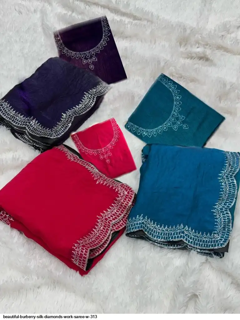 SAREE DETAILS :- Pure Soft Burburry Silk With Beautiful Sirovski Diamonds Work In Border On All Over Saree (5.50 Cut)