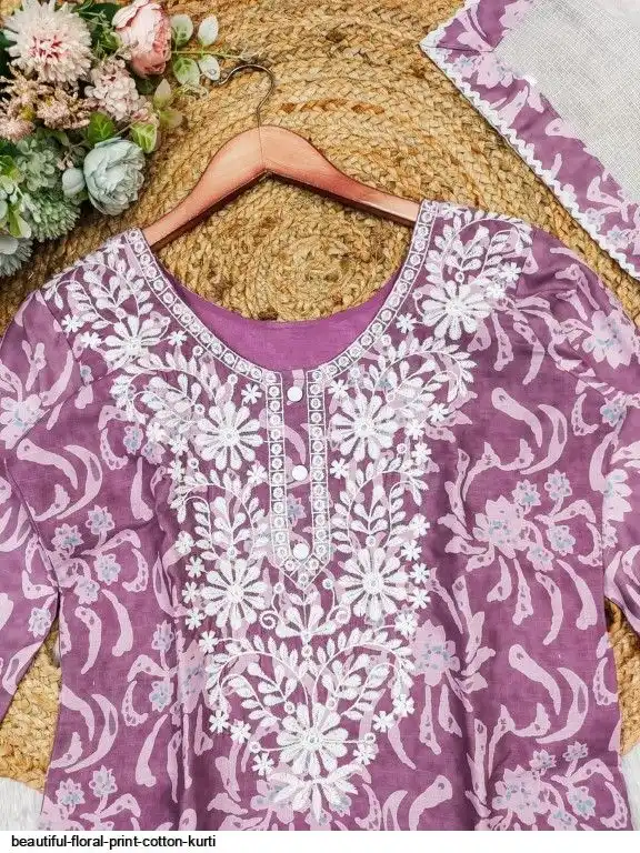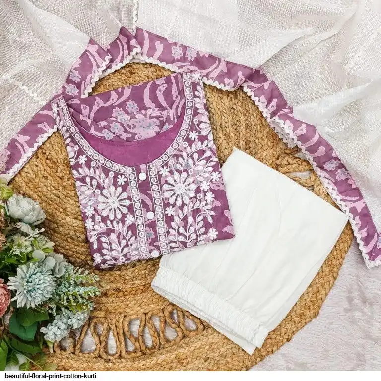 This outfit is perfect for casual outings or festive summer events, combining vibrant prints and intricate embroidery with comfortable fabrics.