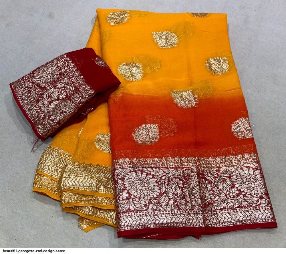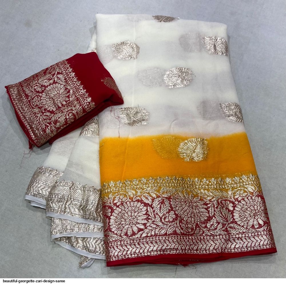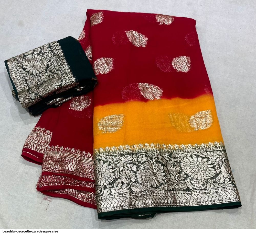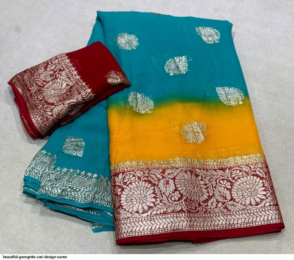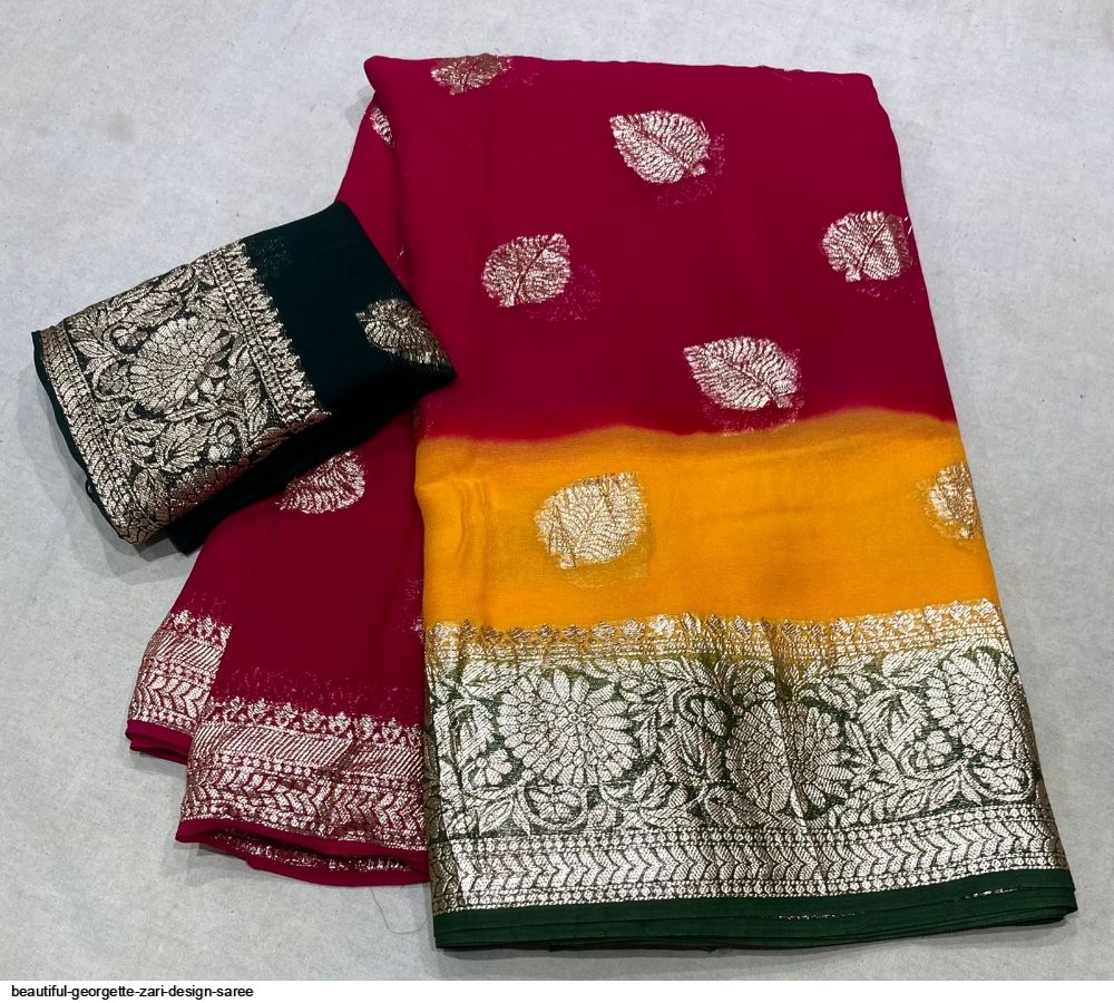 *Pure GEORGETTE fabric with beautiful 3 patta 3 shades daing all over and hand Malty daing zari heavy running bp supper*