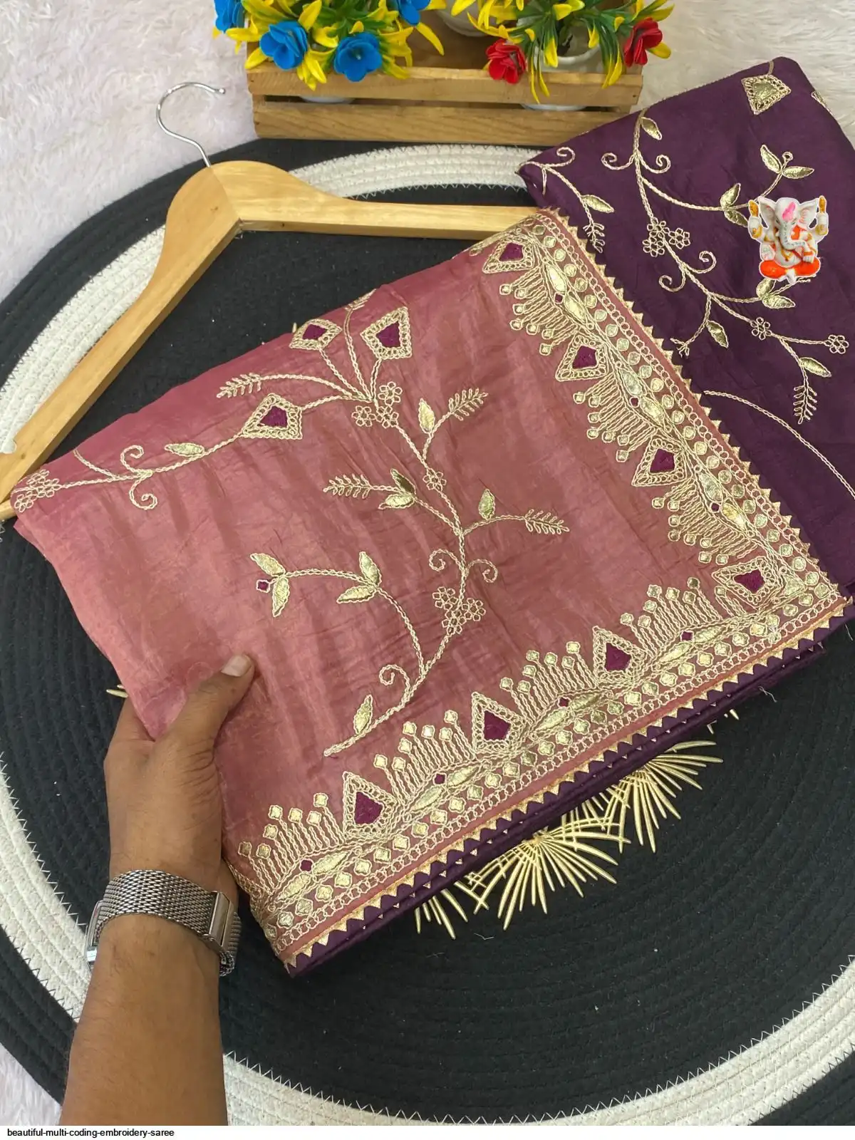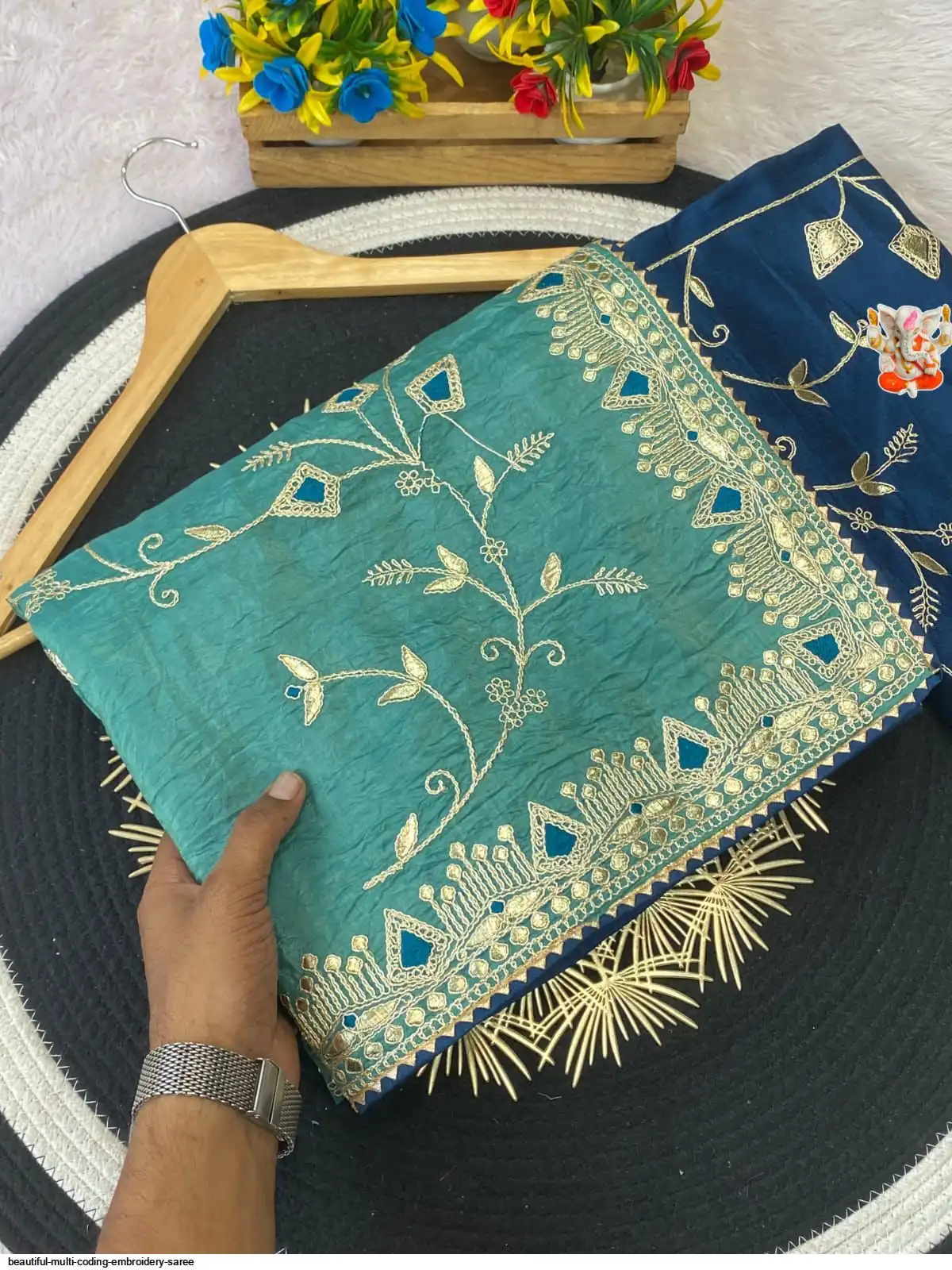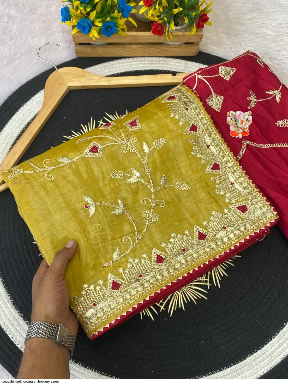 Beautiful multi coding Daga & gota embroidery work Boder designer saree with c pallu work and jaal all in saree..
