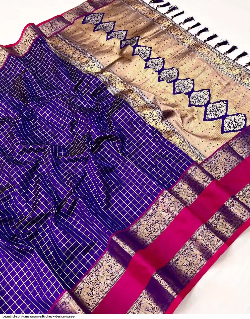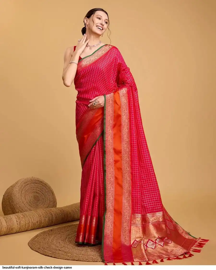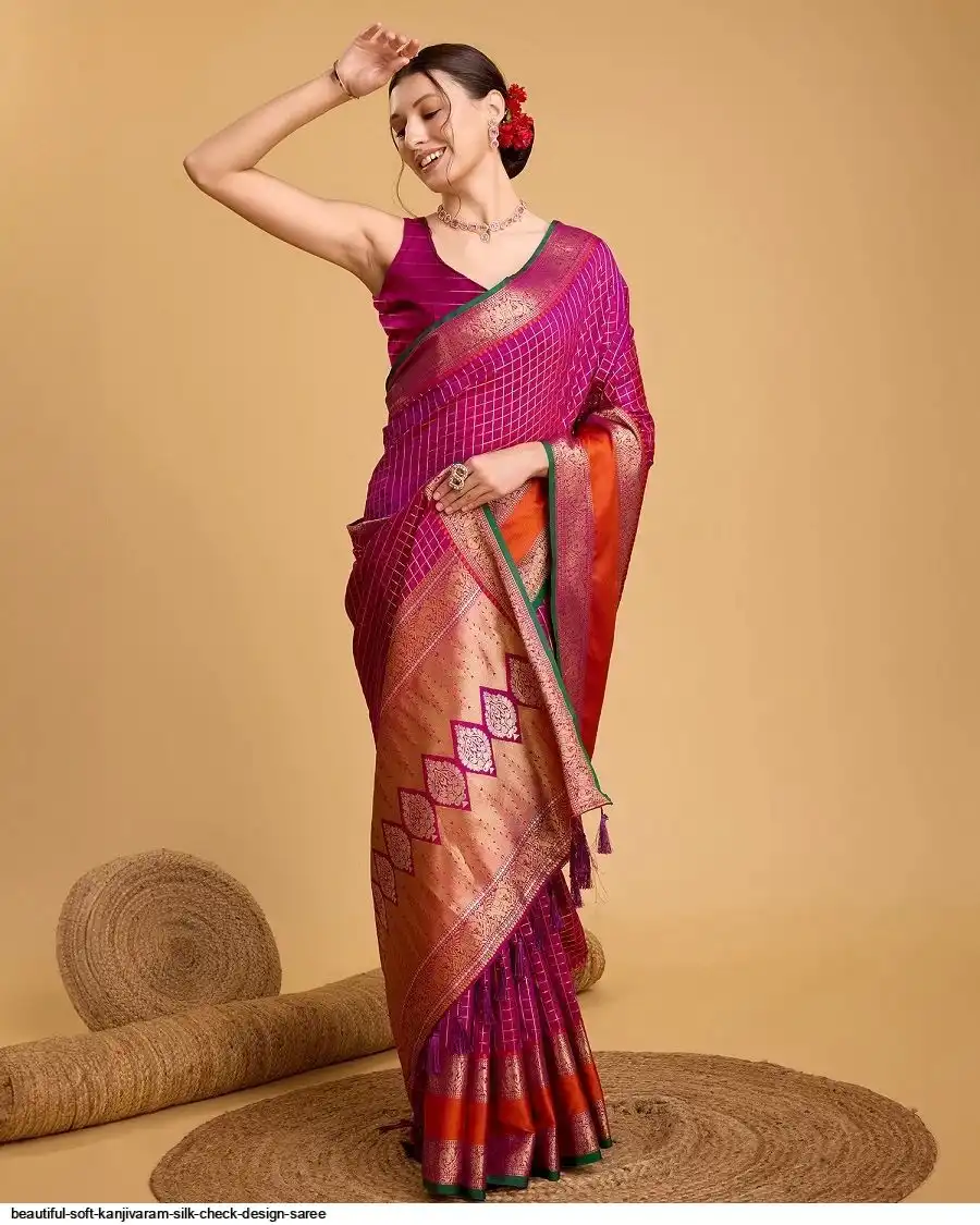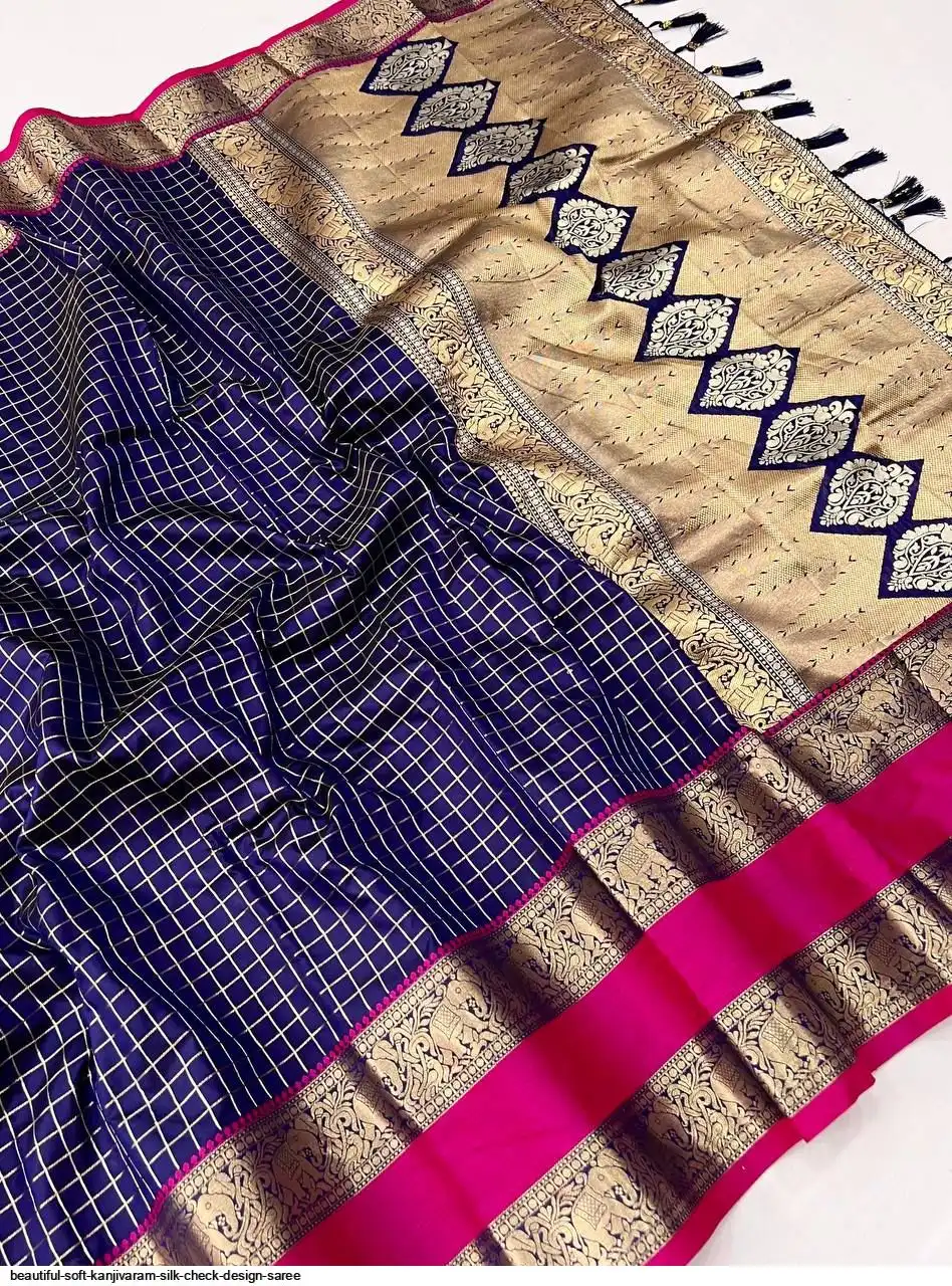 Saree :- Soft Kanjivaram silk saree with zari weaving chex design all over the saree & Zari weawing Rich pallu with contrast weawing border & Tassels attched at Pallu end.