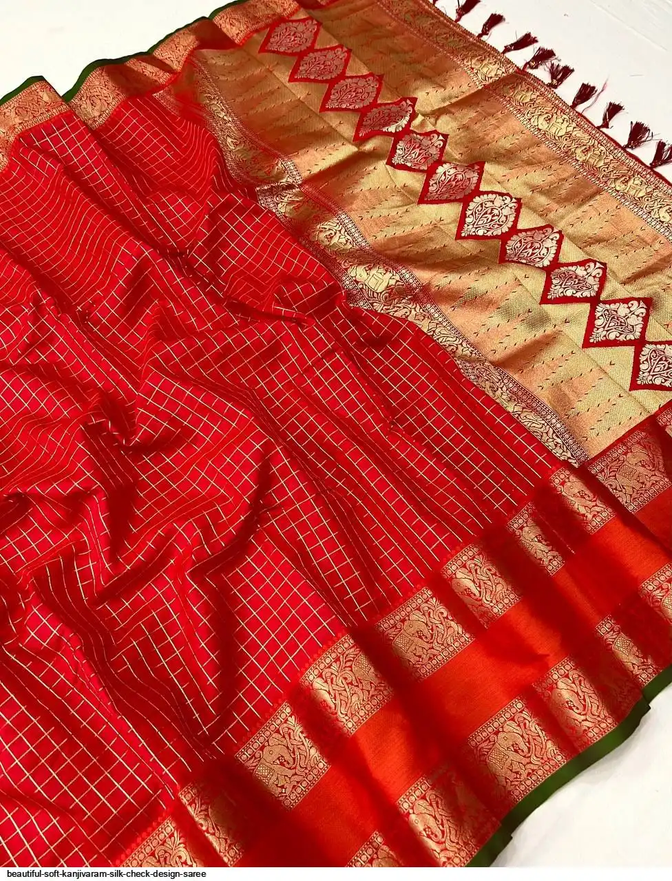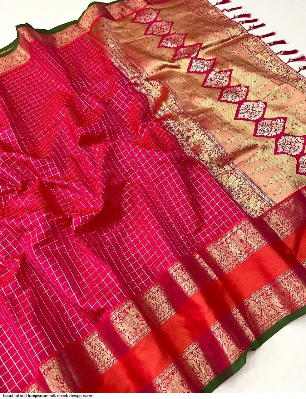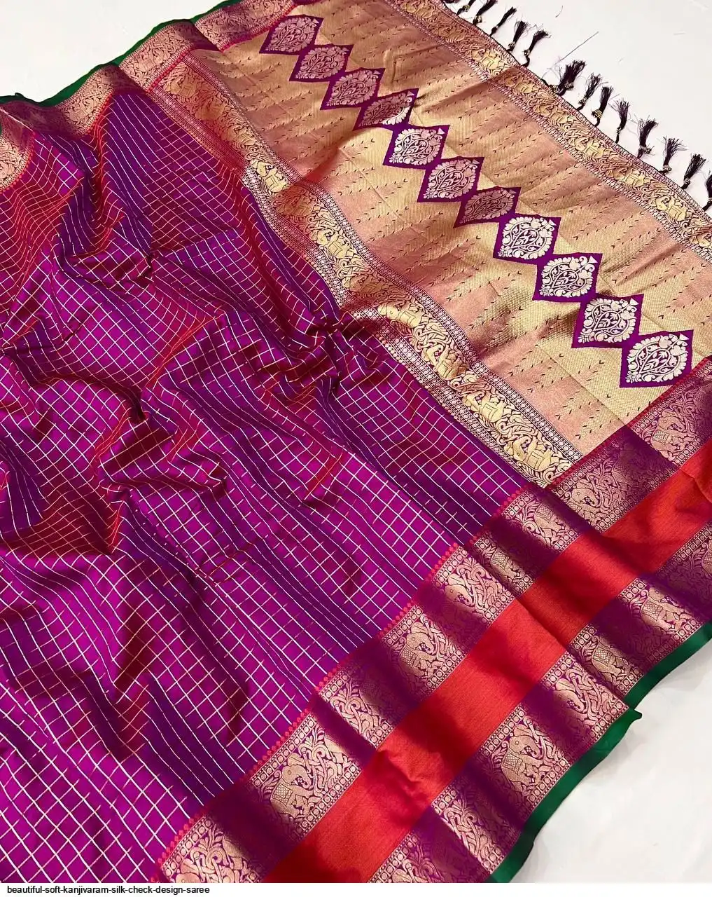 Saree :- Soft Kanjivaram silk saree with zari weaving chex design all over the saree & Zari weawing Rich pallu with contrast weawing border & Tassels attched at Pallu end.