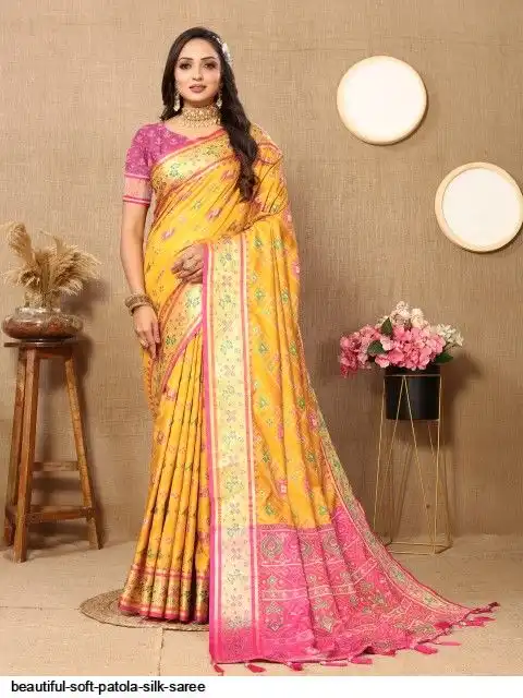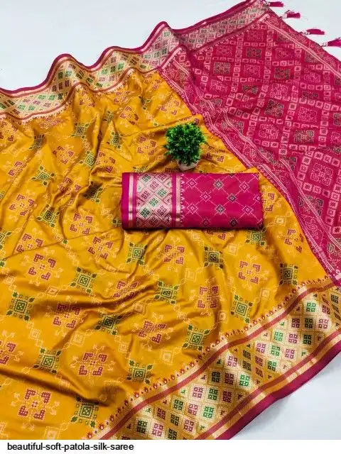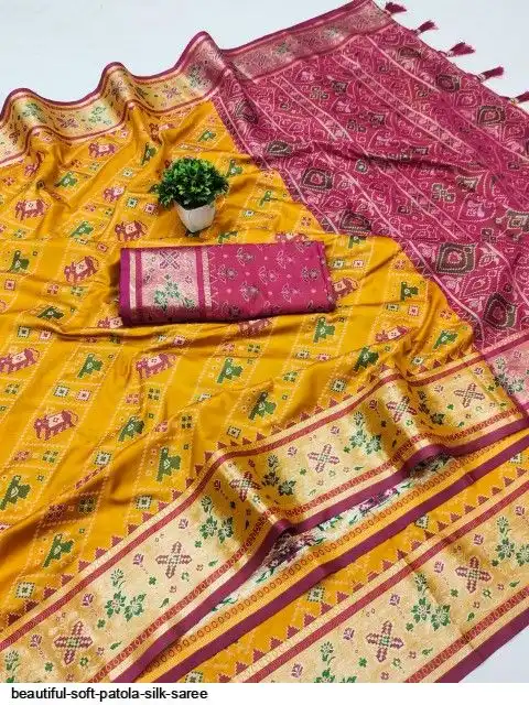 Saree :- Soft Patola silk saree with zari weaving Meenakari design all over the saree & Meenakari weawing Rich pallu with Meenakari weawing border & Tassels attached at Pallu End.