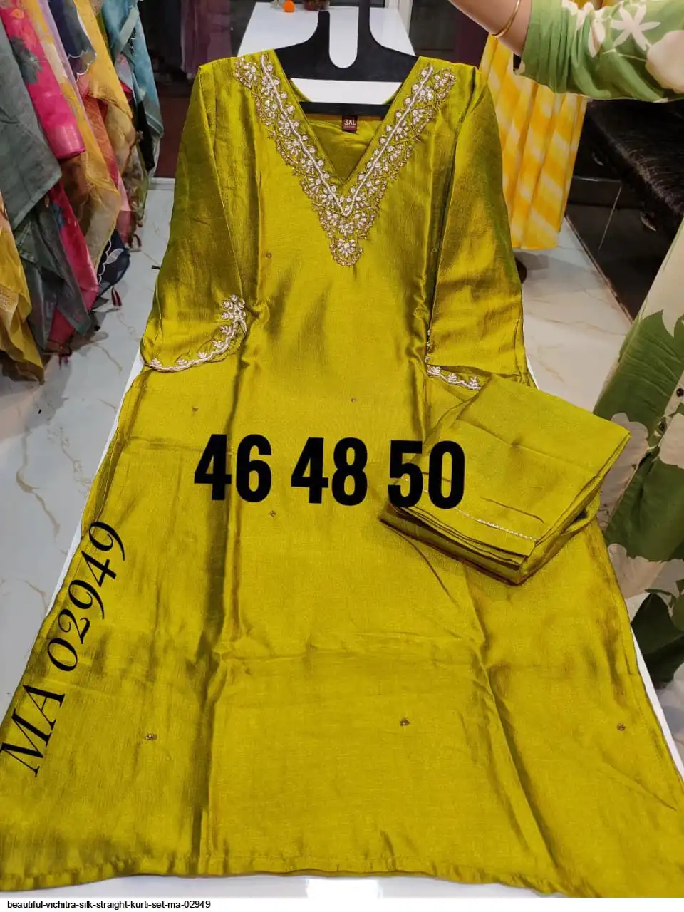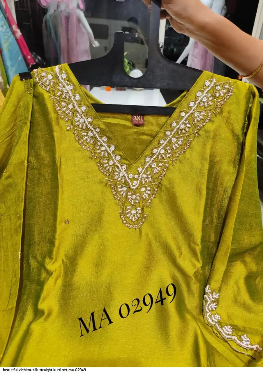 top - vichitra silk beautiful straight kurti with moti cutdana on yoke and sleeves