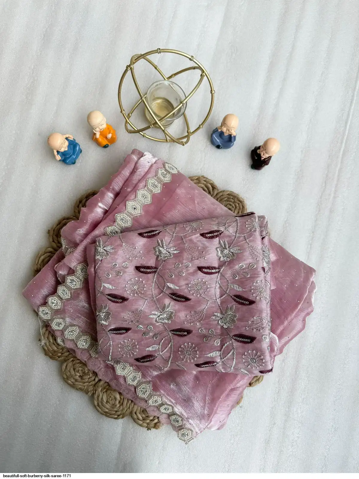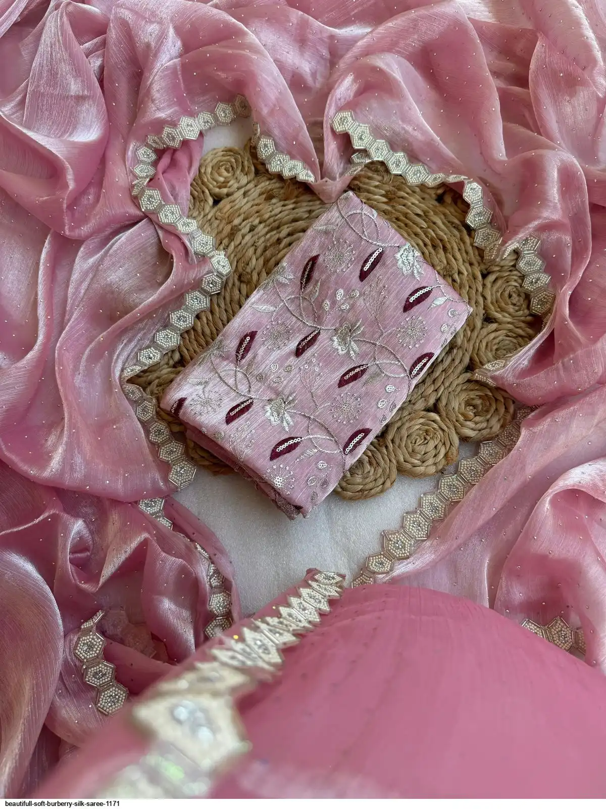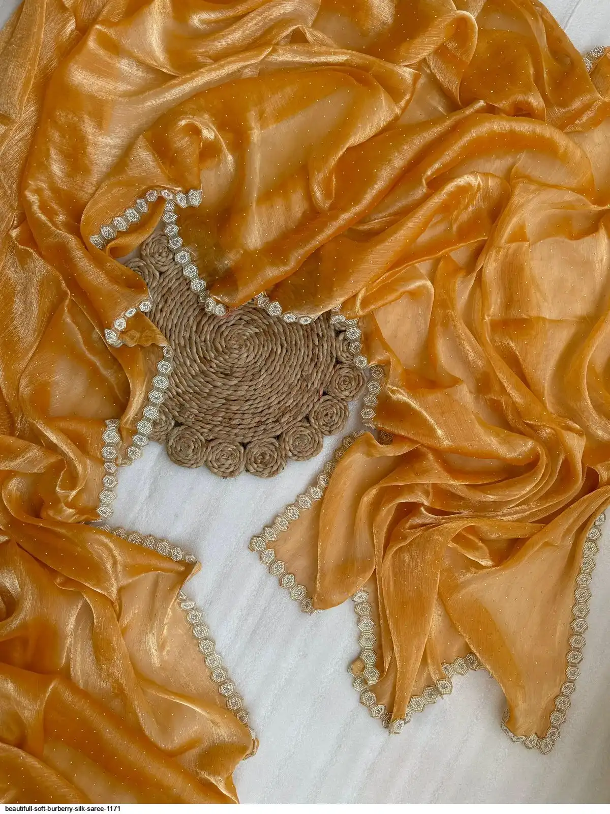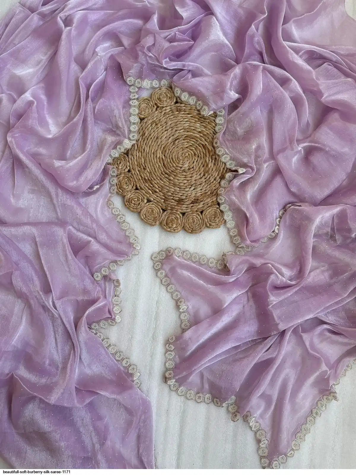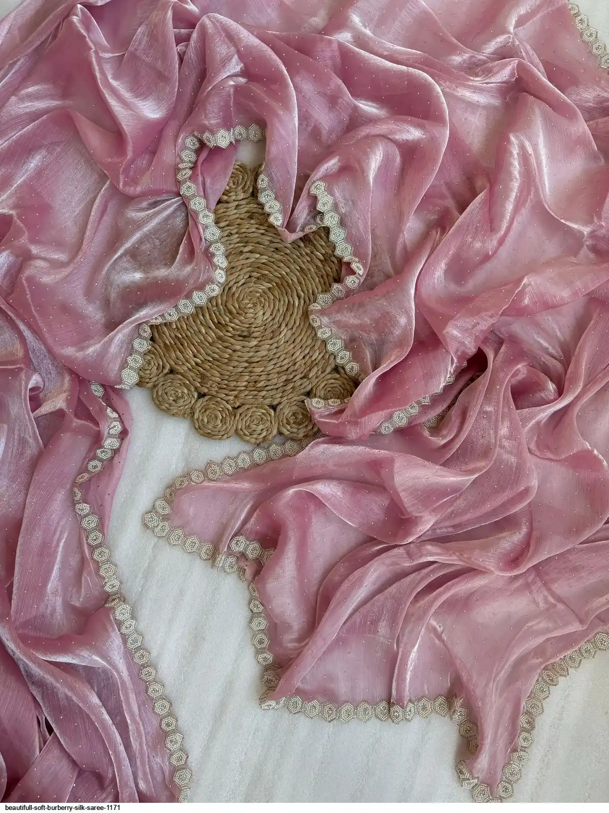 Primium Soft Burberry Silk Dusty Color with Pure Jarakn Lace Border and All over Sirvoski Diamond in Saree