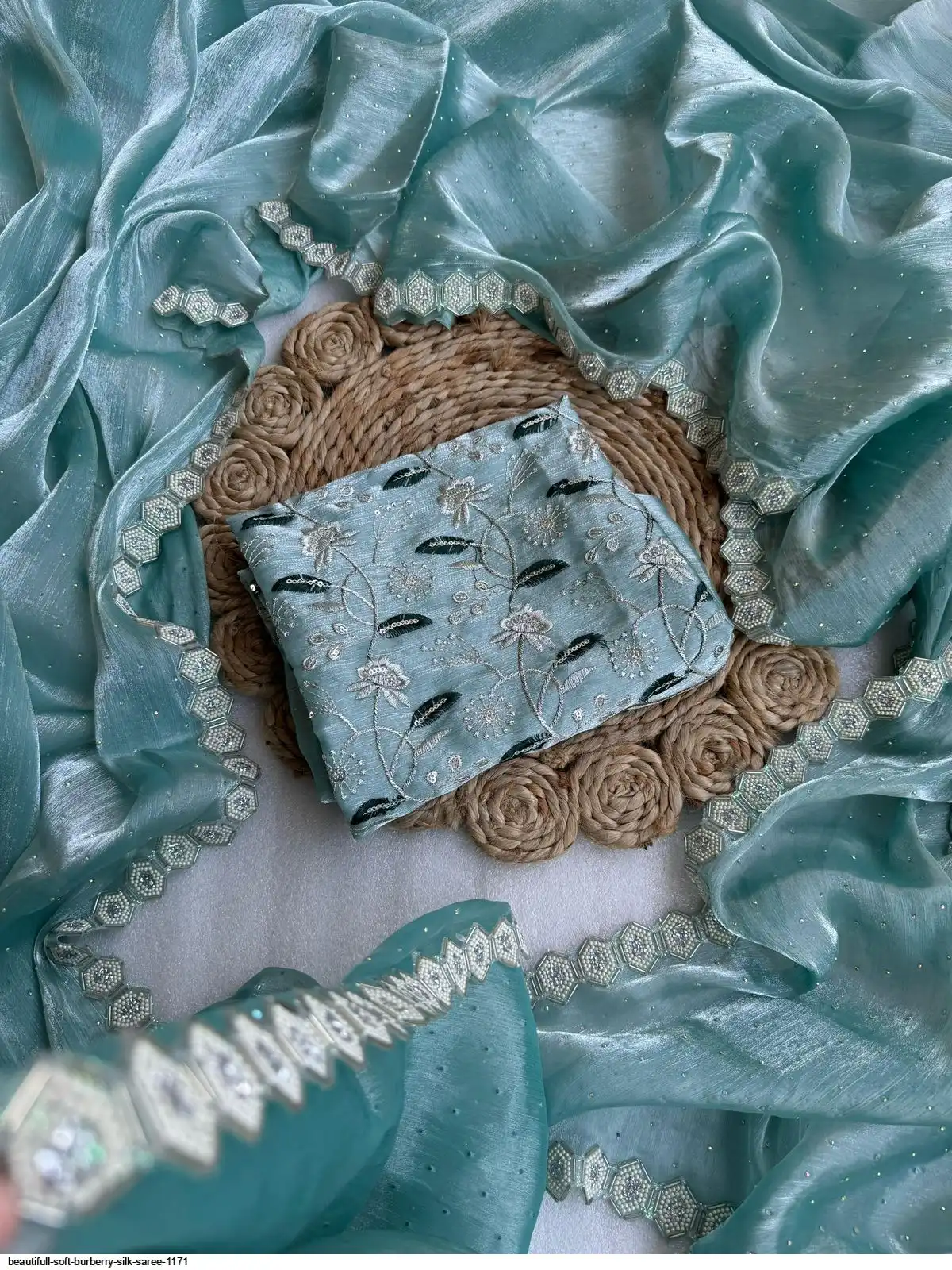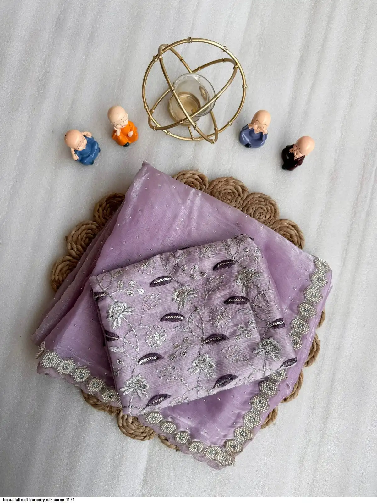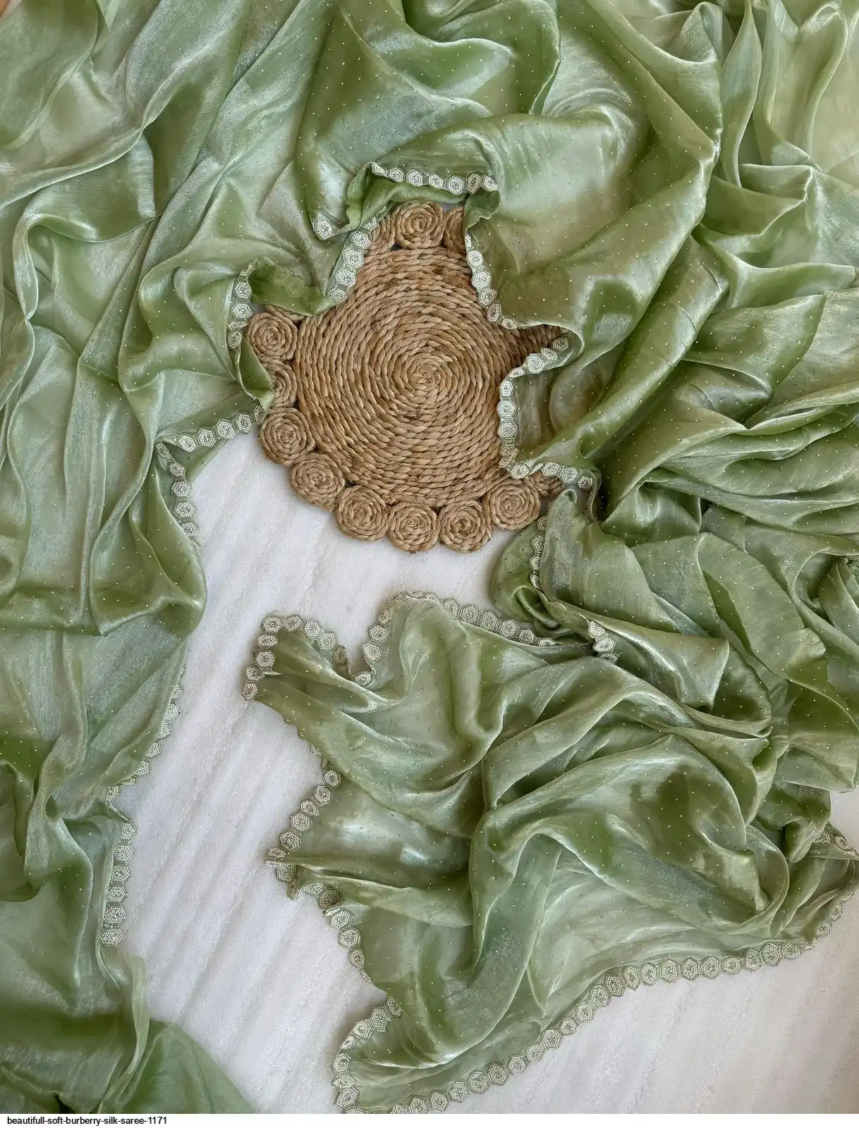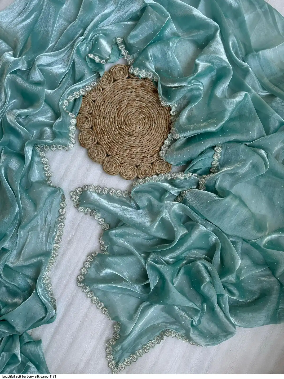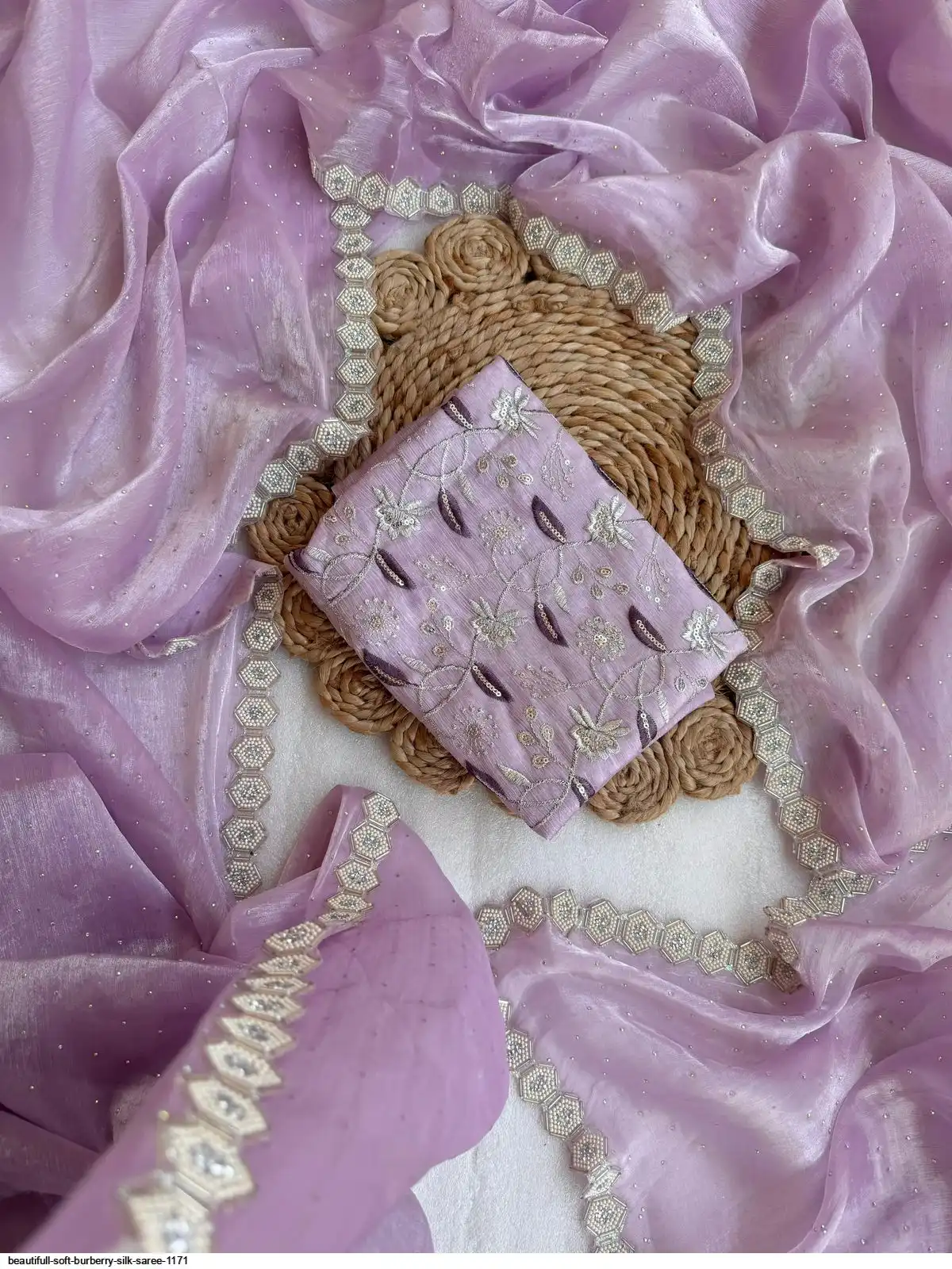 Primium Soft Burberry Silk Dusty Color with Pure Jarakn Lace Border and All over Sirvoski Diamond in Saree