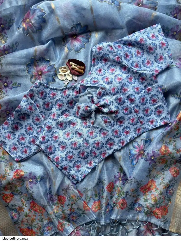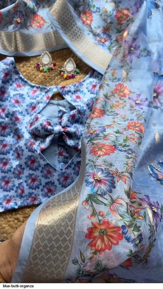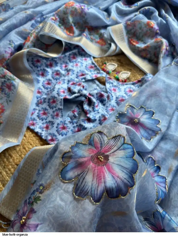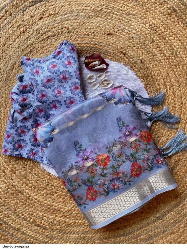 ❤️ *BEAUTIFUL SOFT BUTTI GOLD BORDER ORGANZA SAREE WITH DIGITAL PRINT AND CUT-DANA AND MOTI HANDWORK..WITH FRILL COMES IN PALLU SIDE…!!! UNSTITCHED DIGITAL PRINT MONO BANGLORI SILK BLOUSE*