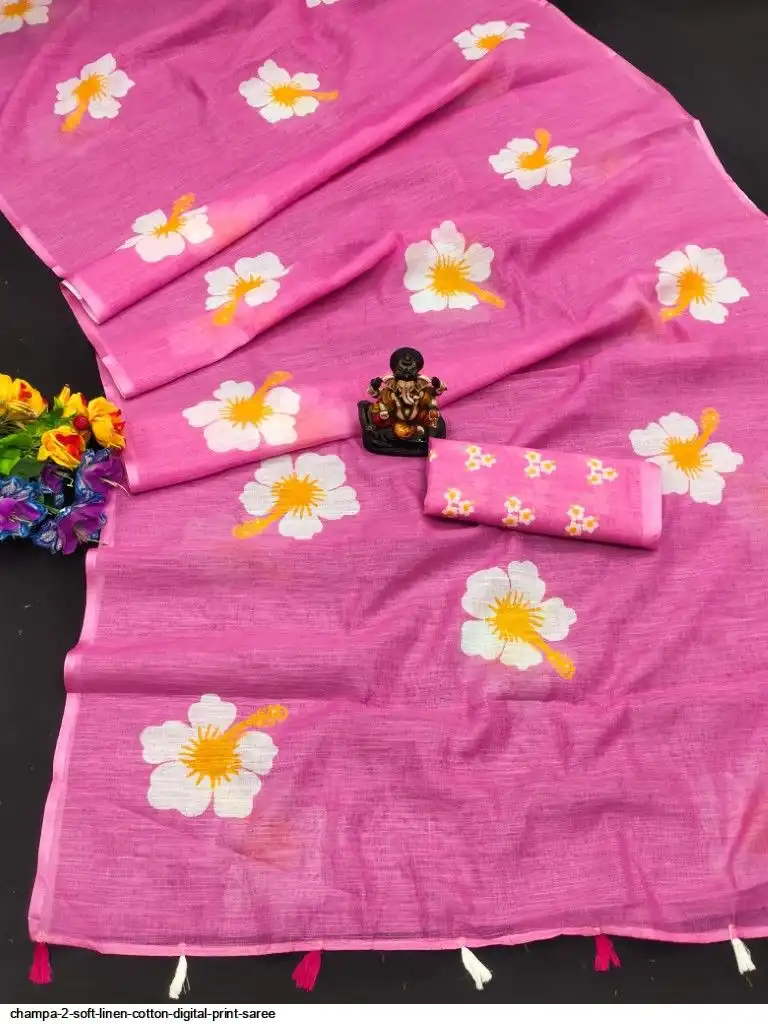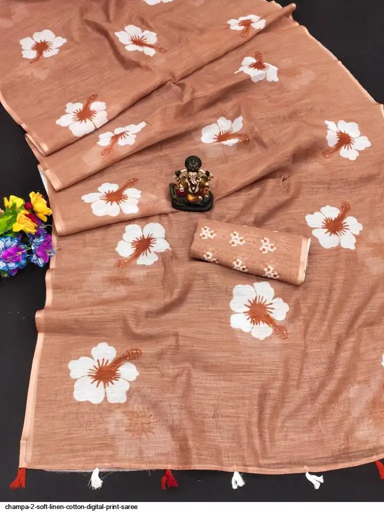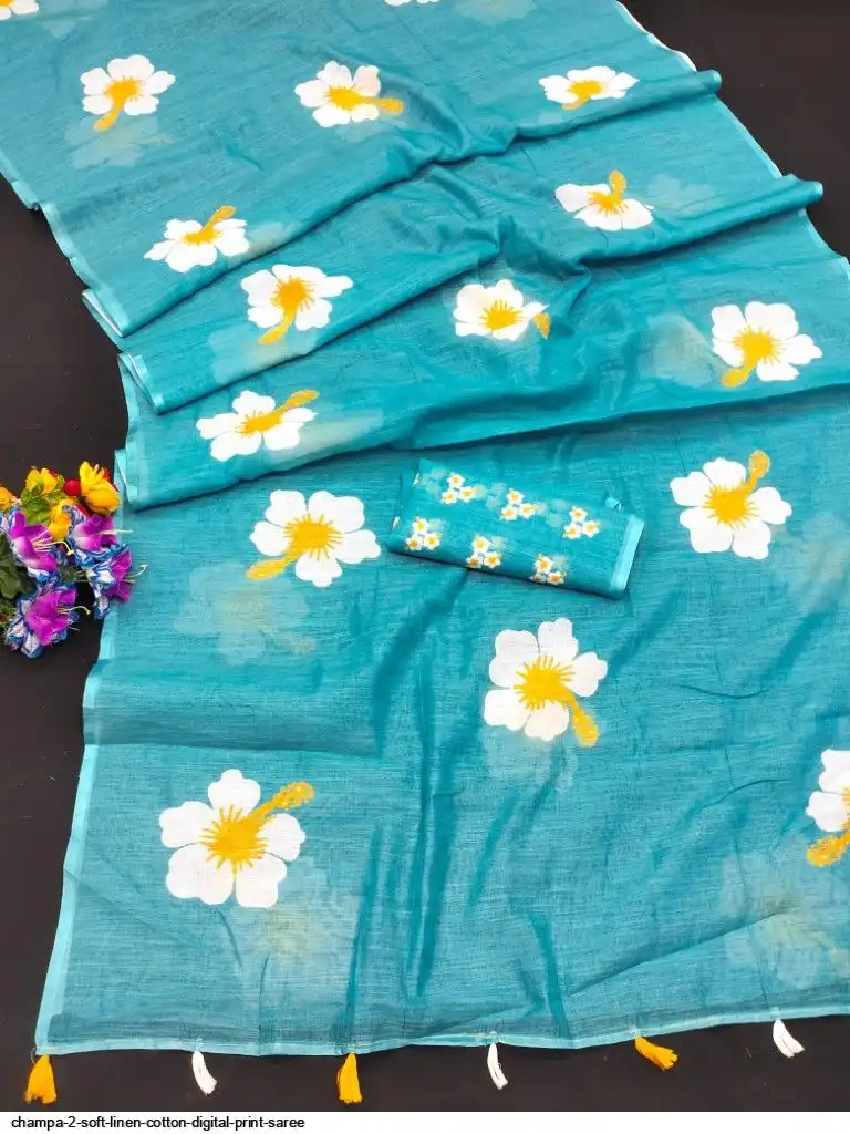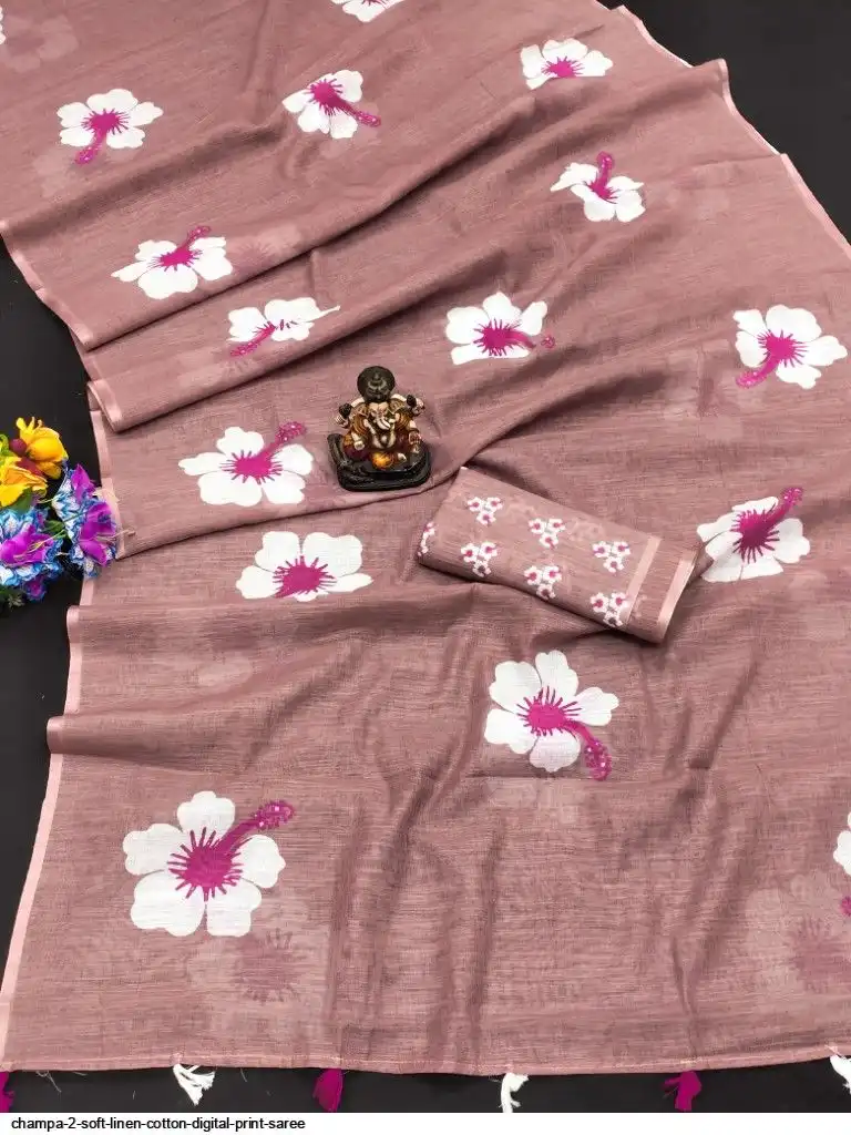 The Very Premium And Rich Quality Soft Linen Cotton Digital Print Sarees With Flower Print All Over The Body And Printed Pallu