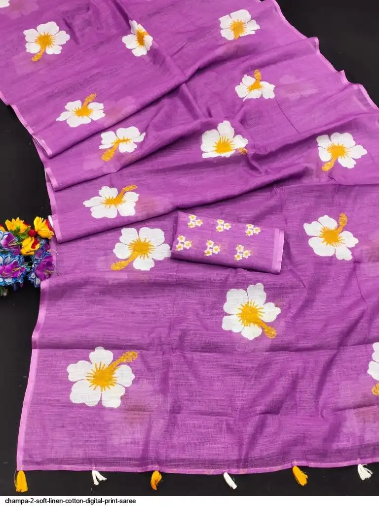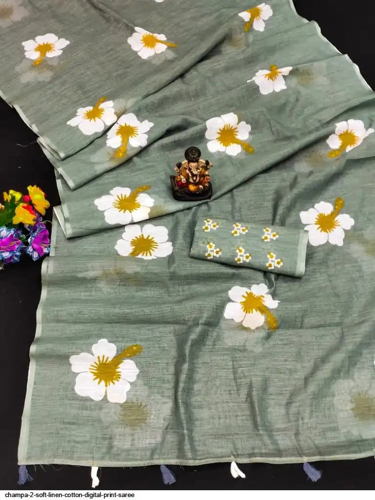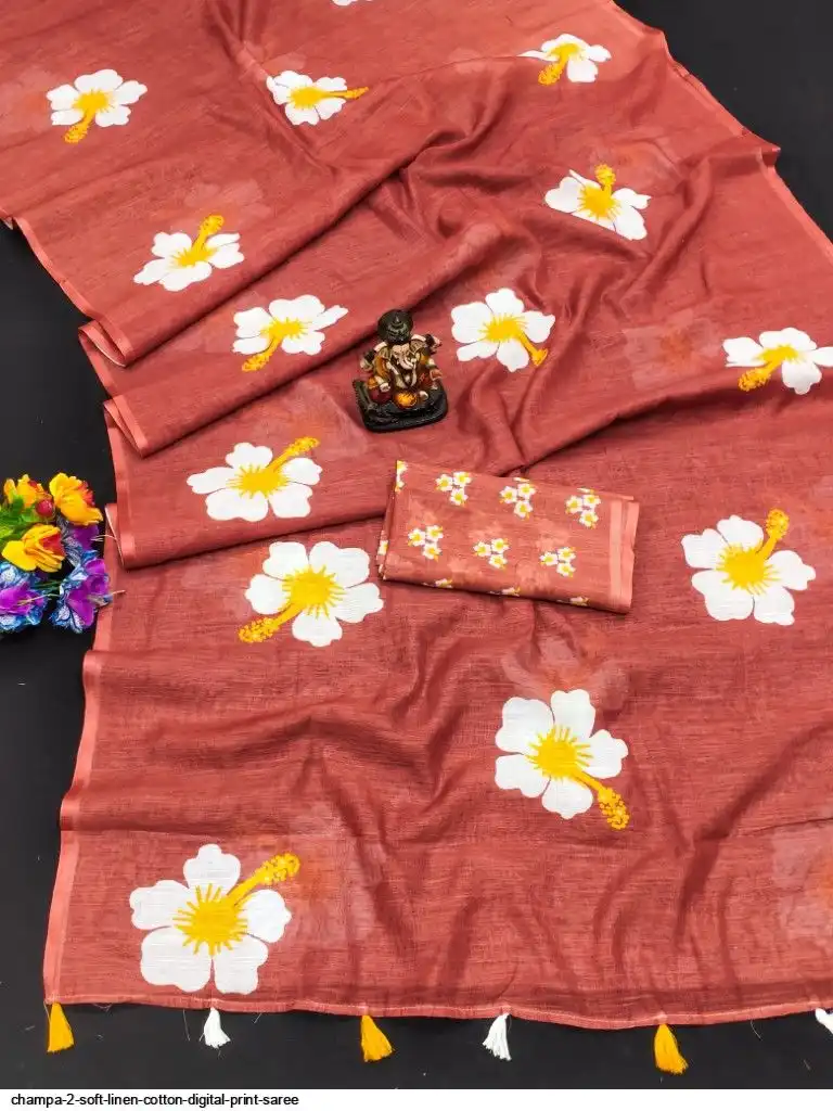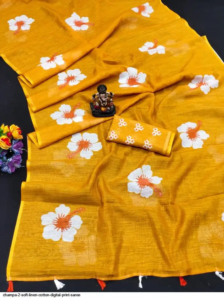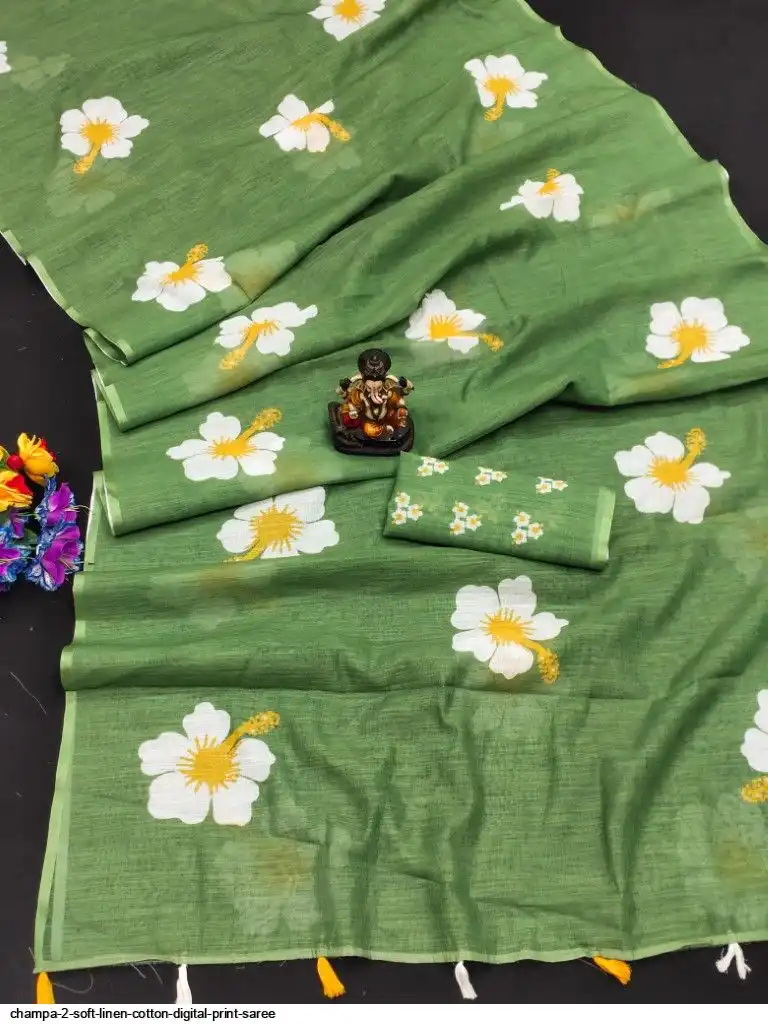 The Very Premium And Rich Quality Soft Linen Cotton Digital Print Sarees With Flower Print All Over The Body And Printed Pallu