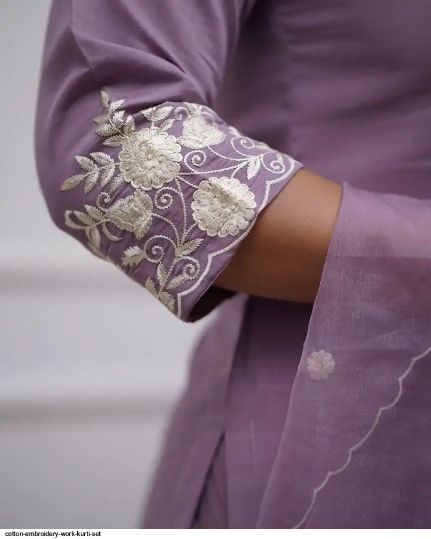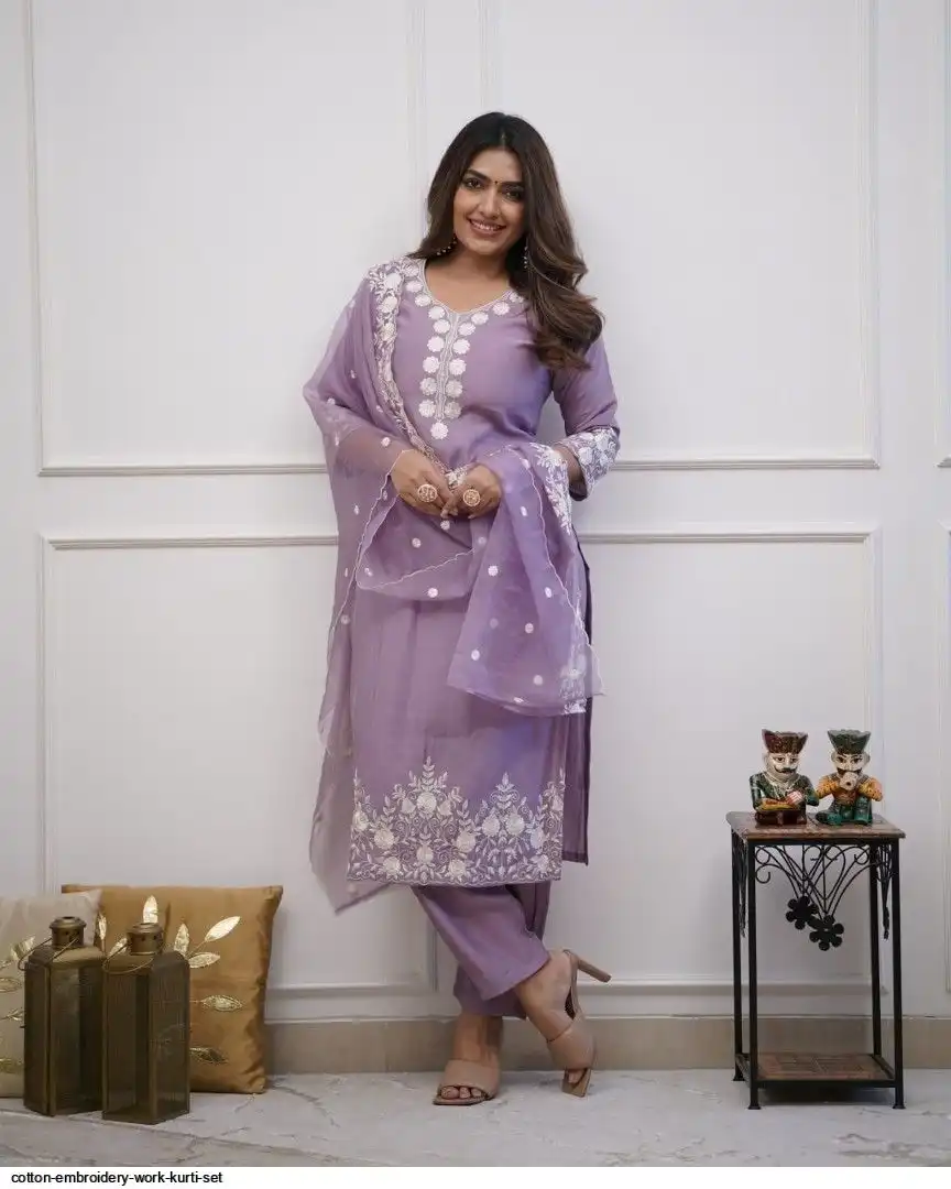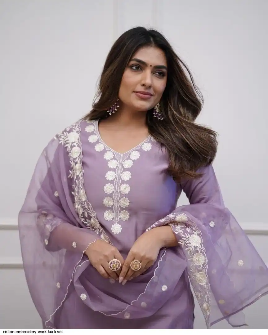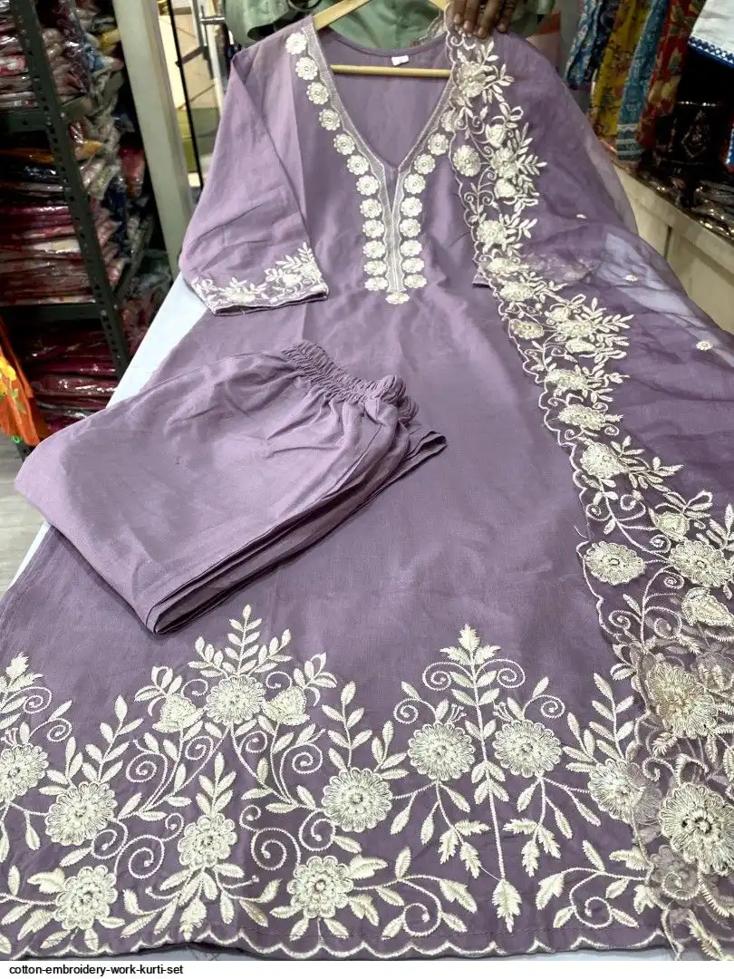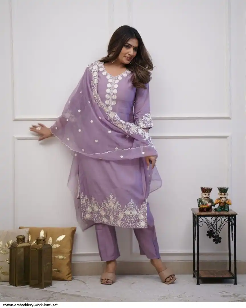 Cotton 60*60 Pant Set With Organza Dupatta And Embroidery Work detailing on Kurti