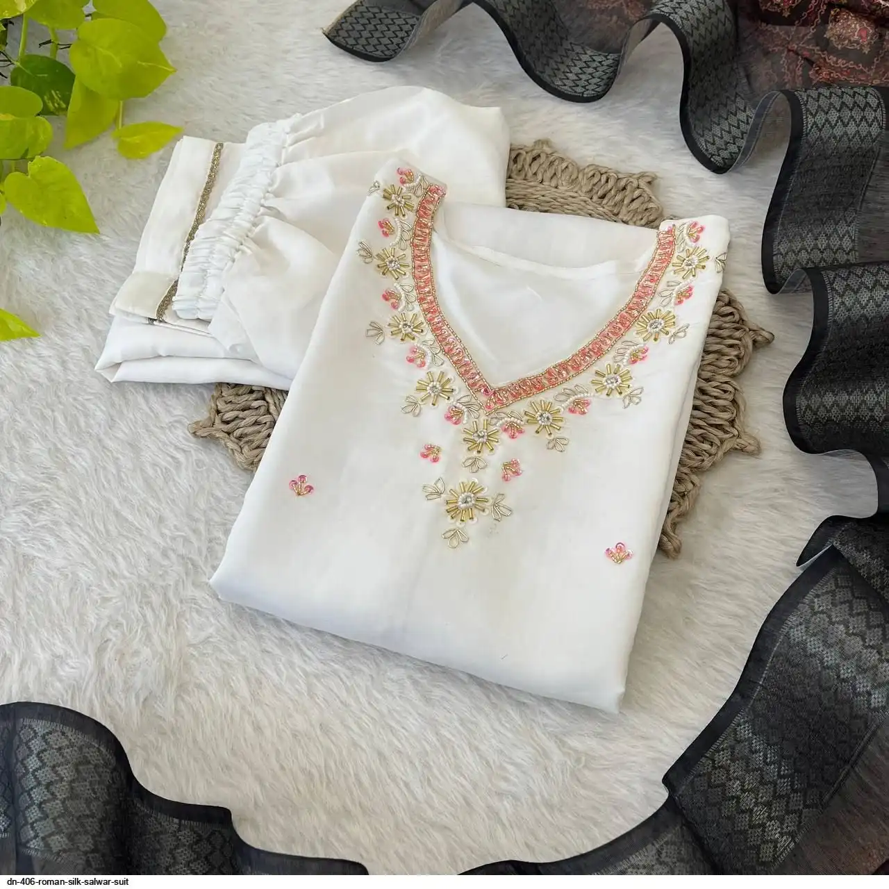 *FABRIC*-Kurti Premium Roman Silk Soft Fabric With Handwork Neck , Sleeve 3/4 With Fancy Lace