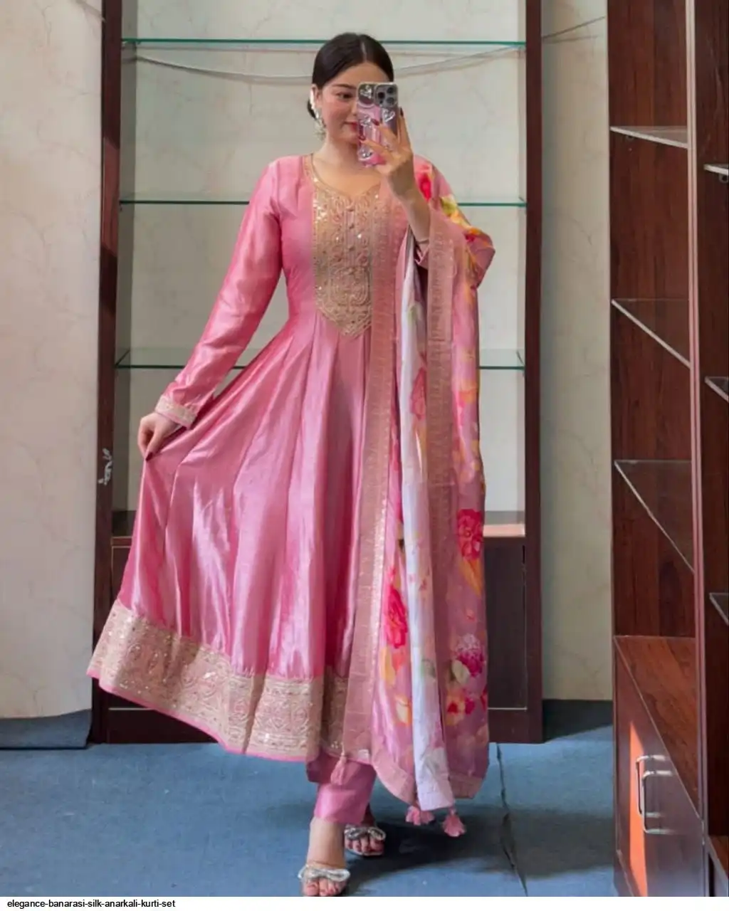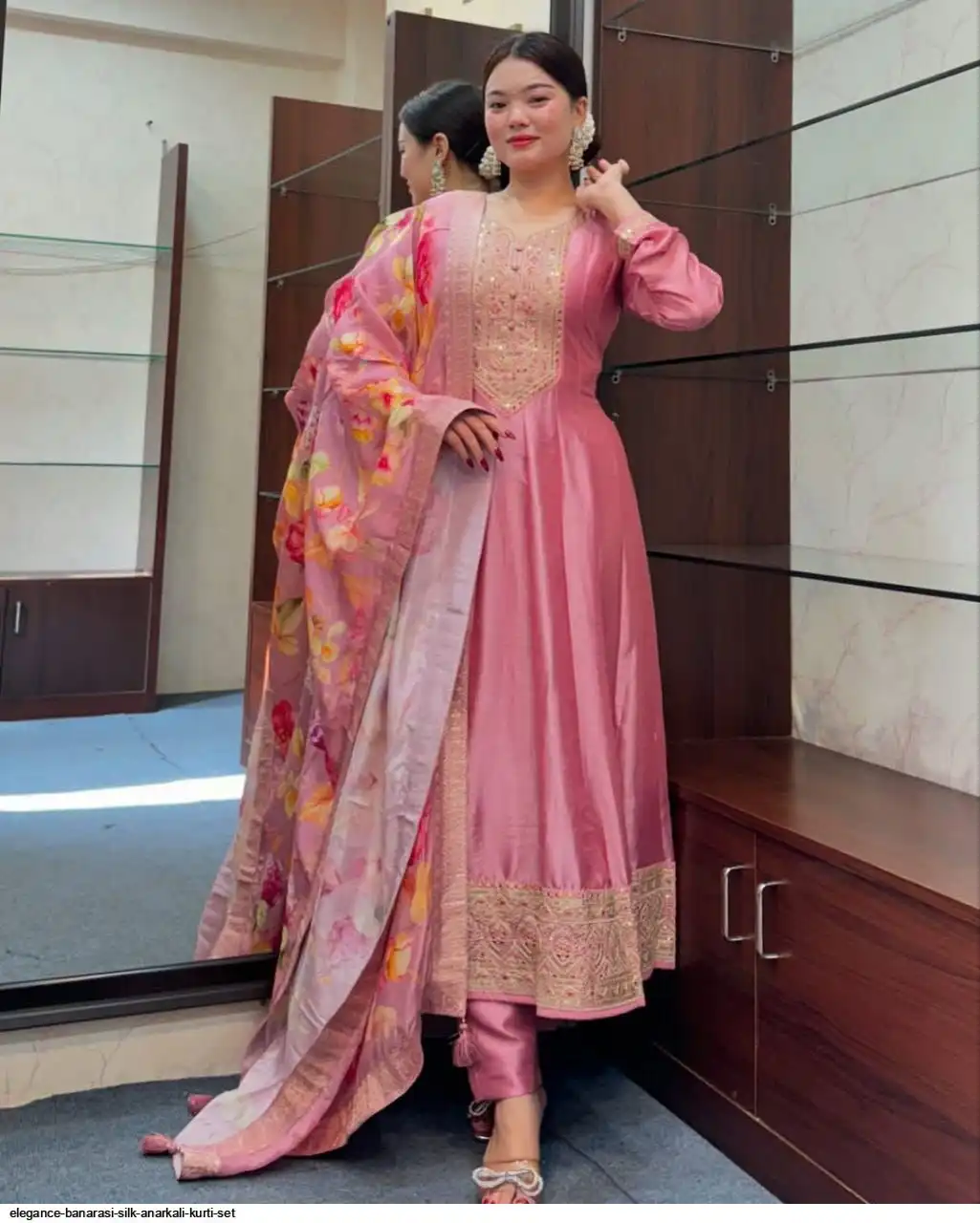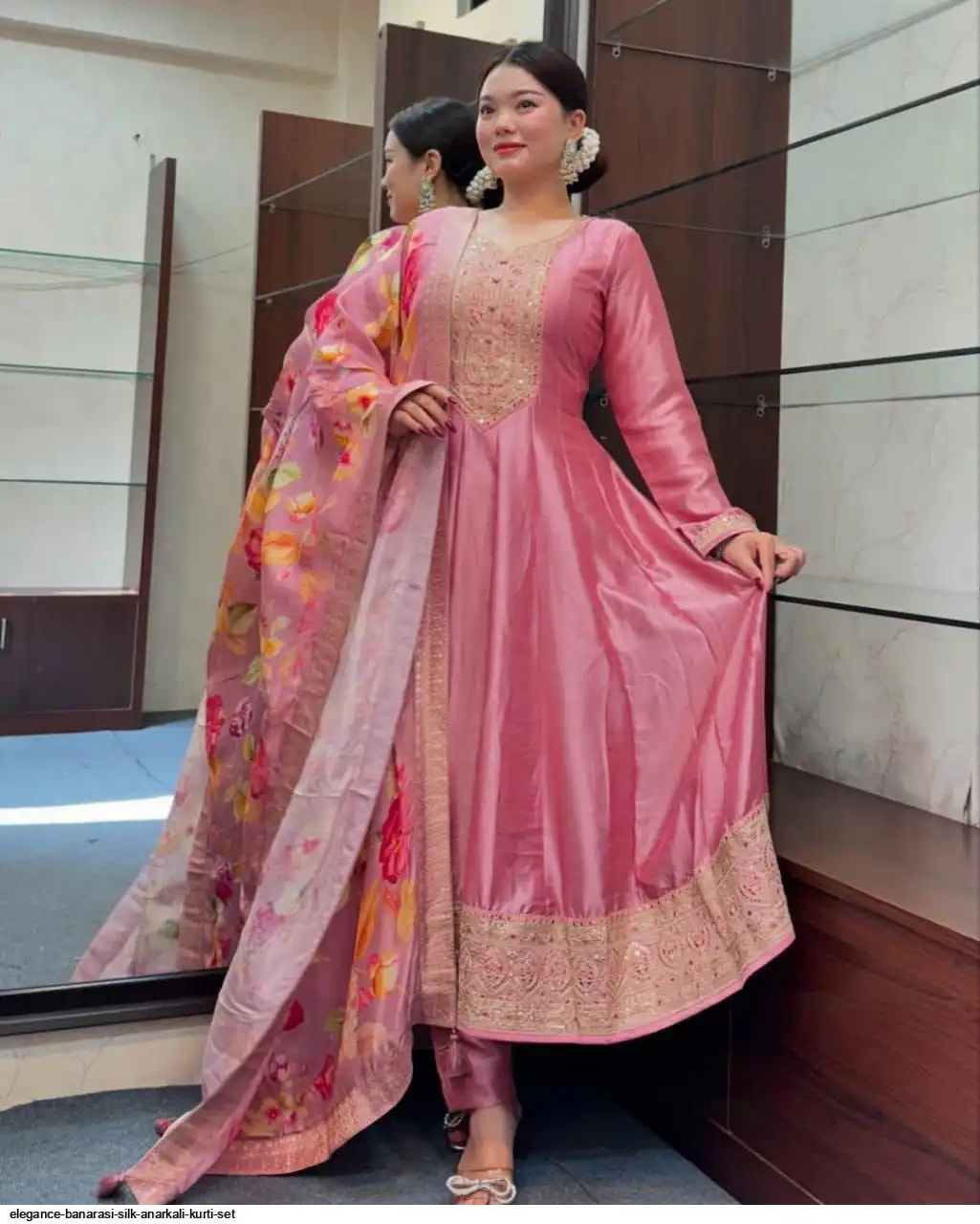 Step into timeless elegance with this exquisite Anarkali fl noared silk kurti set, designed to make you stand out at any festive or celebratory occasion. Crafted from luxurious silk, the Anarkali kurti features a graceful flare that flows beautifully, creating a regal and sophisticated look silhouette. The intricate detailing on the yoke adds a touch of traditional charm, while the soft silk fabric ensures all-day comfort.