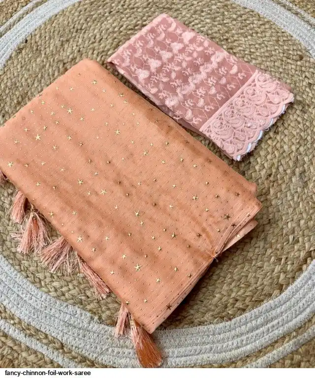 Chinnon with foil work with beautiful latkan Saree With Blouse