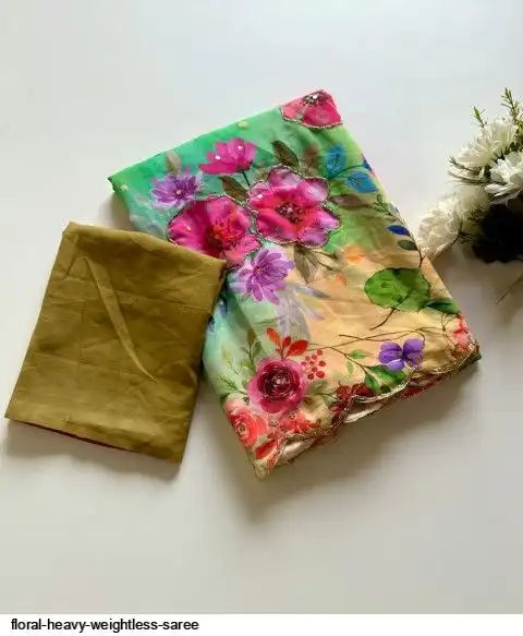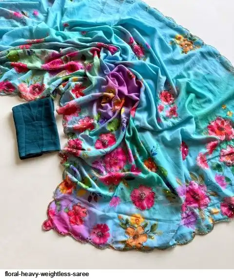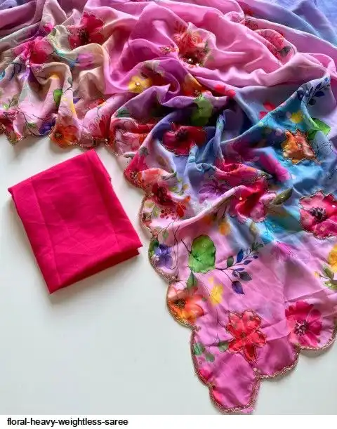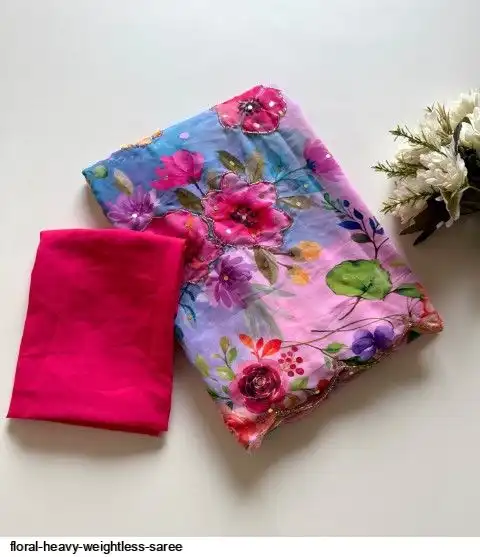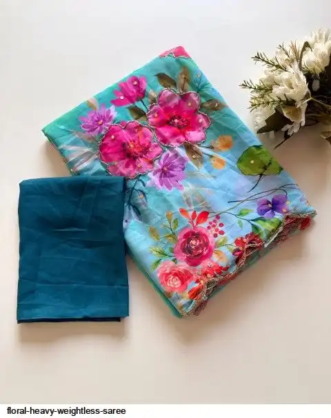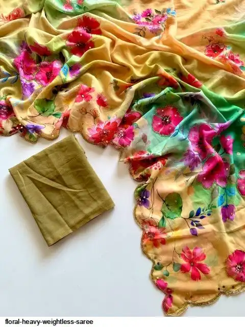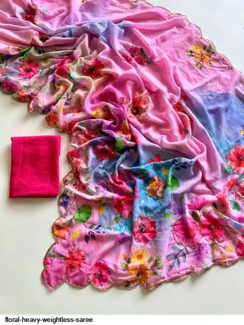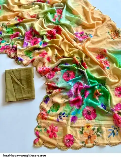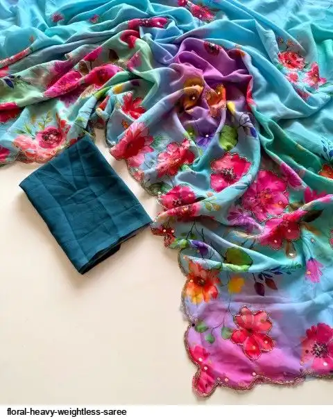 ▶️ Fabric - Heavy Weightless Fabric With Beautiful Floral Digital Print And Cutdana Handwork And Plan Blouse👚