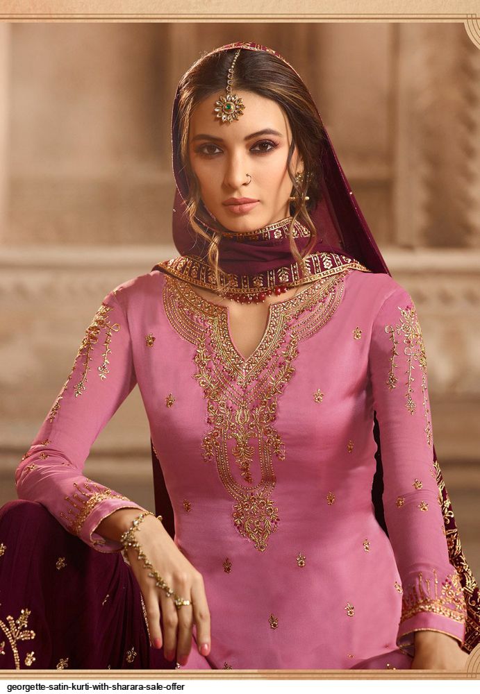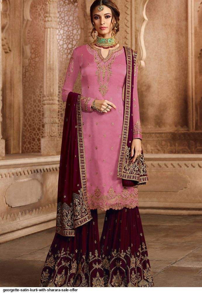 Light Pink And Maroon Embroidered Pakistani Gharara Suit shows combination of embossed zari and thread detailed embroidery on heavy georgette satin top paired with embroidered detailed pakistani gharara georgette bottom and santoon lining and shimmering georgette dupatta. Alluring beauty of this dress will make you look classy and stylish when styled with stilettos and clutch.