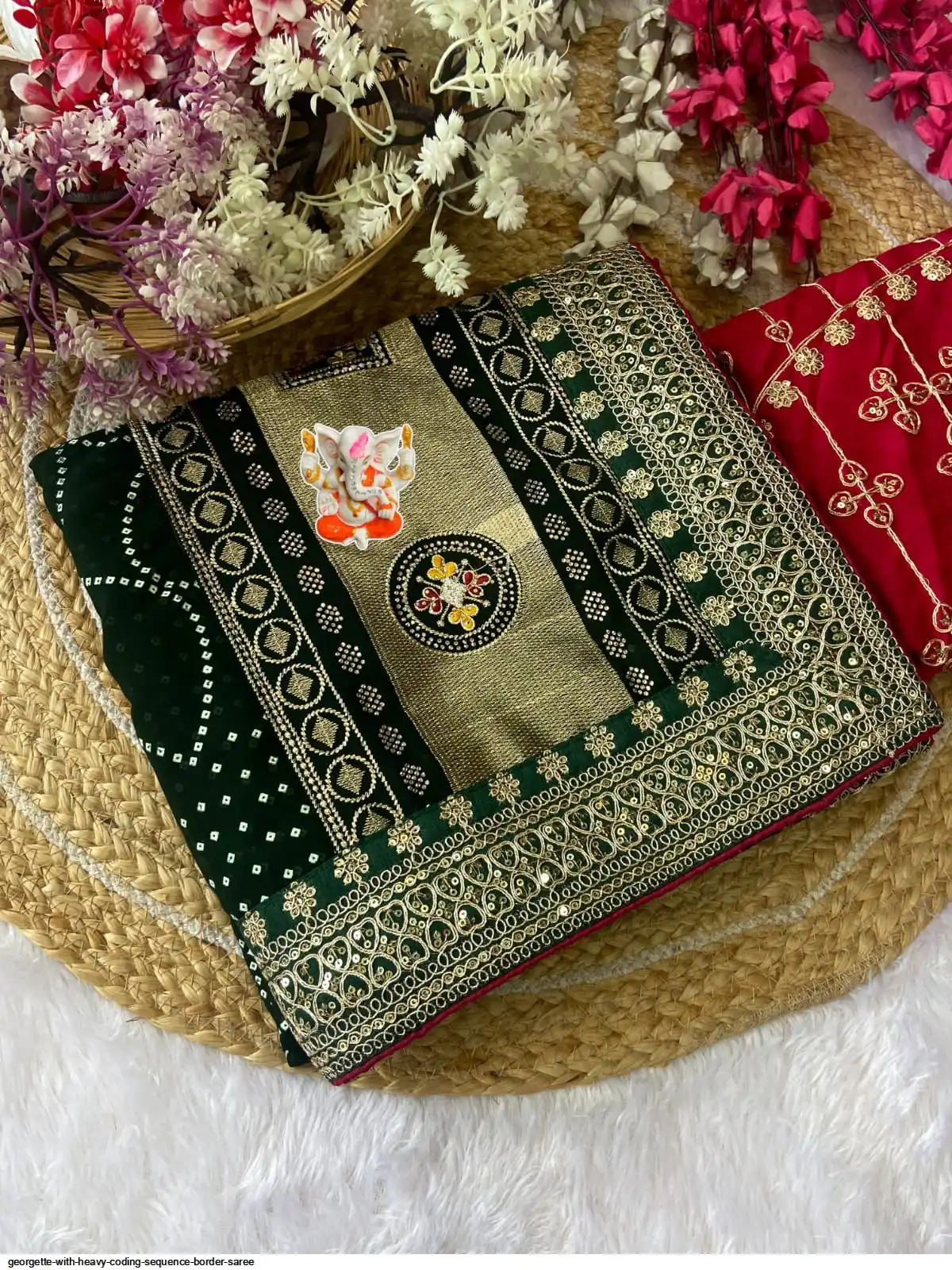Fabric 60 gram georgette with heavy Coding Sequence border with beautiful box pallu and bandhani foil print with heavy Coding Sequence blouse