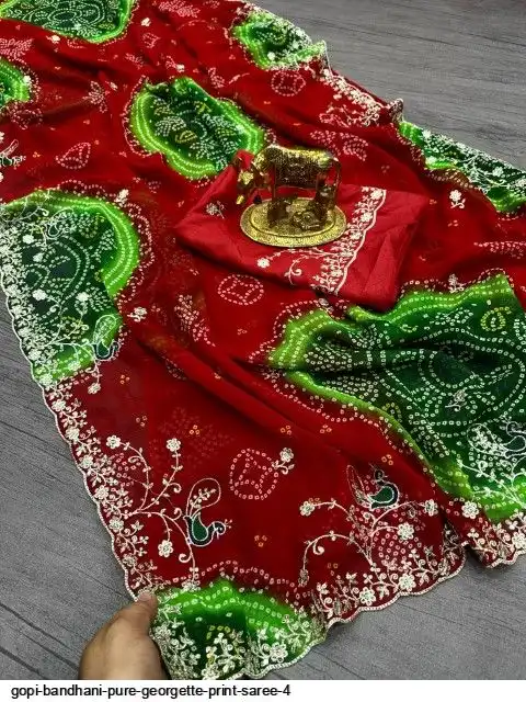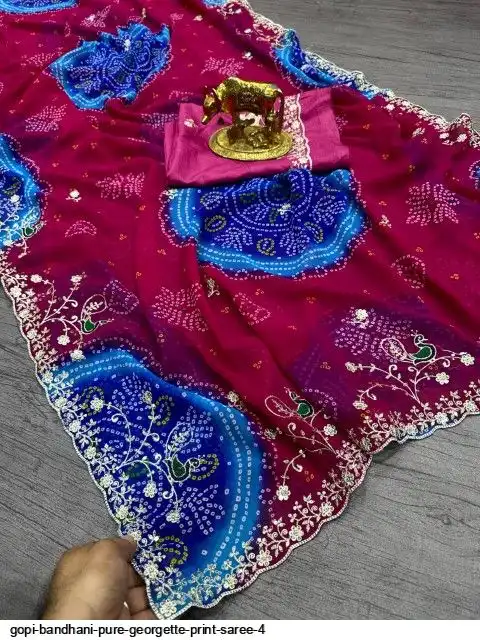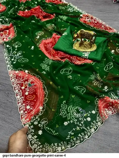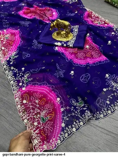 Saree :~ Pure Georgette with Jodhpur Bandhani Print Saree with Beautiful Peacock Work in C~Pallu Border in Saree