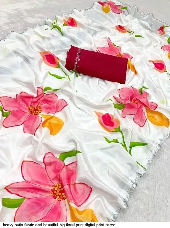 Fabric - Heavy Satin Fabric And Beautiful Big Floral Print Digital Print With Fancy Siroski Cutwork Border And Contrast Banglori Blouse