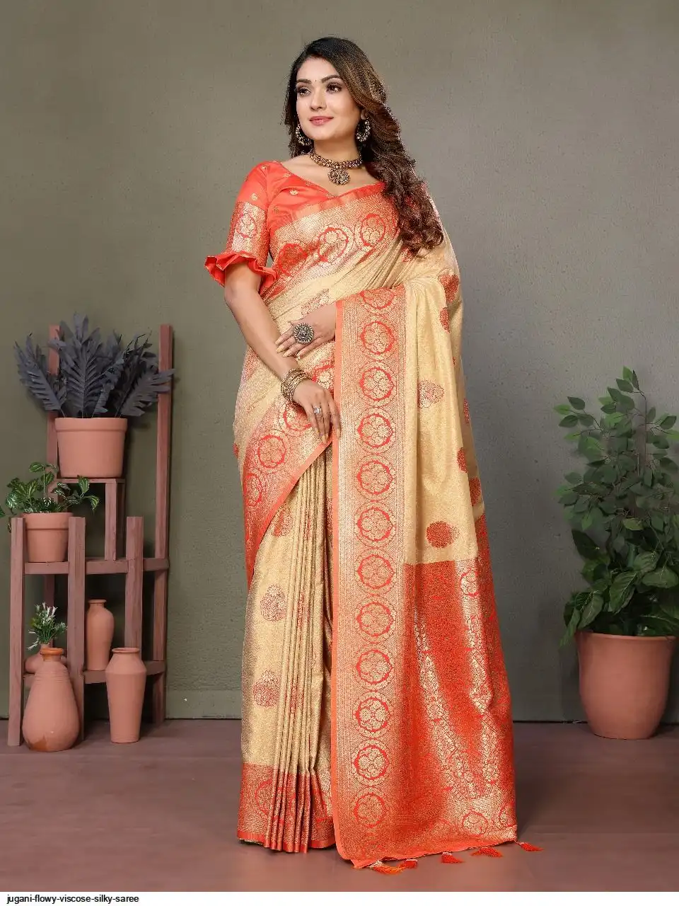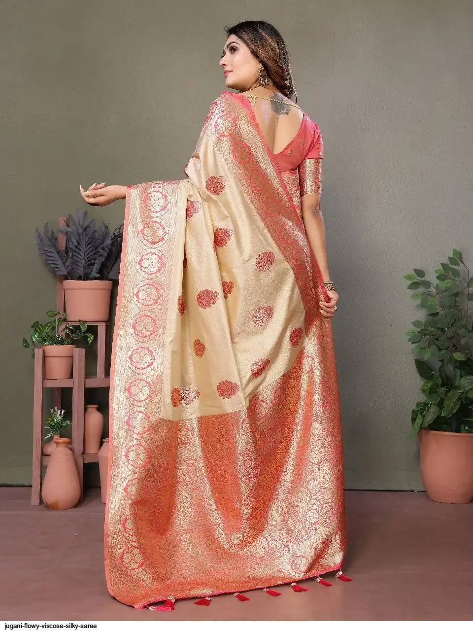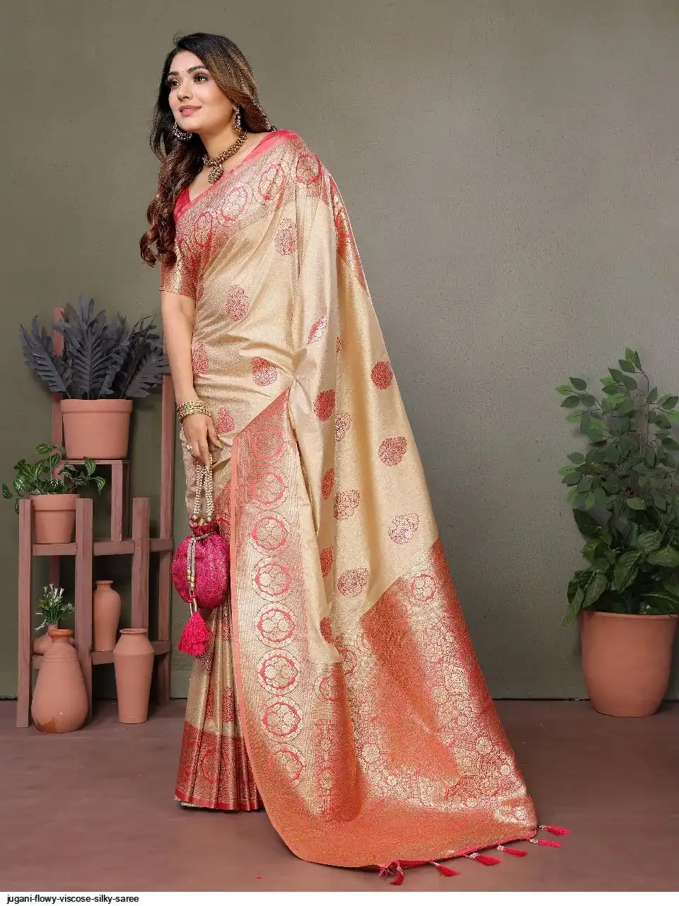 The rich and high quality soft, flowy Viscose silky sarees that are soft and with all over weaving butties in the body with contrast border , woven Rich pallu