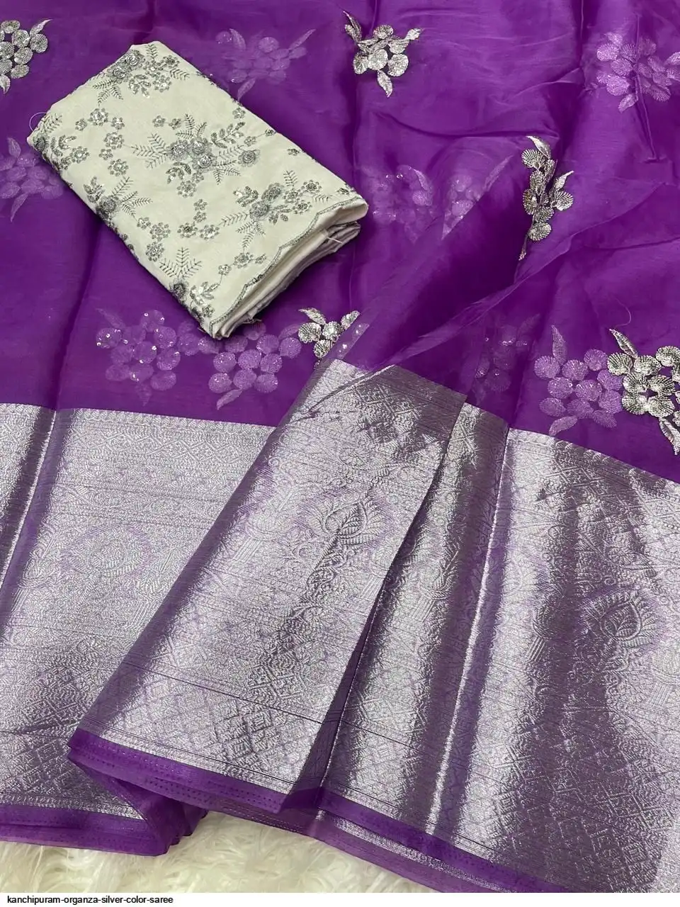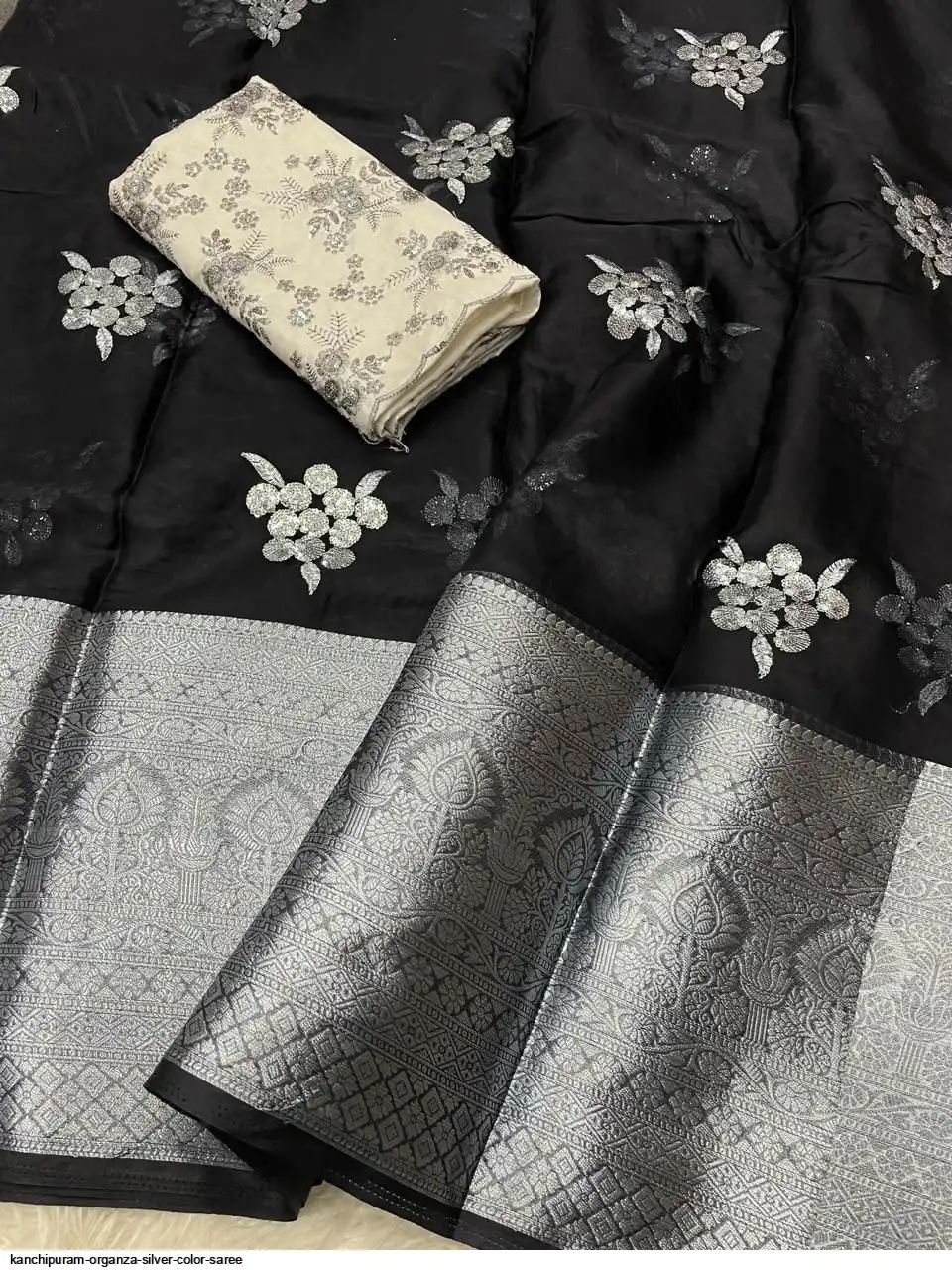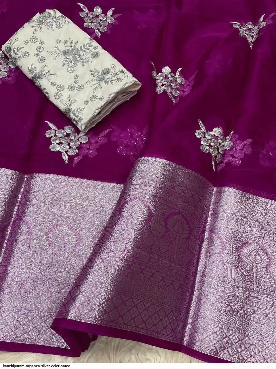 Kanchipuram organza jacquard border with Zari silver work with sequence with heavy worked blouse