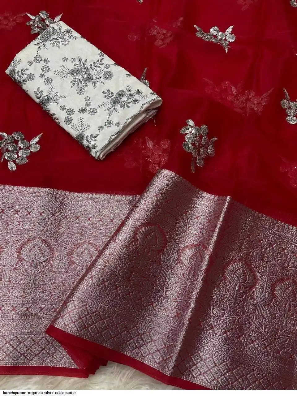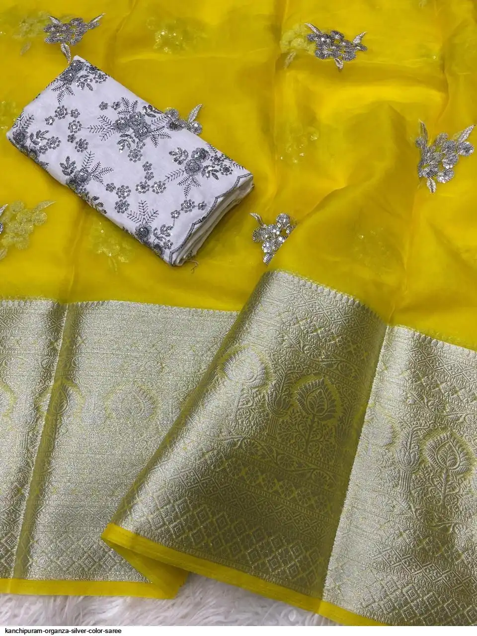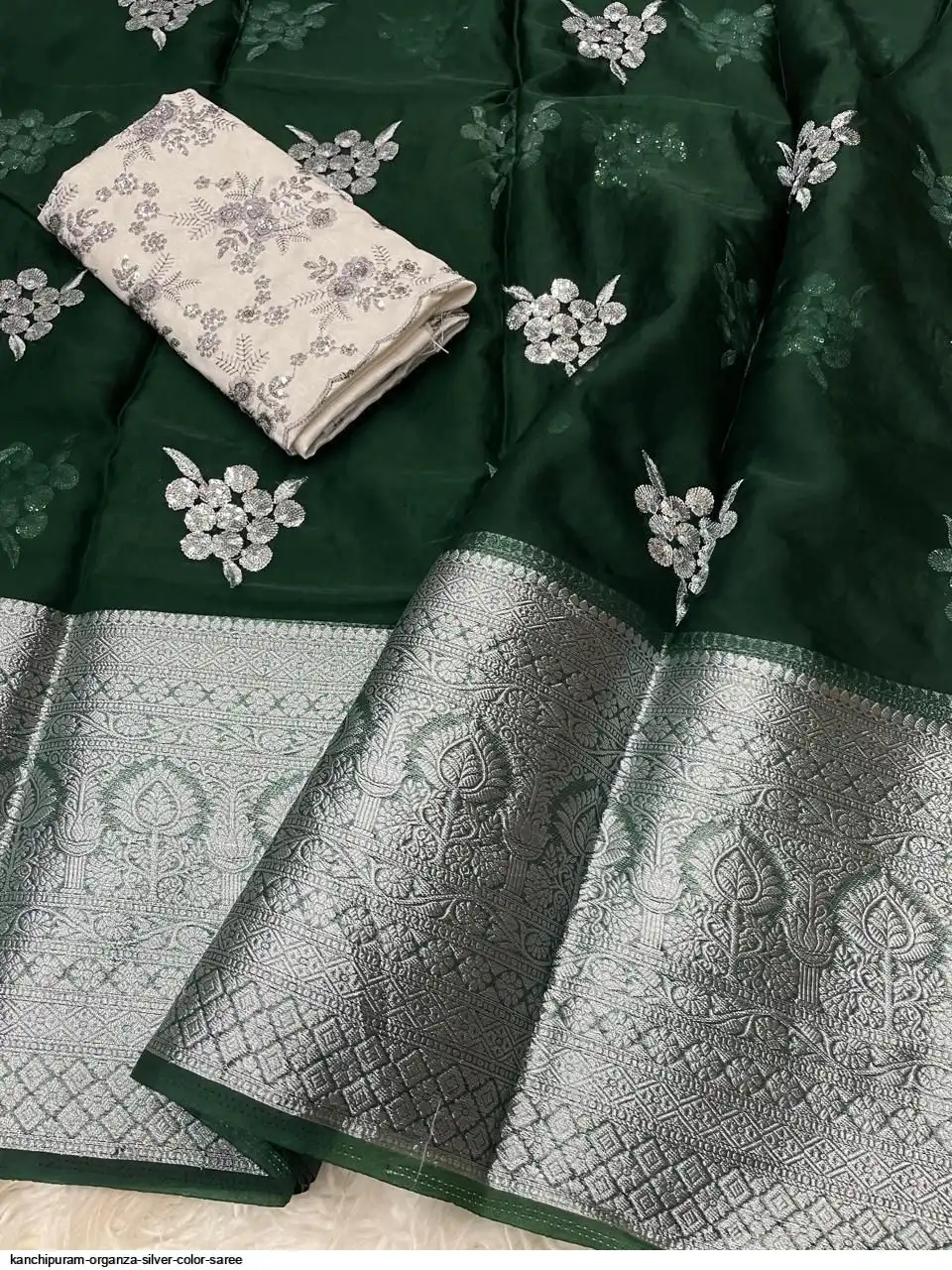 Kanchipuram organza jacquard border with Zari silver work with sequence with heavy worked blouse