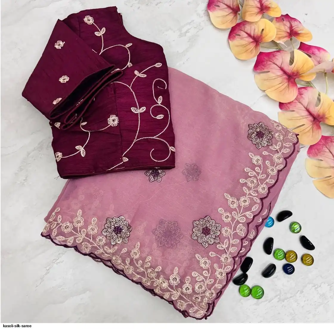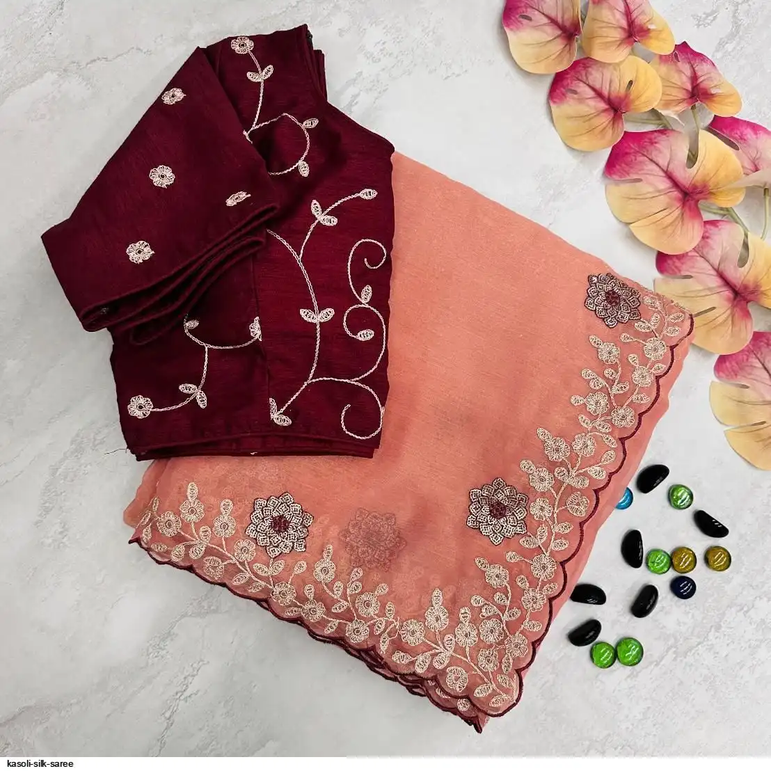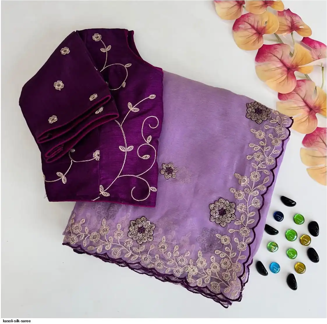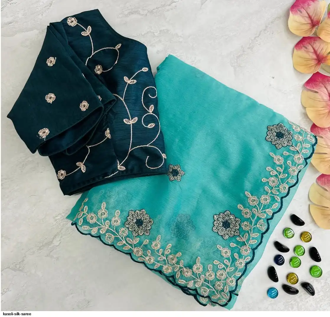 Kasoli silk saree with beautiful embroidery work touch up of contrast thread work in butta with aarco border and unstitch silk blouse with handwork