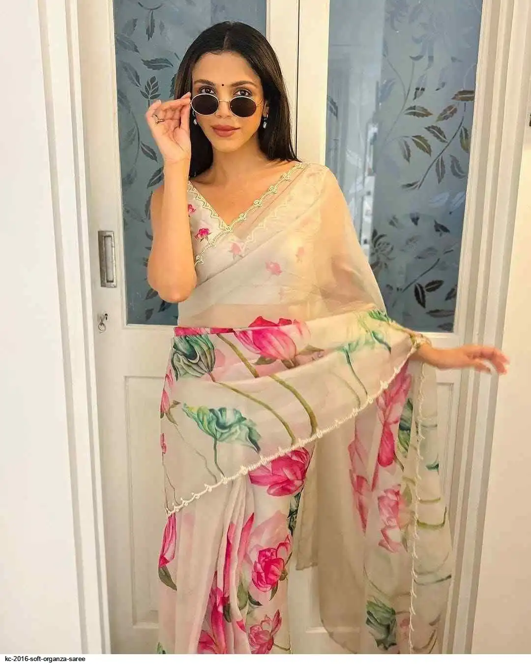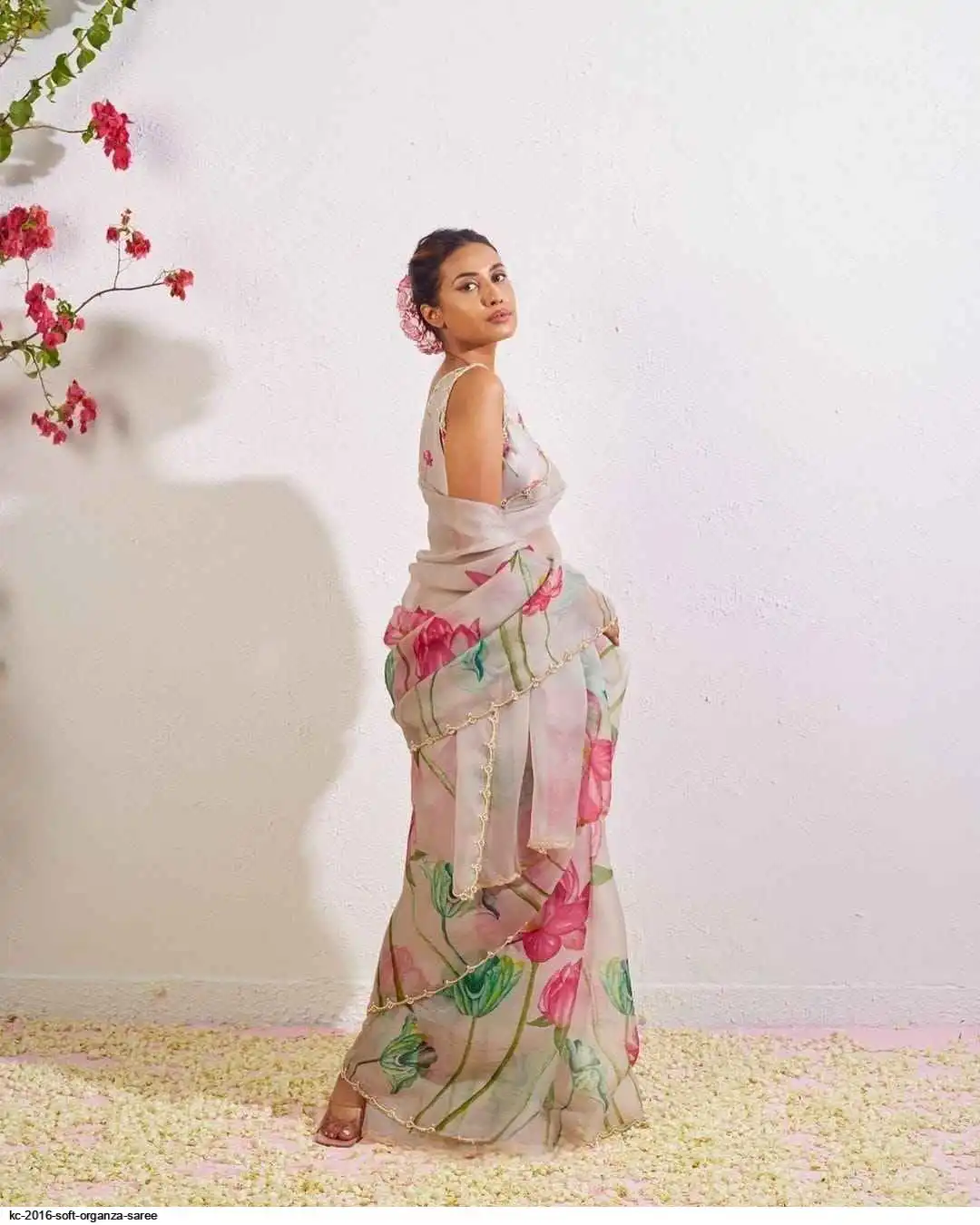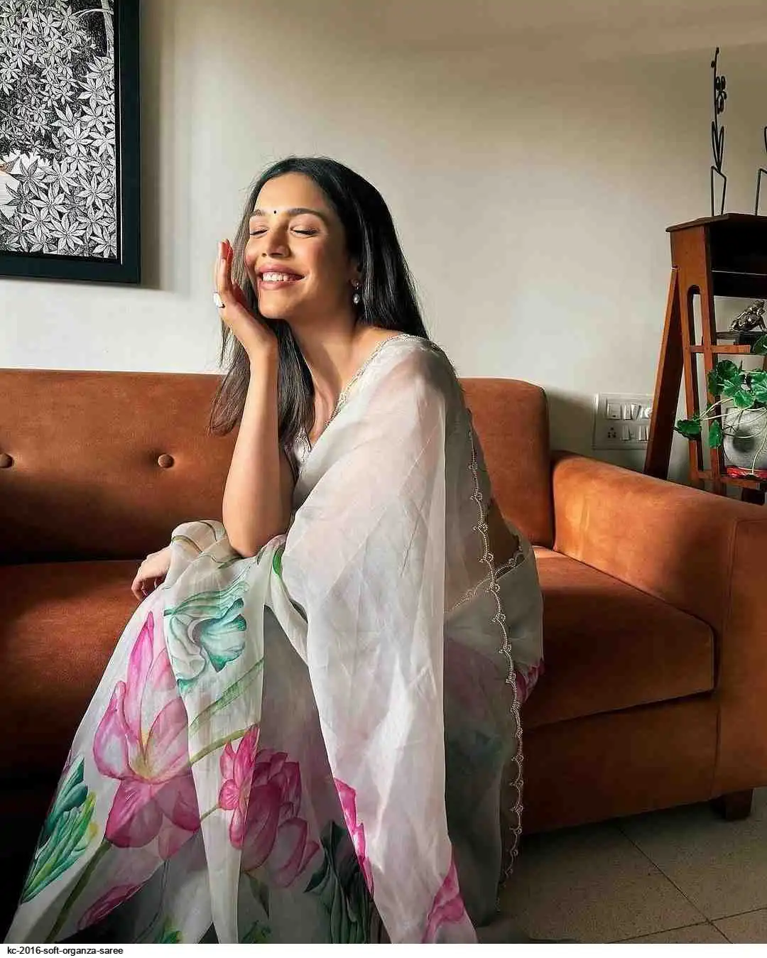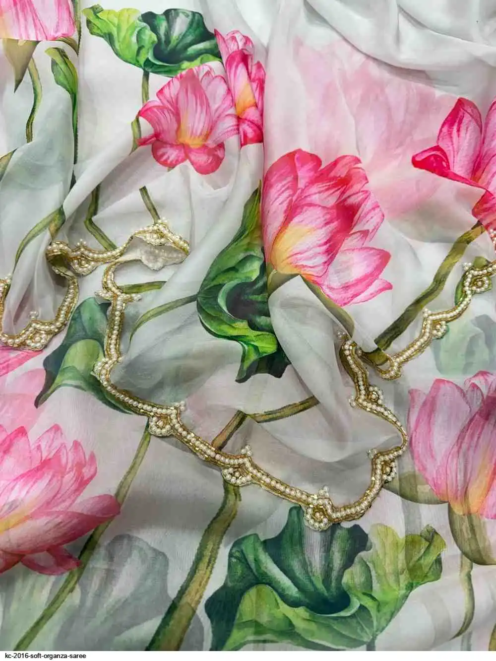 WORK : Beautiful floral print with beads and katdana handwork in border