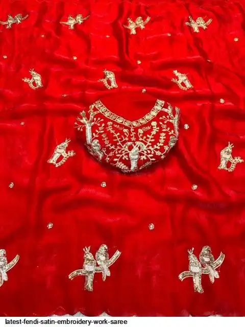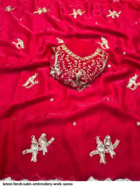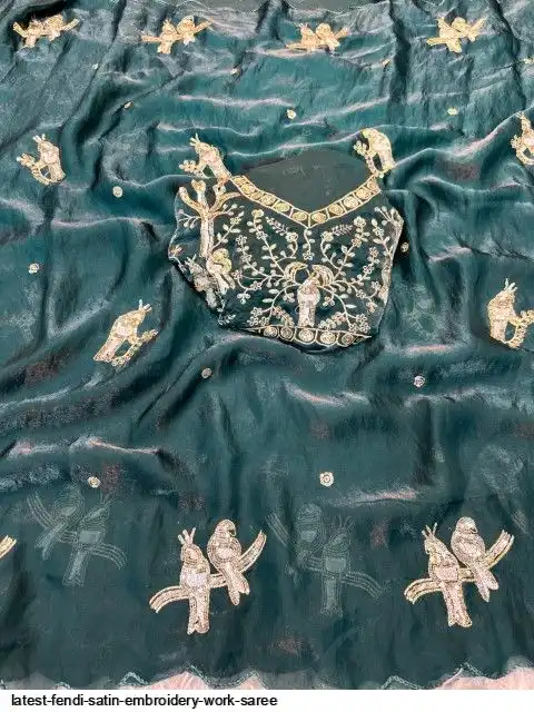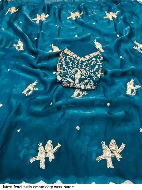 Fandy satin saree with shaded floral embroidery on borders. Very classy and elegant color combinations. Blouse has butties on the body and borders