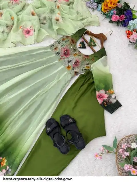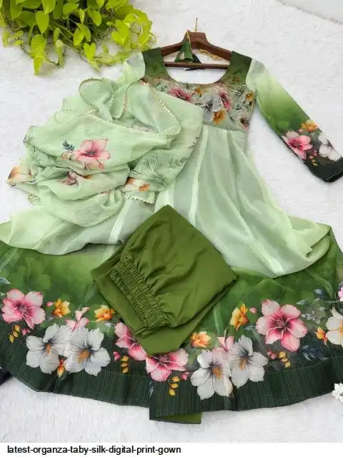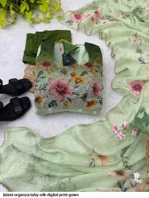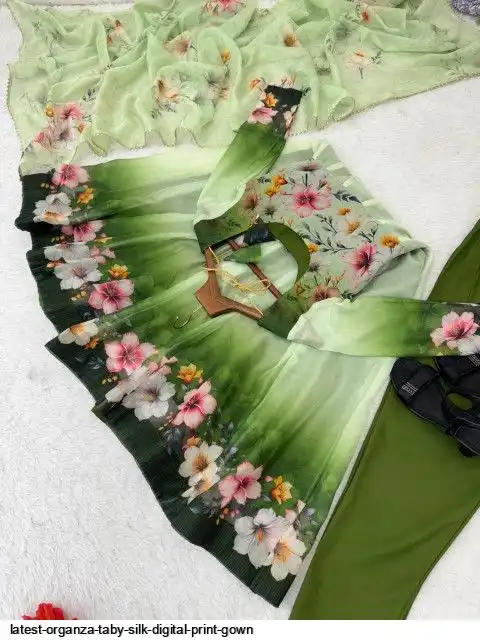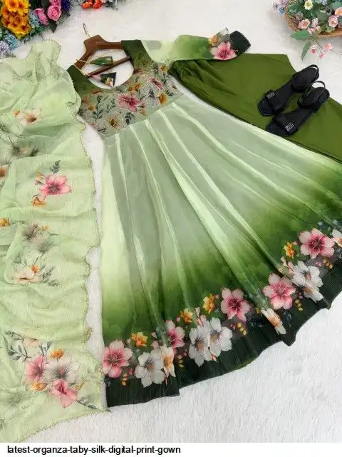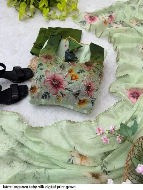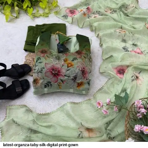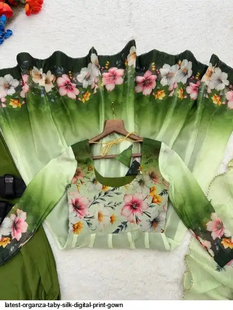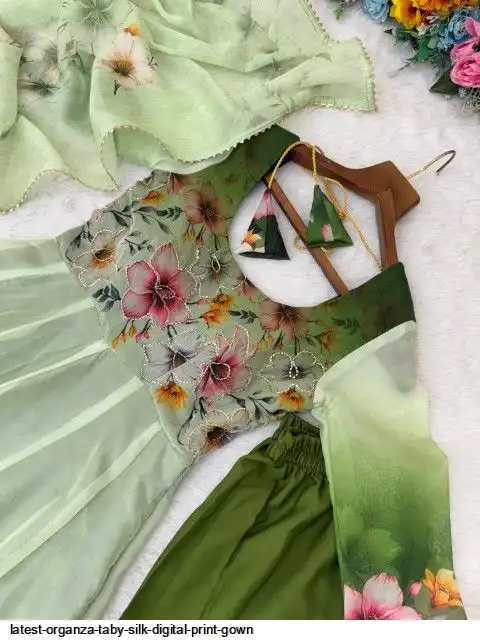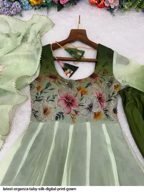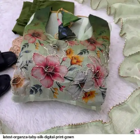 Gown Febrics Organza Soft Taby Silk Heavy Quality Fabric With Digital Print And , Full Long Sleeve , Choli Hand Rebin Work