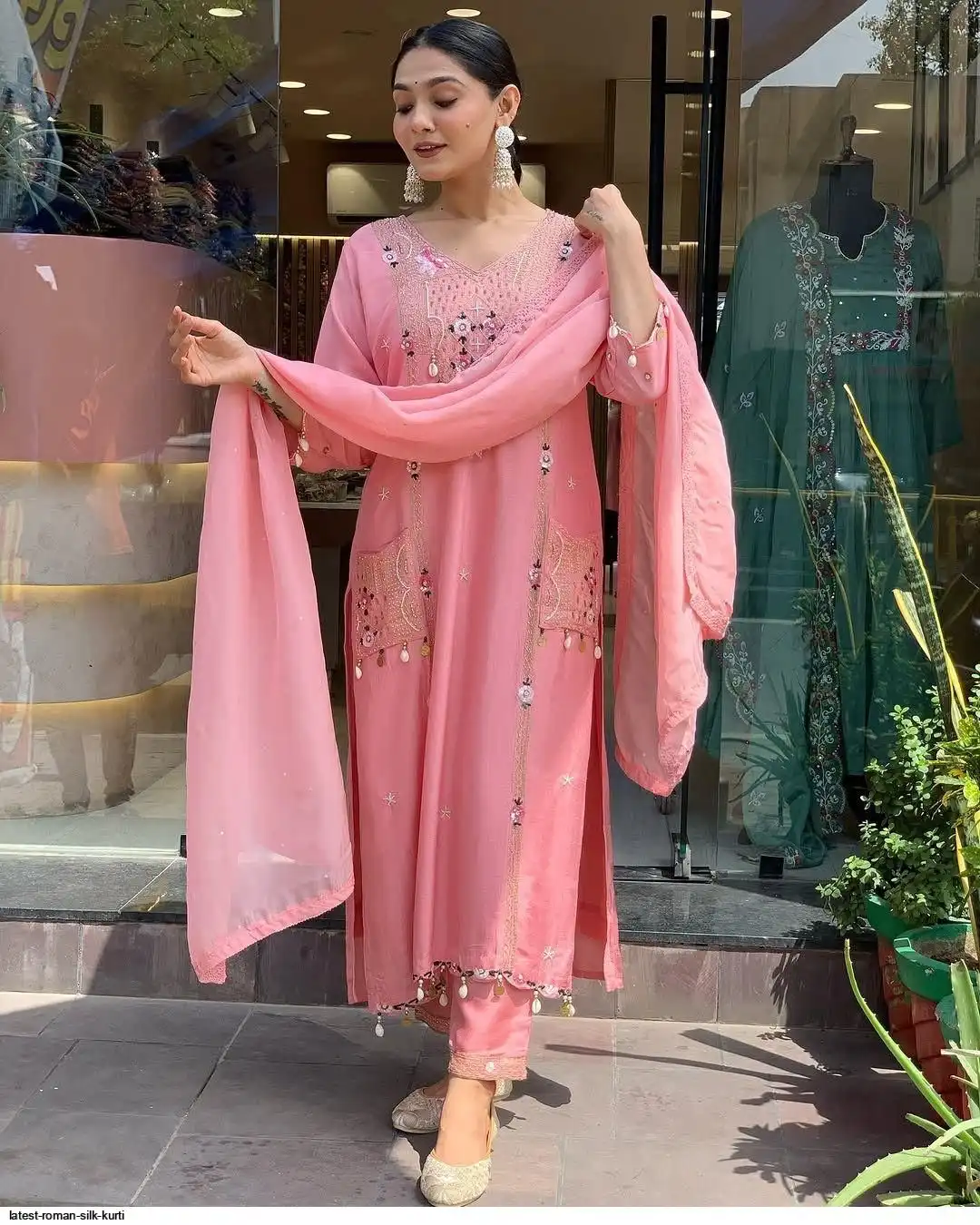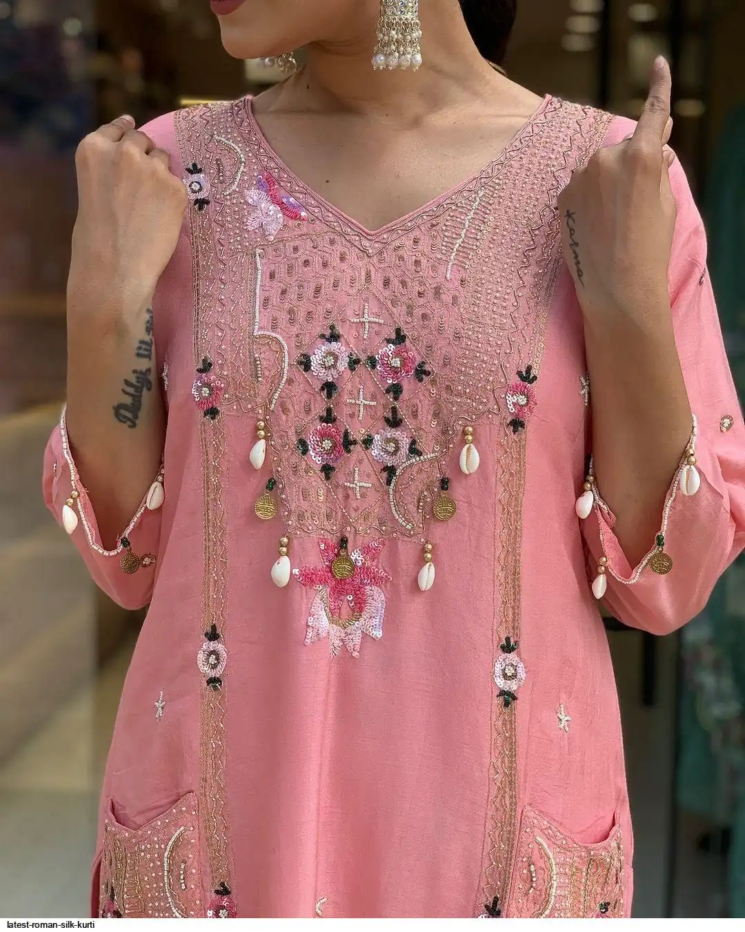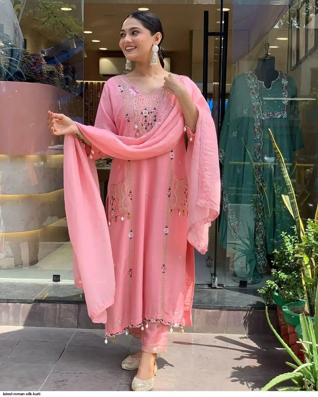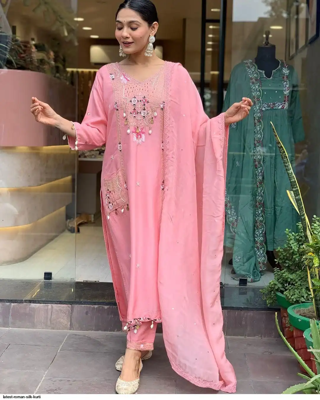 Our Exclusive Collection is here, to add a touch of tradition to your wardrobe. Featuring beautifully Crafted Pure Roman Silk Suits in beautiful Colours, which are decorated with finest sequence & Cowry Embroidery Work with Patch Print Detailing. A Must Have for Festivities!