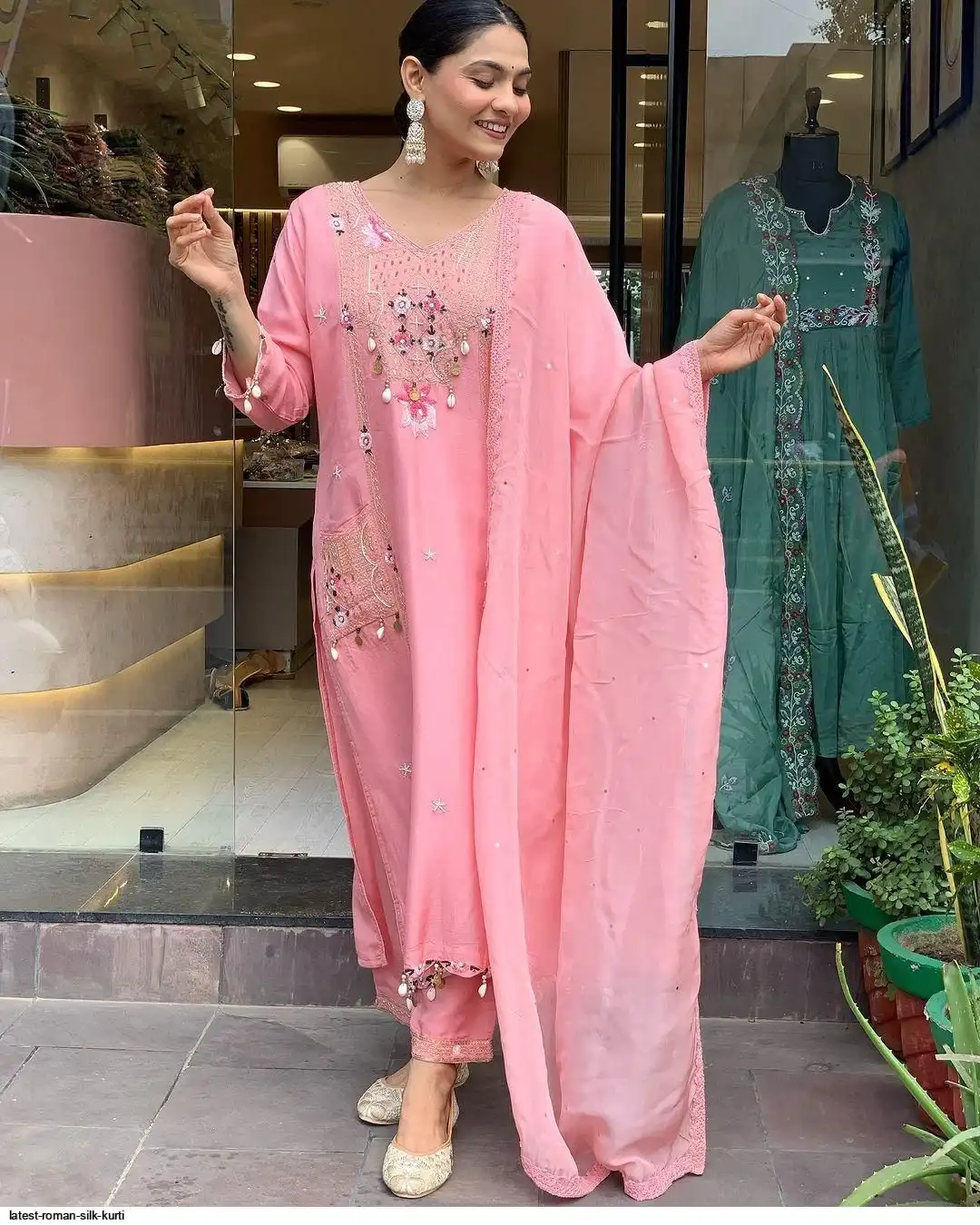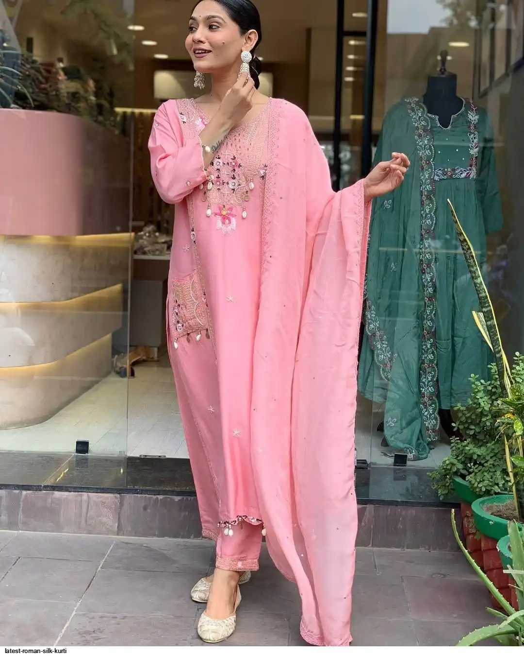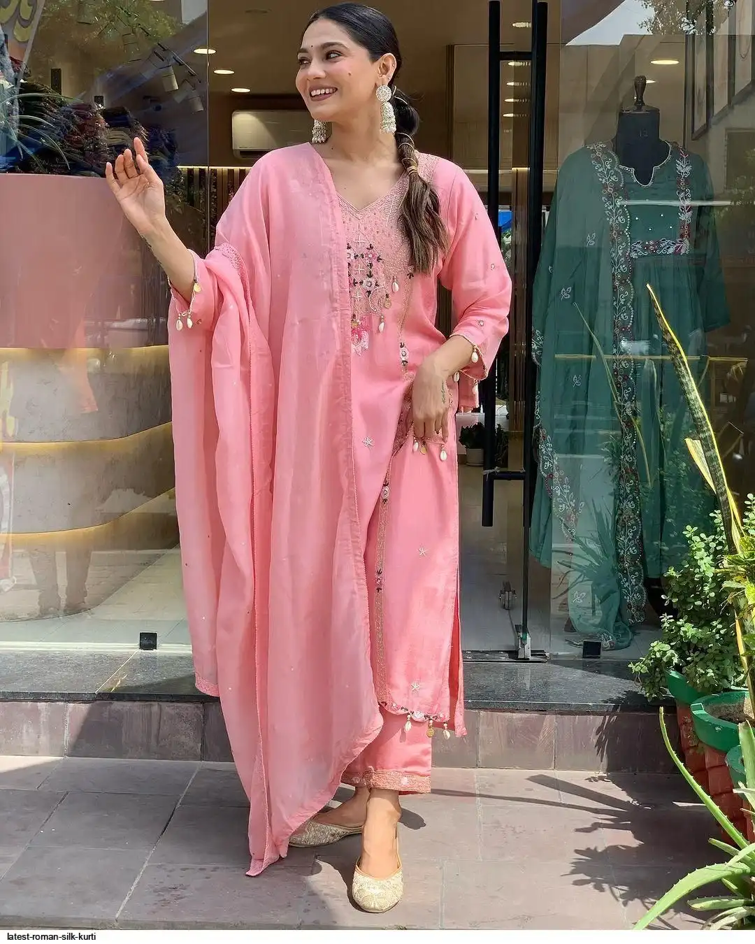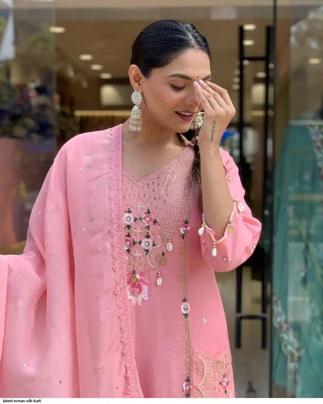 Our Exclusive Collection is here, to add a touch of tradition to your wardrobe. Featuring beautifully Crafted Pure Roman Silk Suits in beautiful Colours, which are decorated with finest sequence & Cowry Embroidery Work with Patch Print Detailing. A Must Have for Festivities!