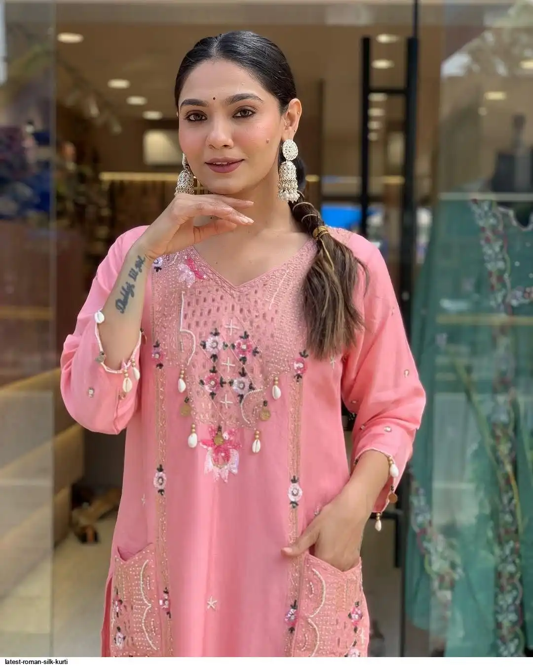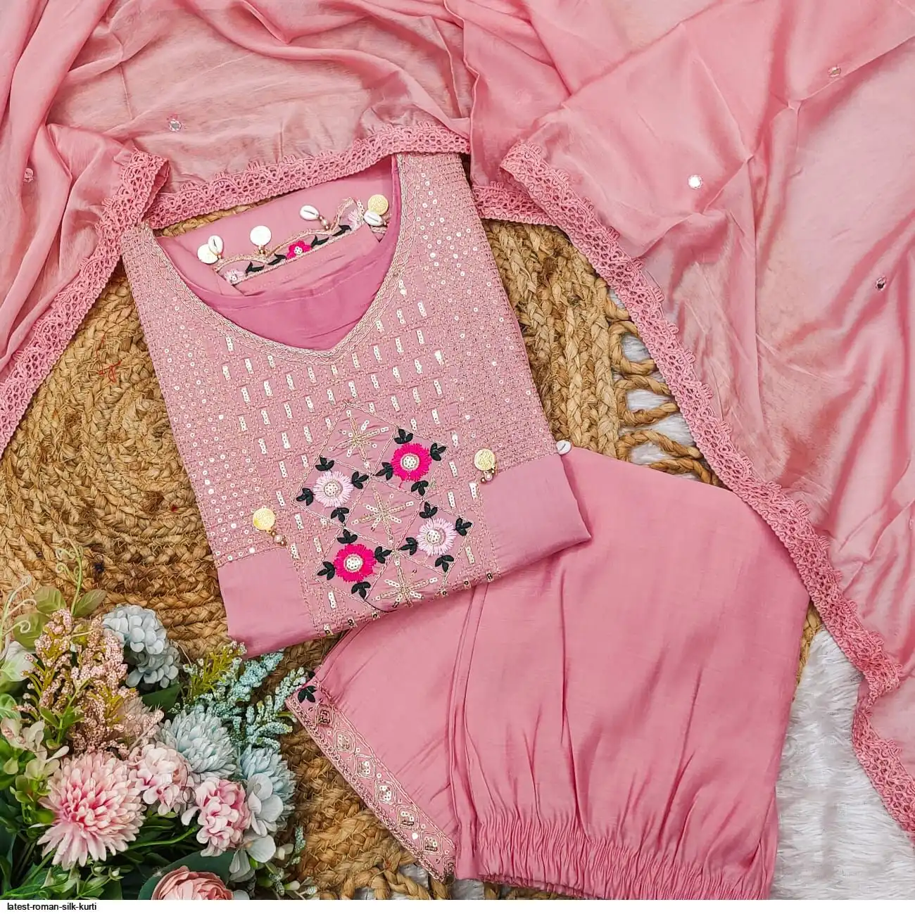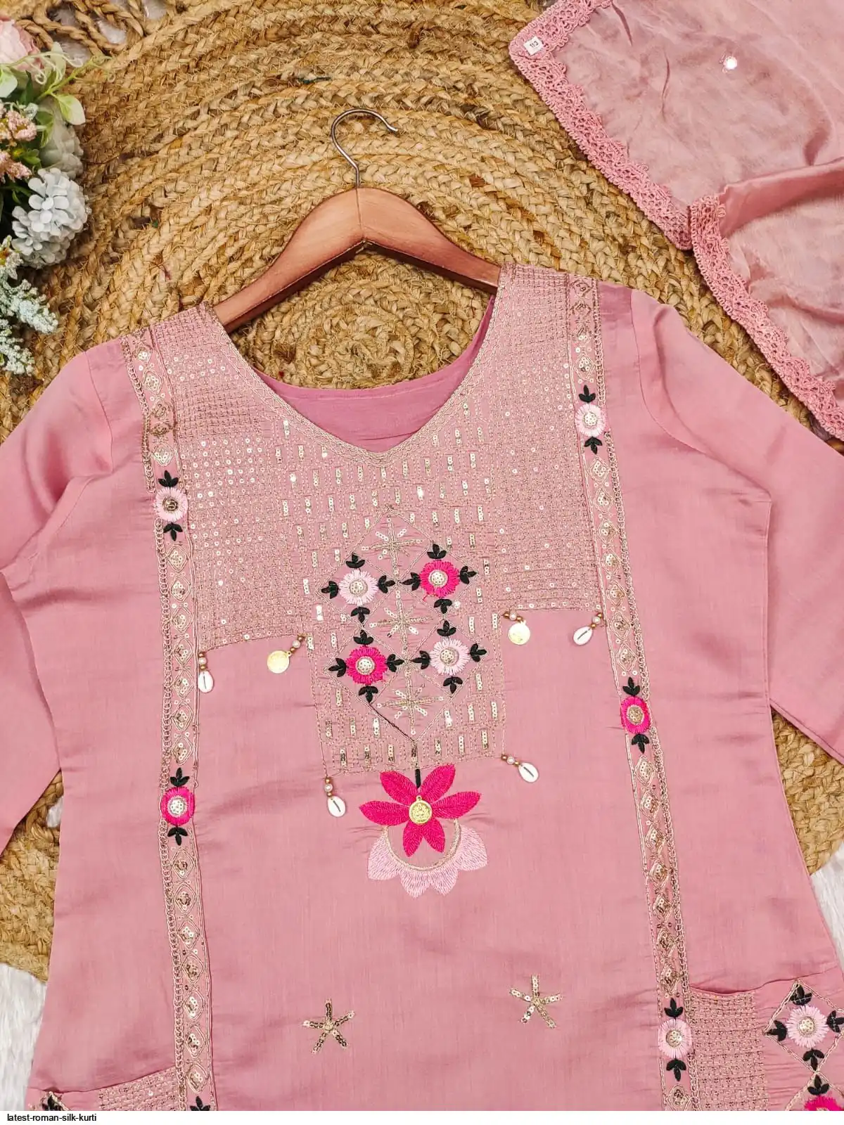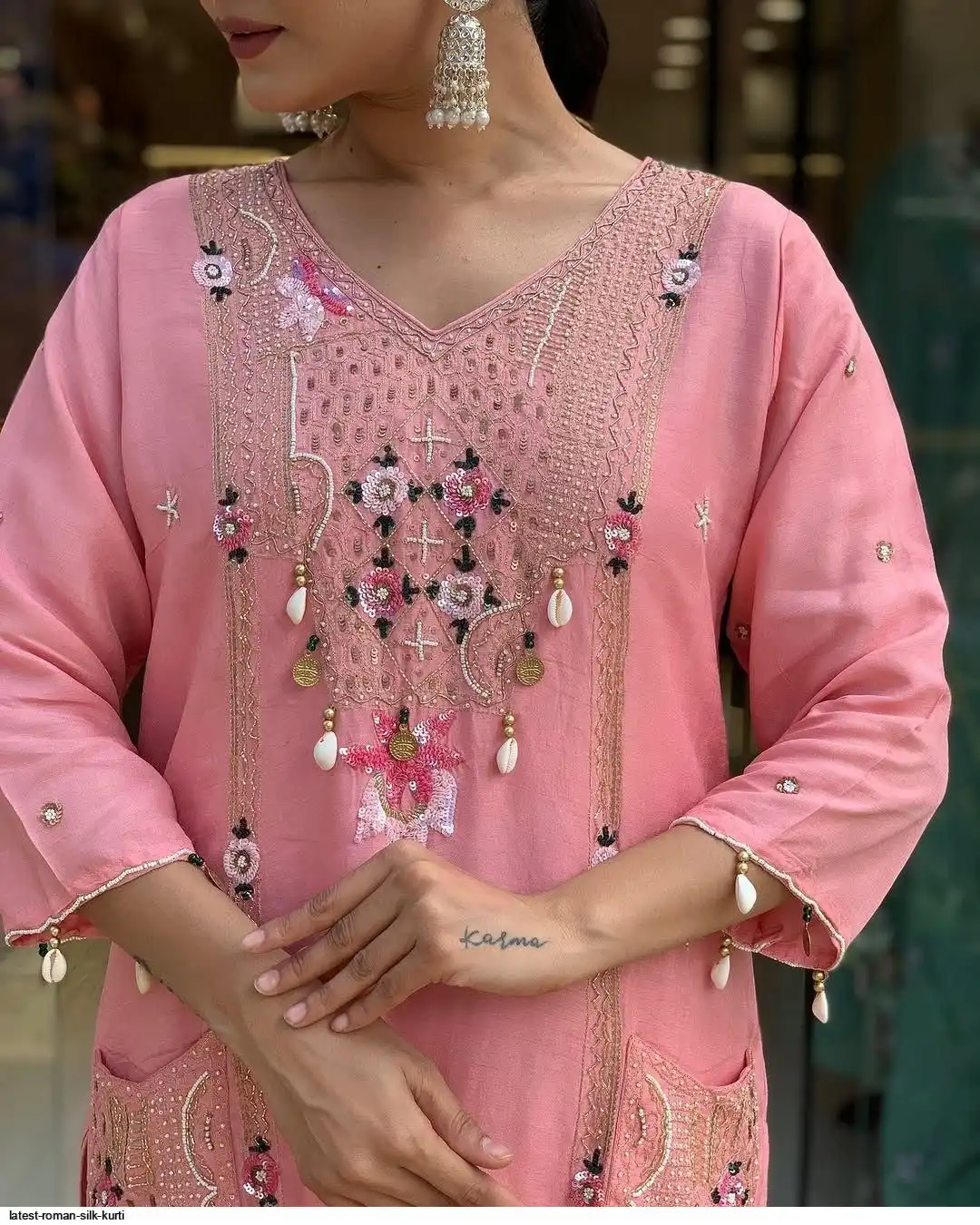 Our Exclusive Collection is here, to add a touch of tradition to your wardrobe. Featuring beautifully Crafted Pure Roman Silk Suits in beautiful Colours, which are decorated with finest sequence & Cowry Embroidery Work with Patch Print Detailing. A Must Have for Festivities!