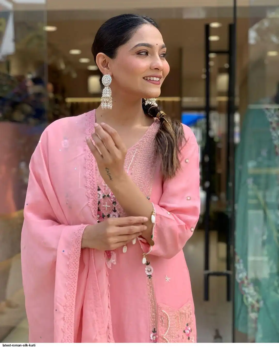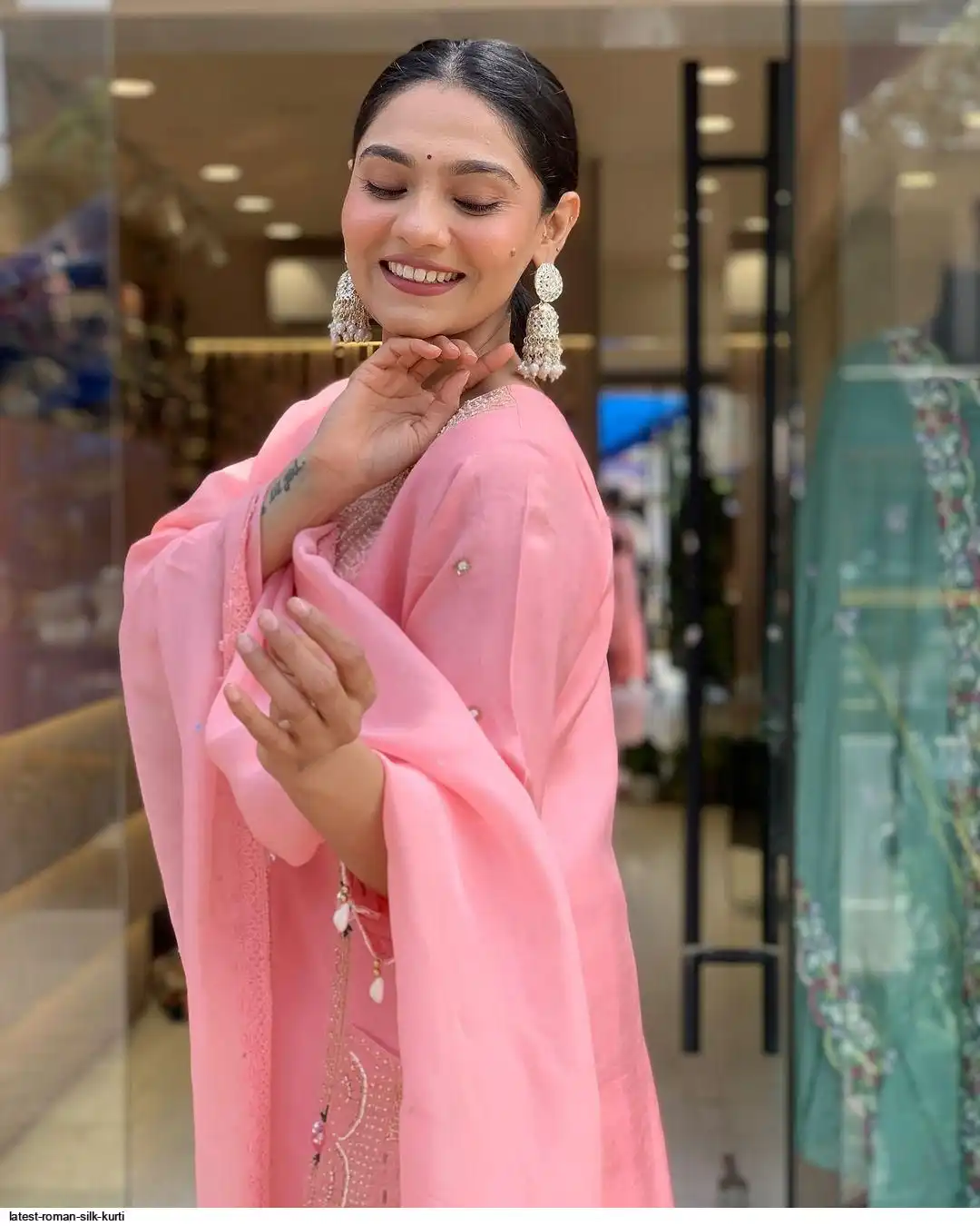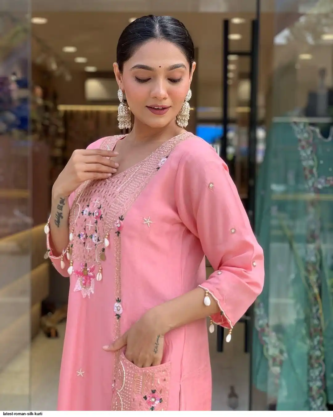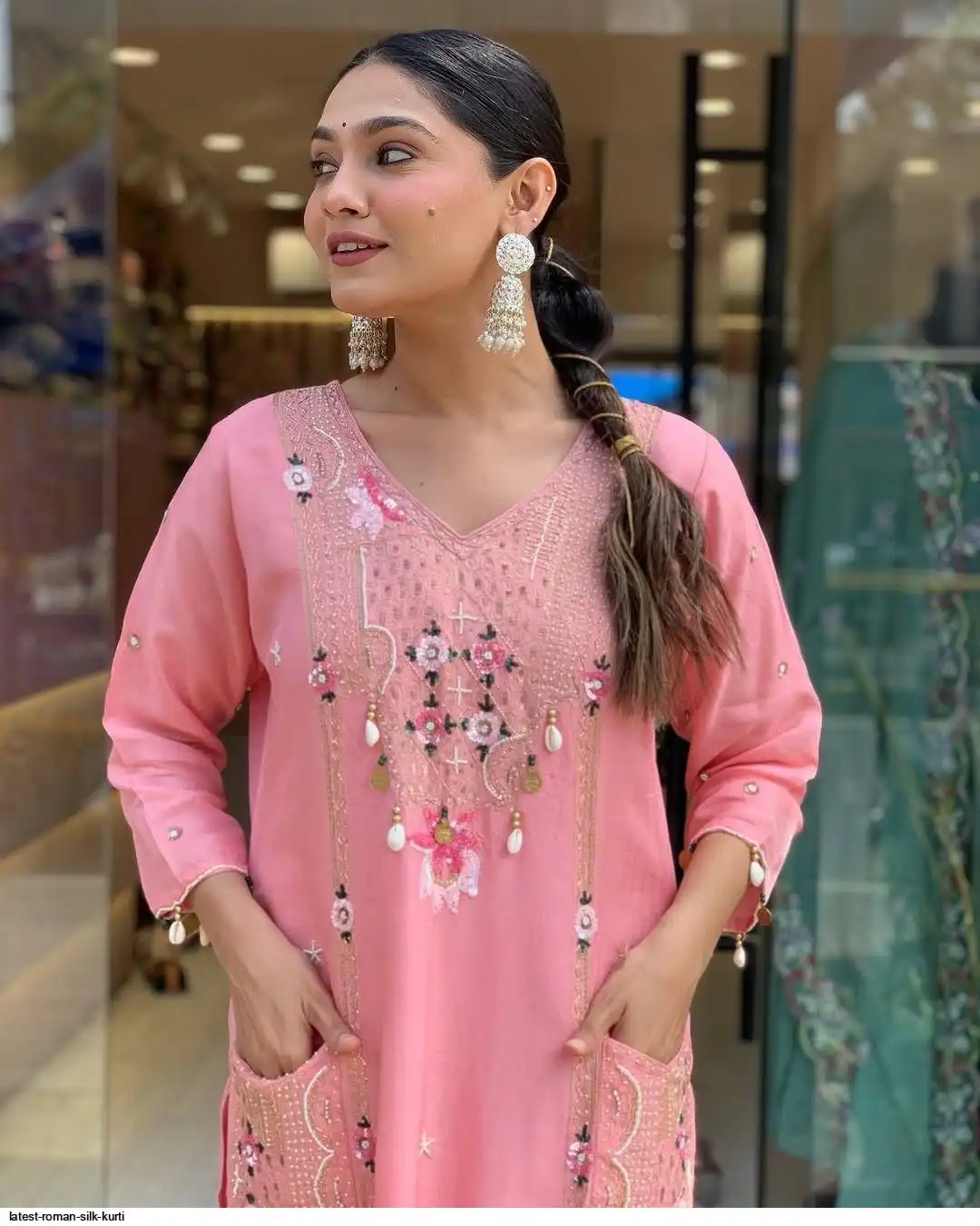 Our Exclusive Collection is here, to add a touch of tradition to your wardrobe. Featuring beautifully Crafted Pure Roman Silk Suits in beautiful Colours, which are decorated with finest sequence & Cowry Embroidery Work with Patch Print Detailing. A Must Have for Festivities!