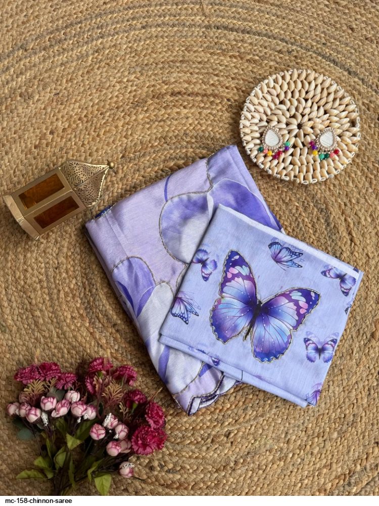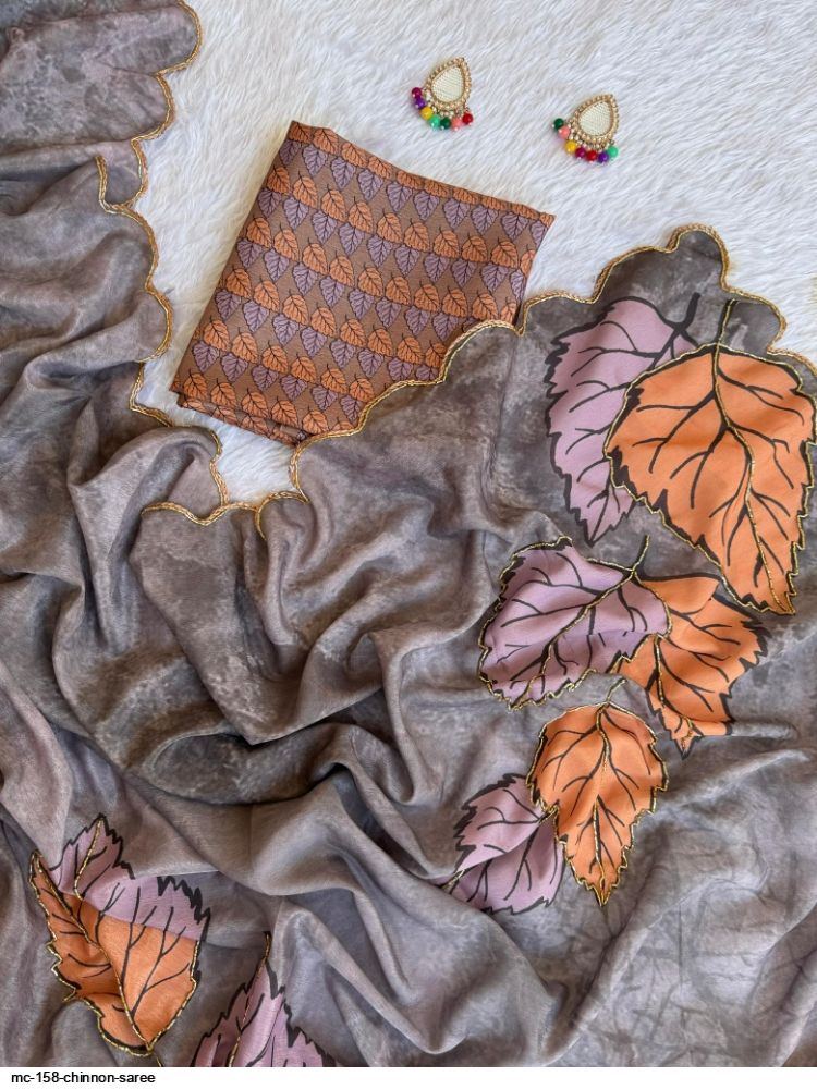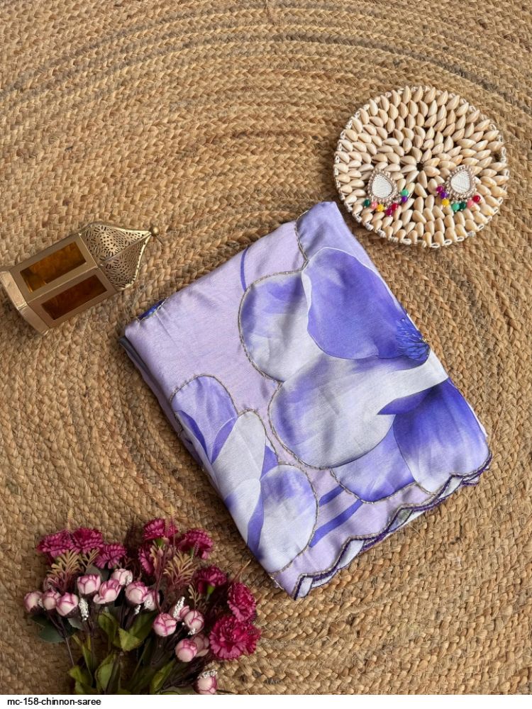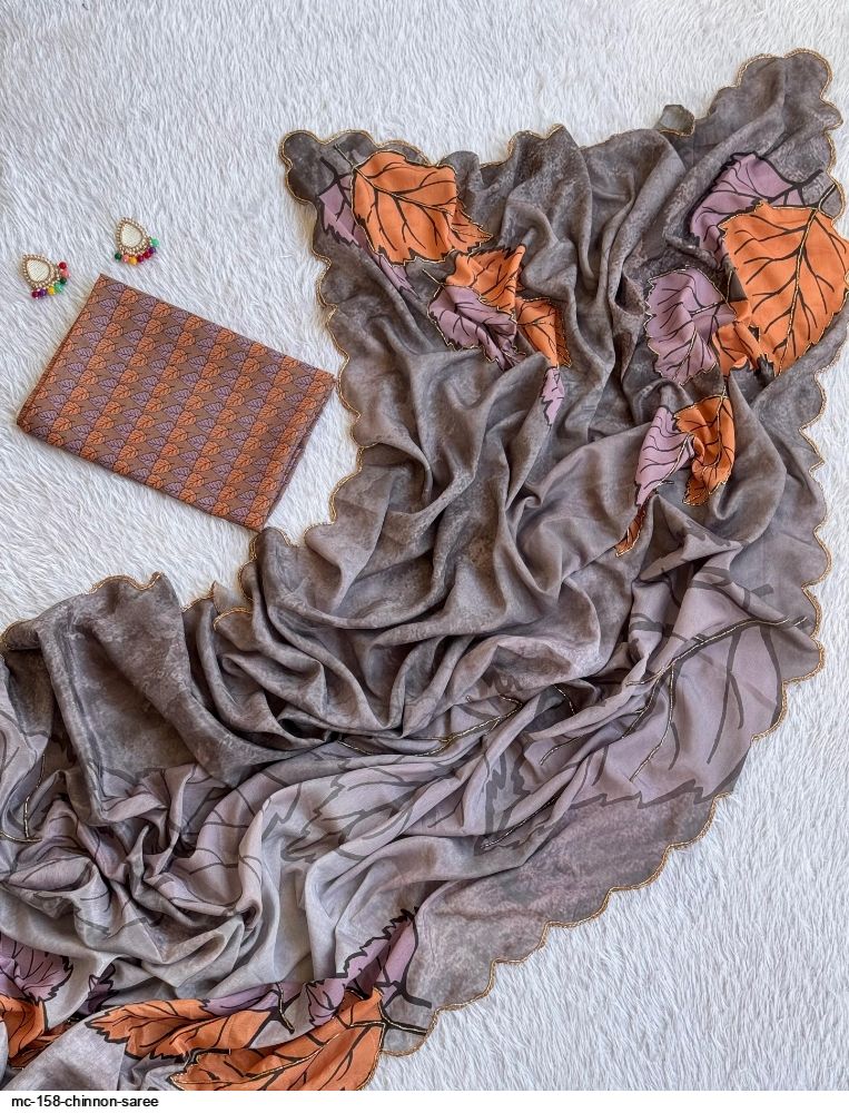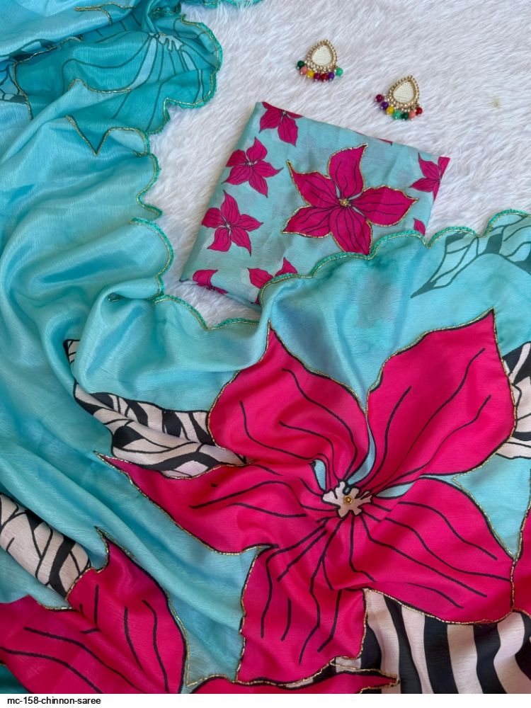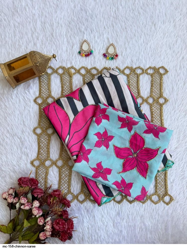 *🫴BEAUTIFUL WOMAN IN BEAUTIFUL SAREE!!..PURE CHINNON SILK DIGITAL PRINT SAREE WITH GOLD RAINBOW CUTDANA HANDWORK BORDER..! UNSTITCHED CHINON SILK WITH GOLD RAINBOW CUTDANA AND DIGITAL PRINT BLOUSE
