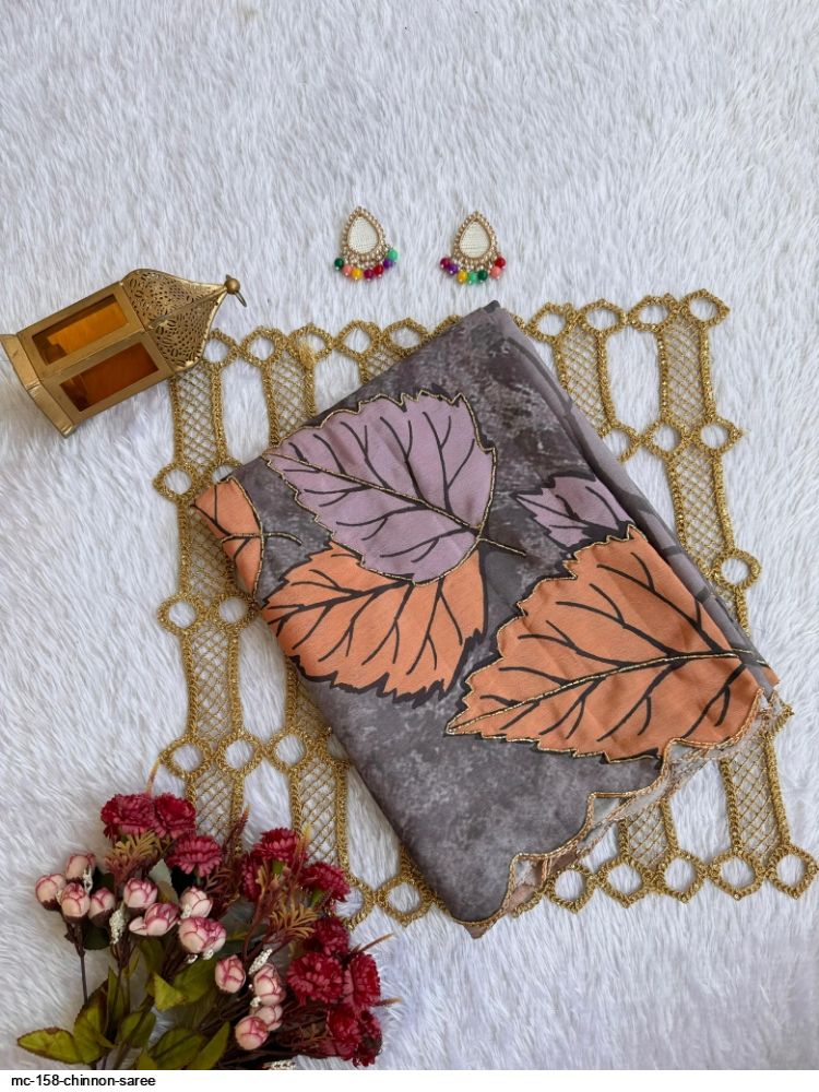 SAREE* PURE CHINON SILK DIGITAL PRINT SAREE WITH GOLD RAINBOW CUTDANA BORDER AND CUTDANA HANDWORK..!