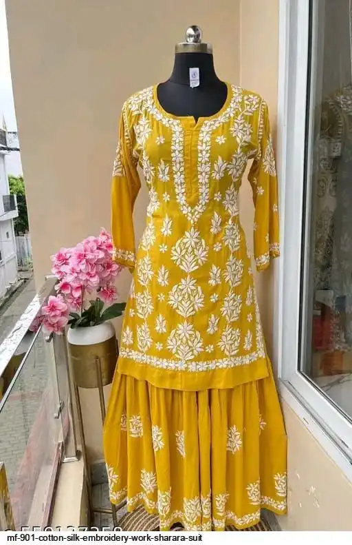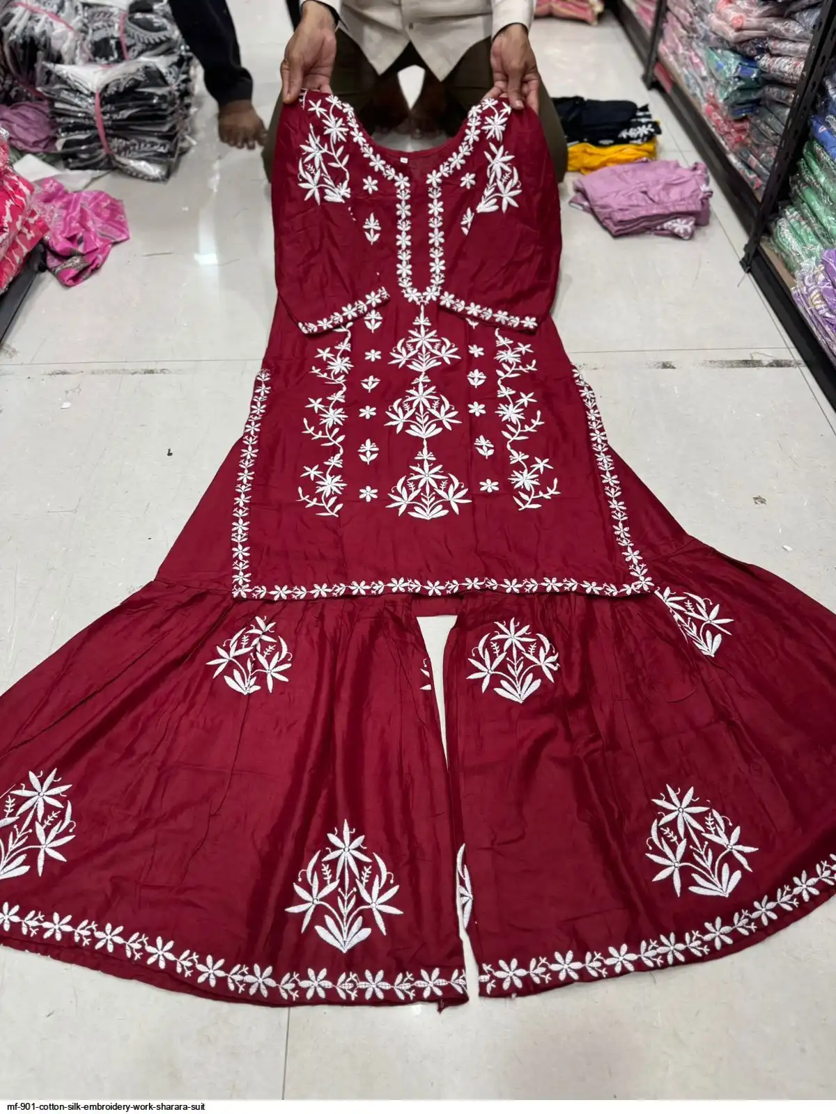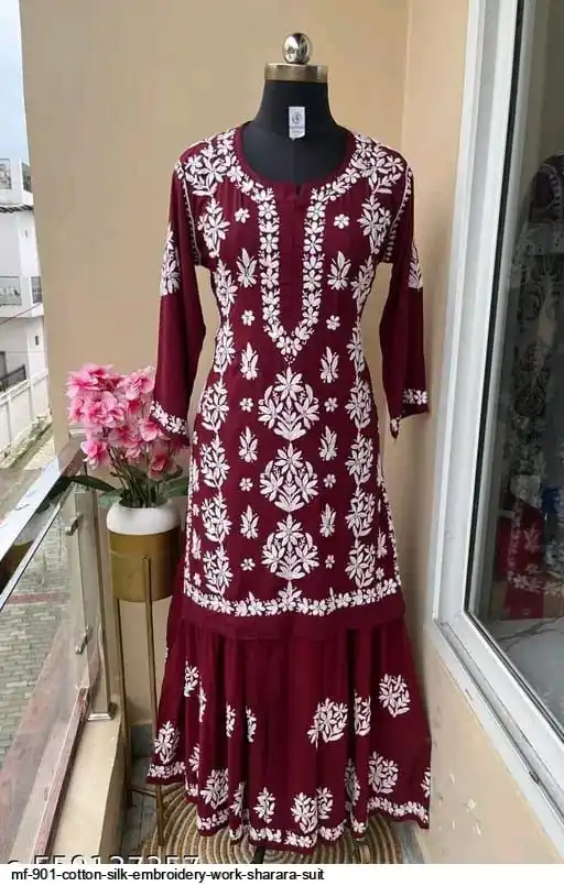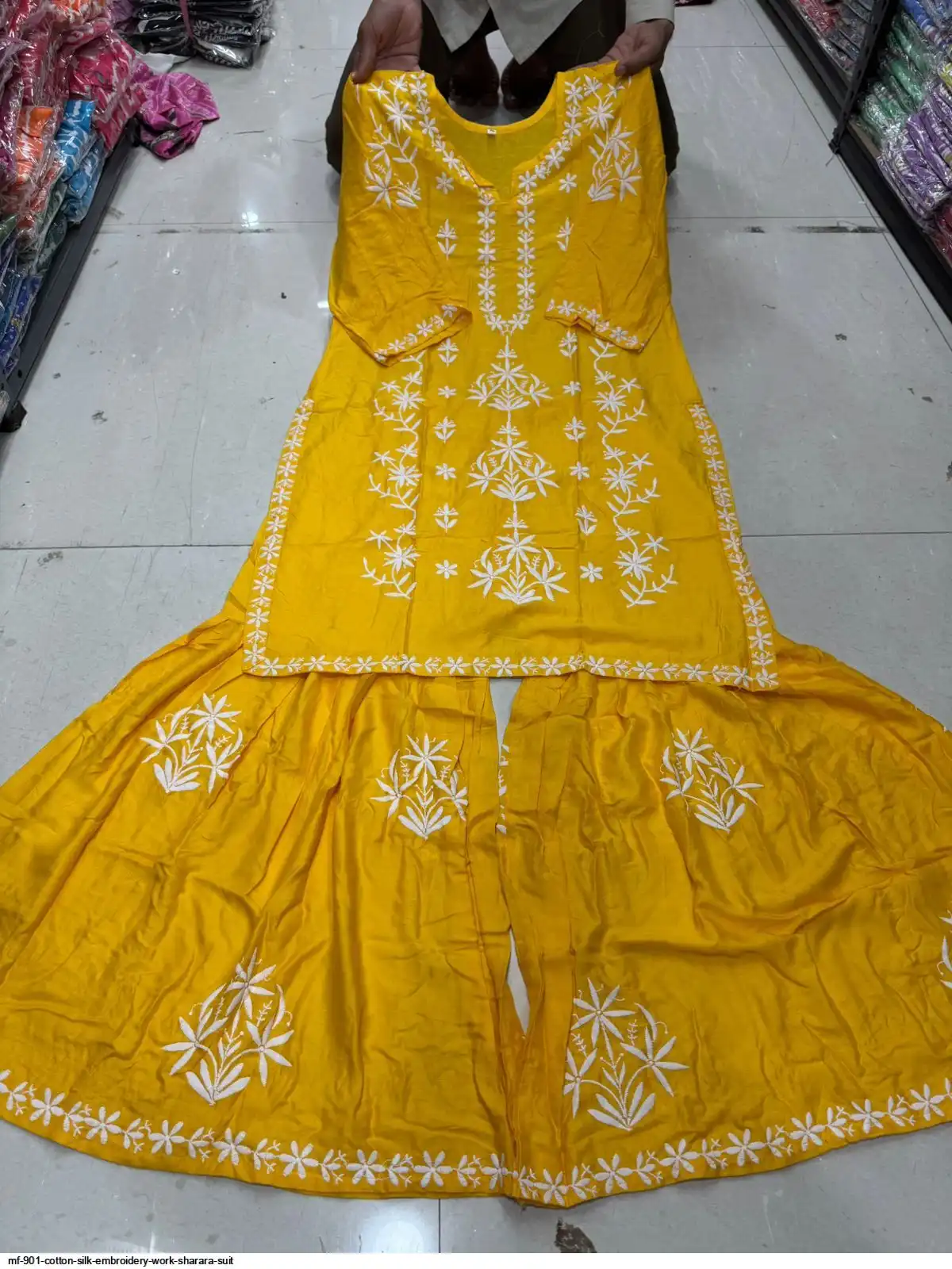 Presenting Beautiful Heavy quality COTTON Silk Fabric designer festive wear kurti and sharara pent with embroidery chickenkari style work