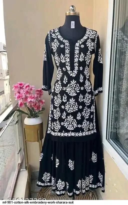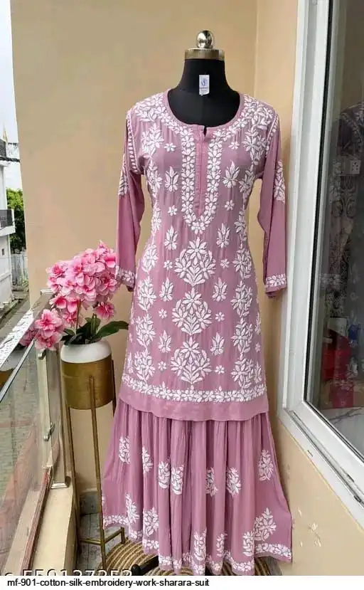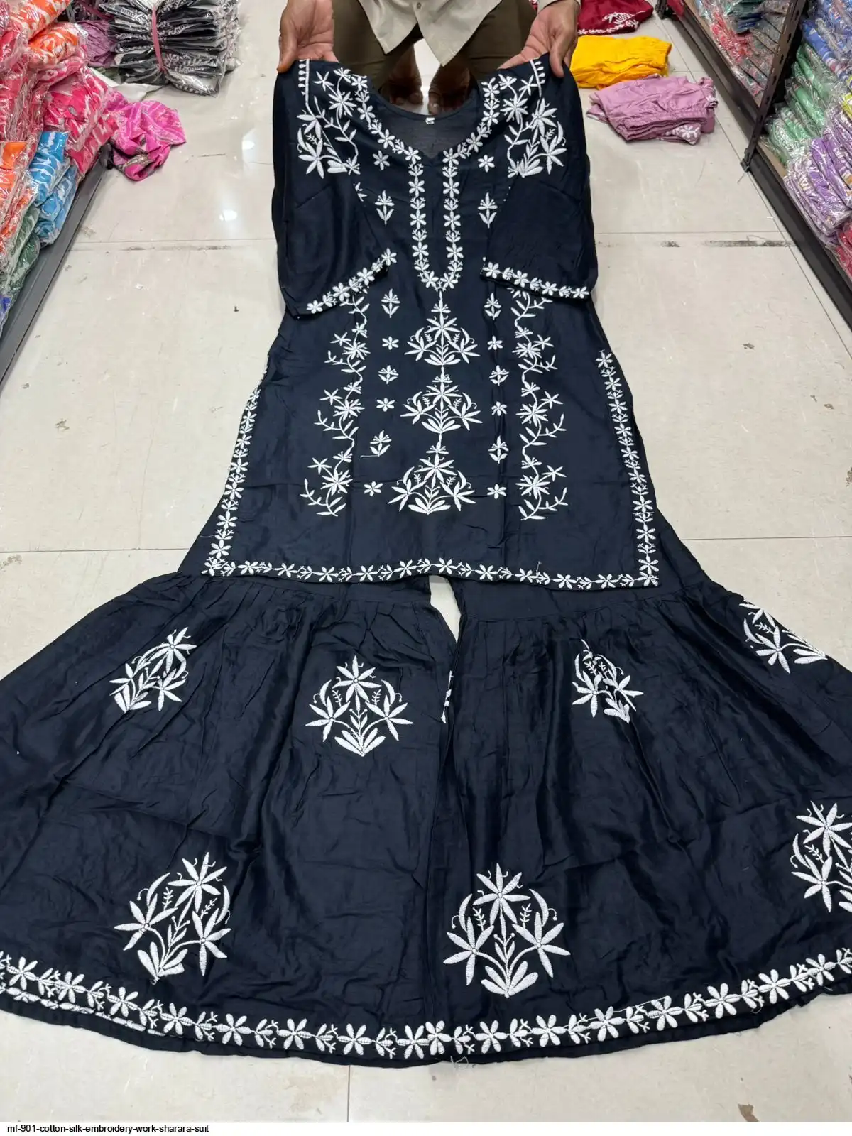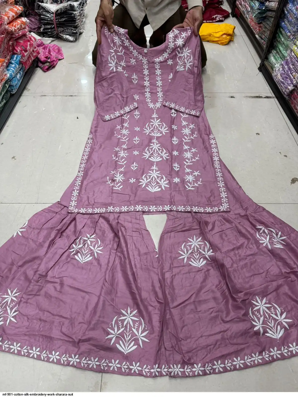 Presenting Beautiful Heavy quality COTTON Silk Fabric designer festive wear kurti and sharara pent with embroidery chickenkari style work
