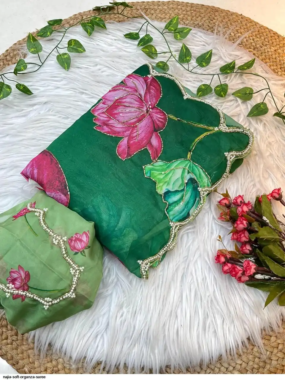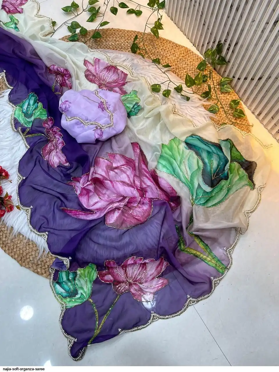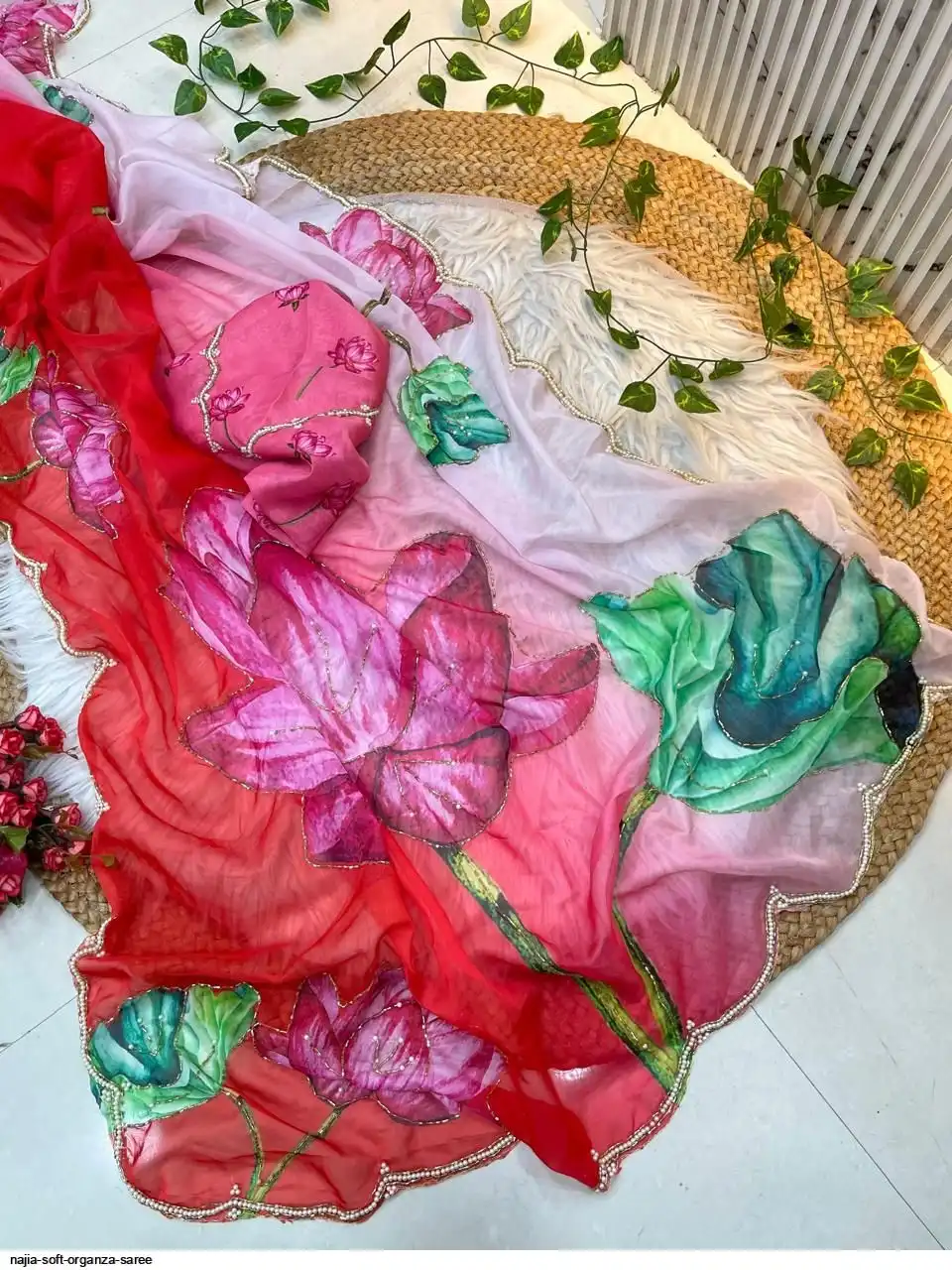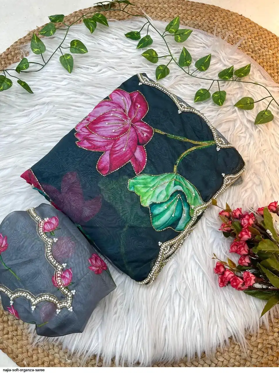 Saree:- Havy Soft Organza Fabric With Beutiful Floral Prints With Beads And Katdana Handwork In Border