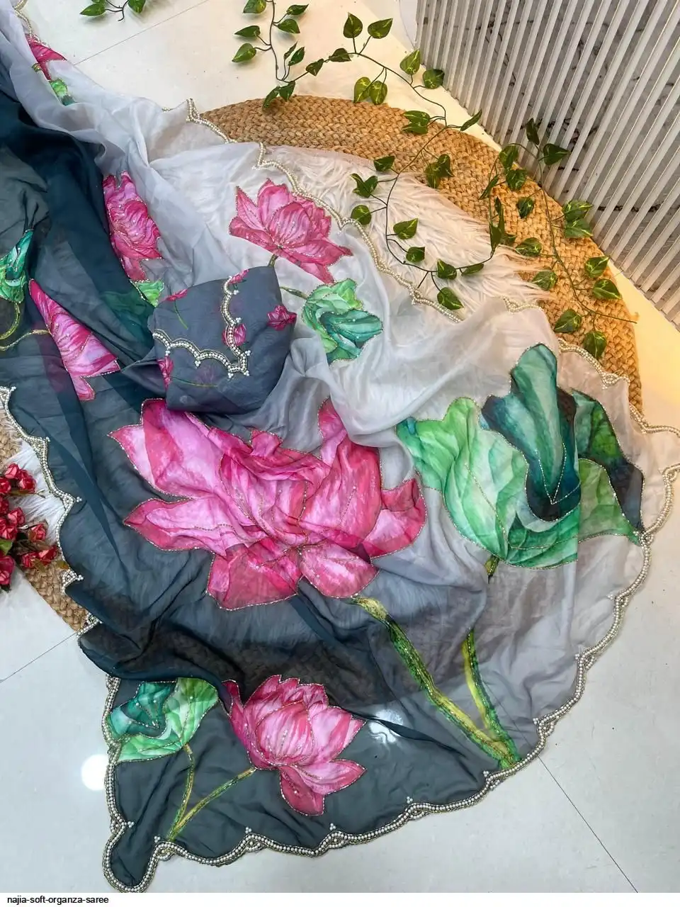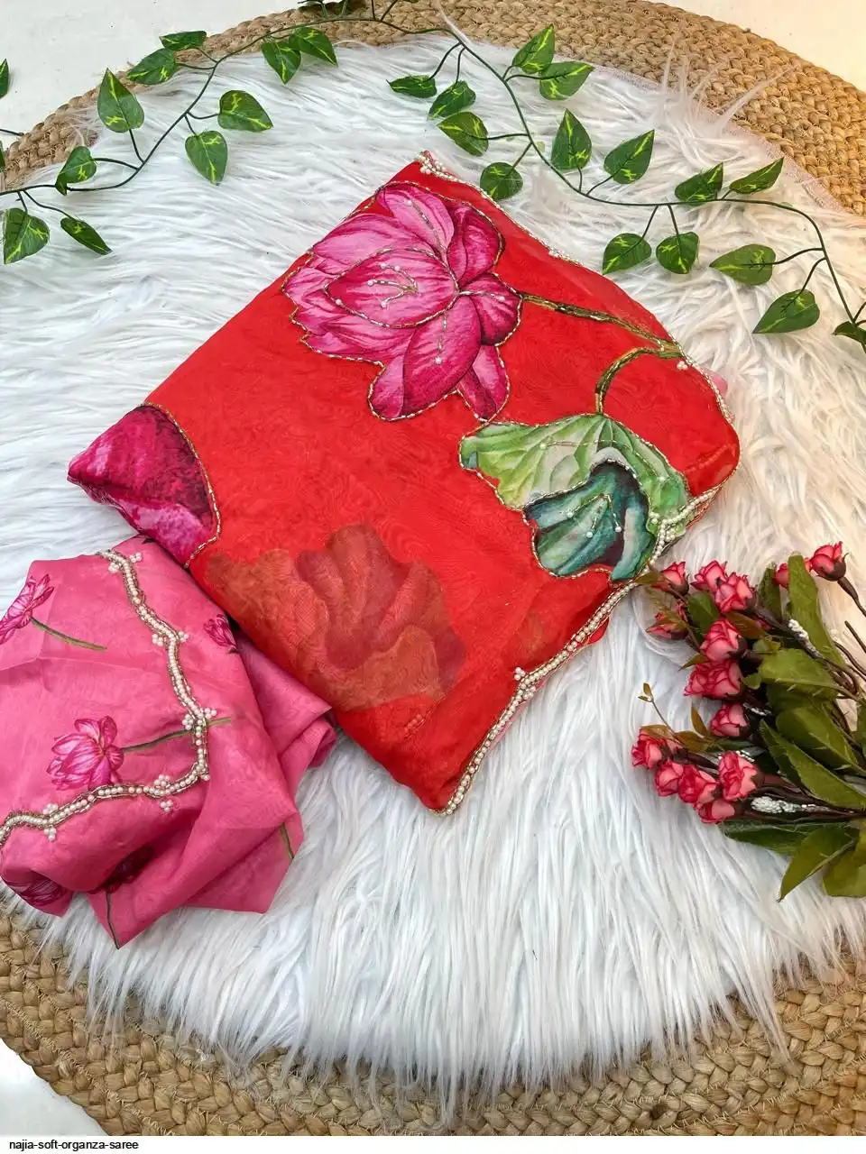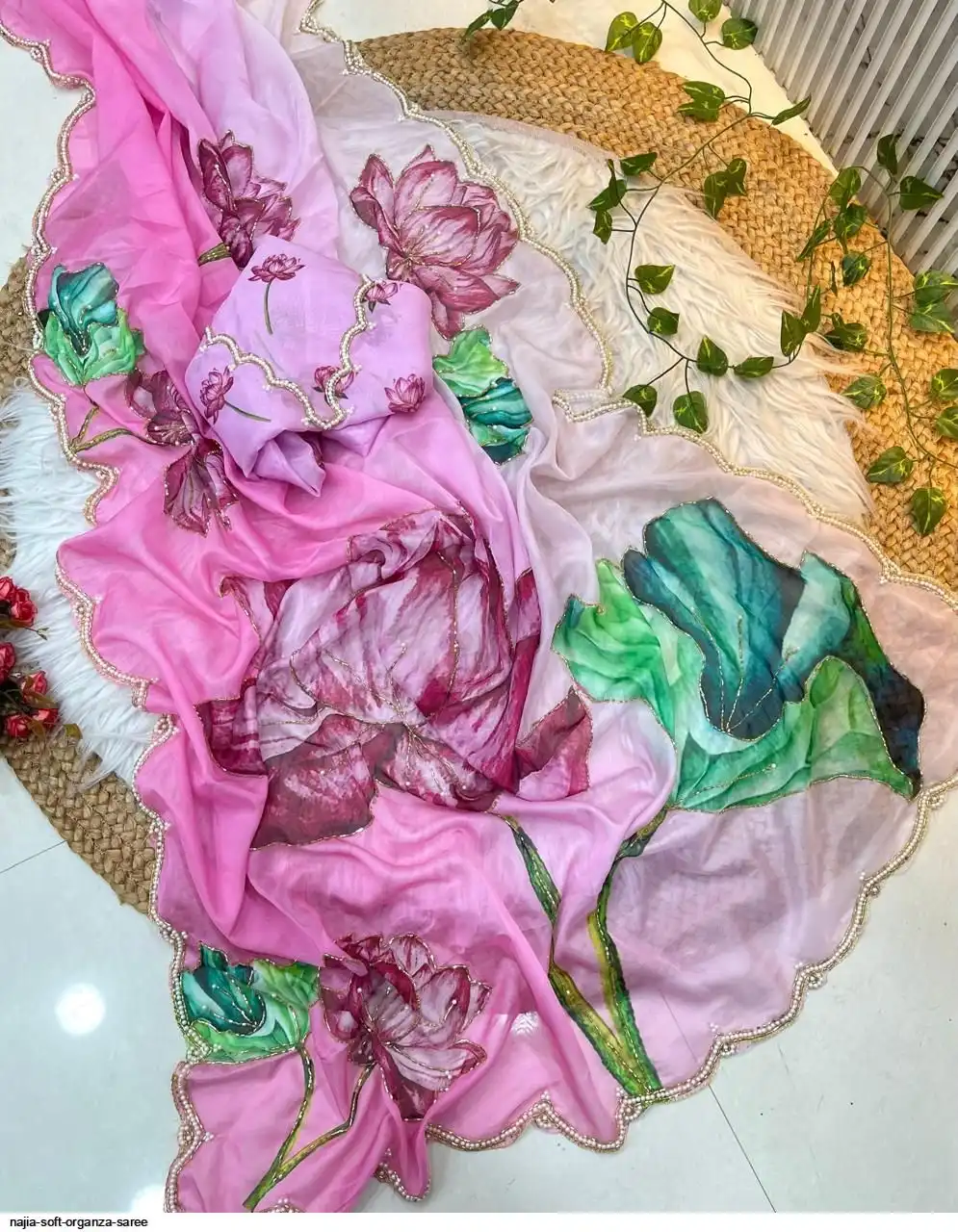 Saree:- Havy Soft Organza Fabric With Beutiful Floral Prints With Beads And Katdana Handwork In Border