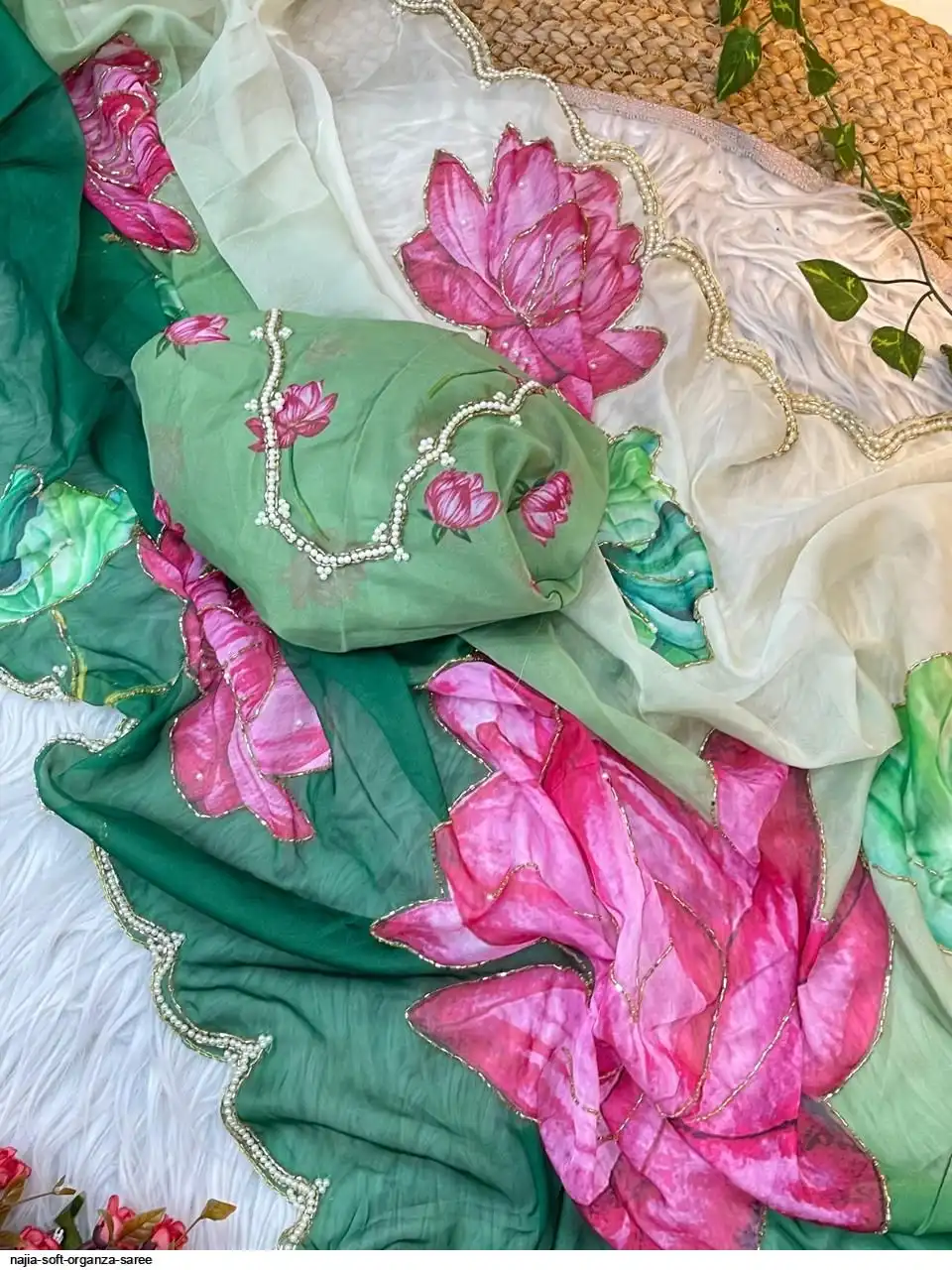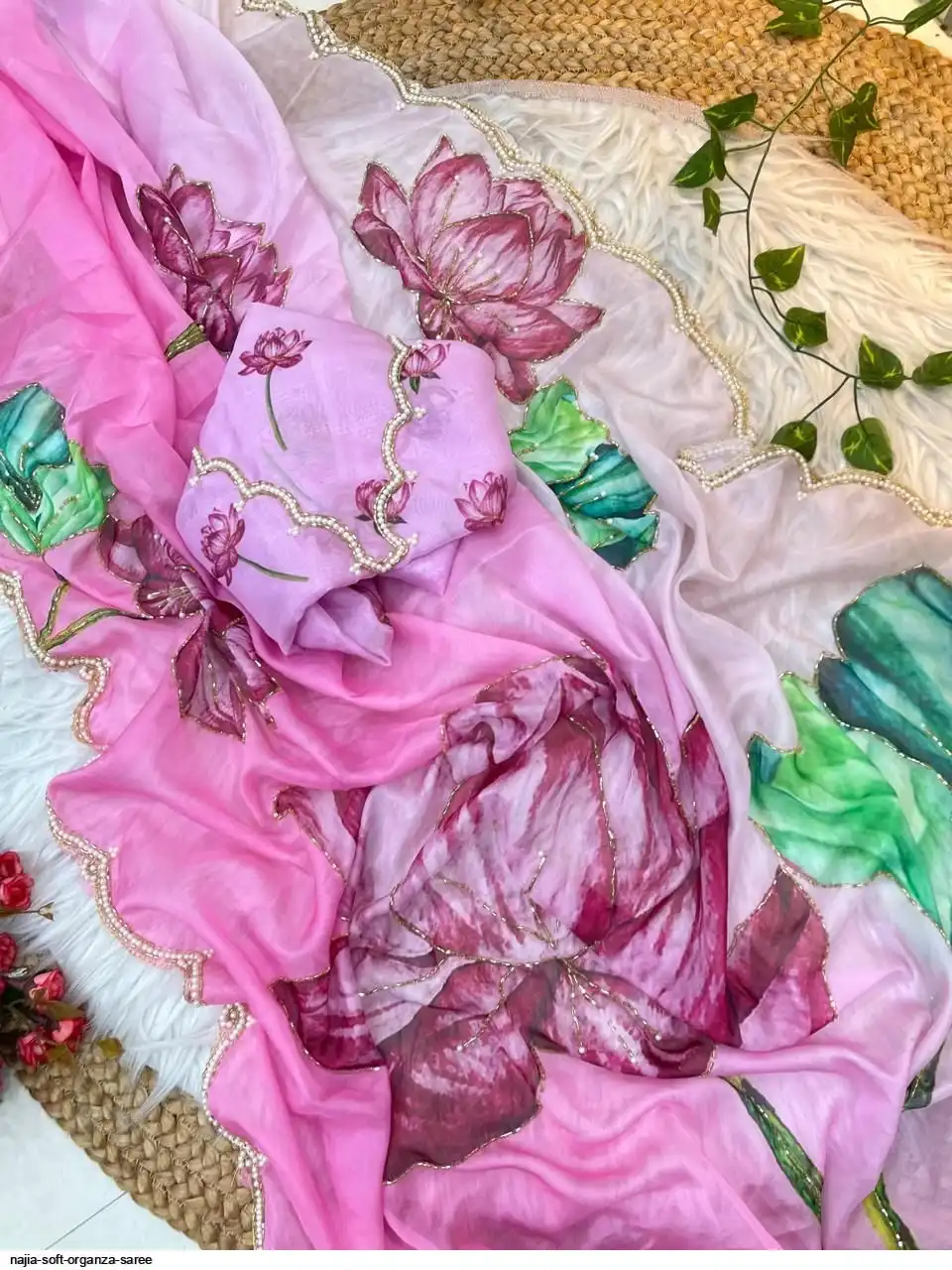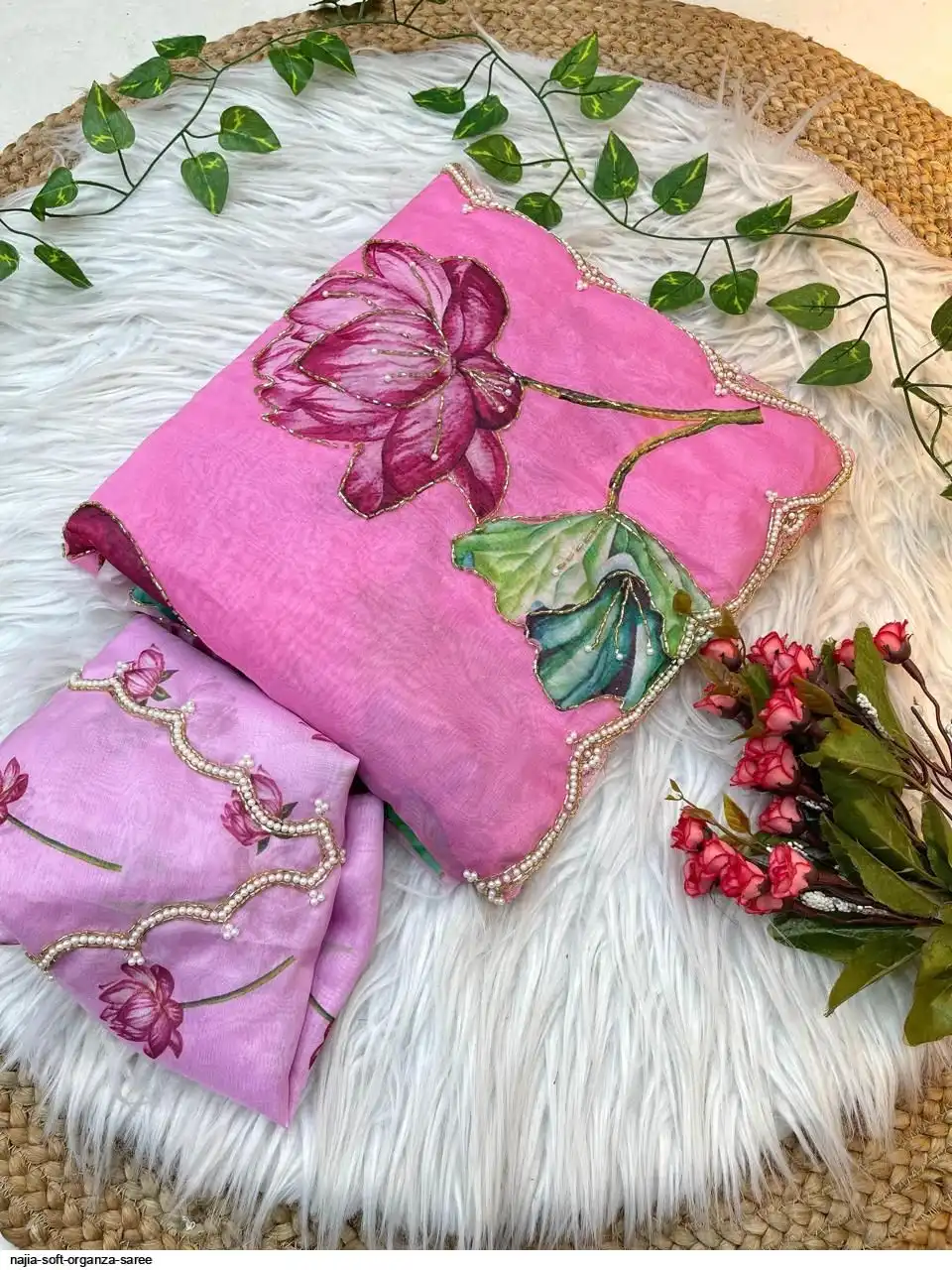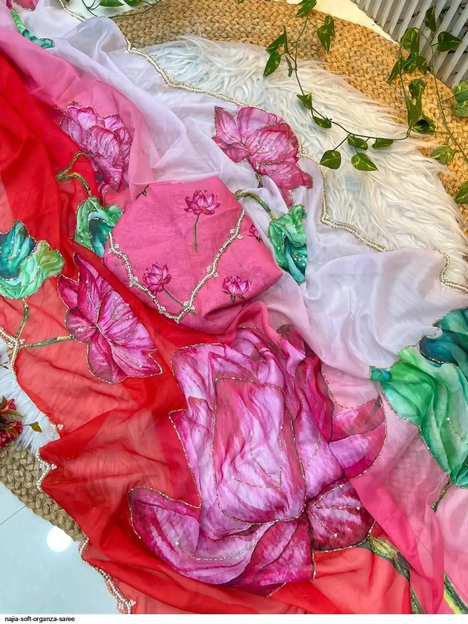 Saree:- Havy Soft Organza Fabric With Beutiful Floral Prints With Beads And Katdana Handwork In Border