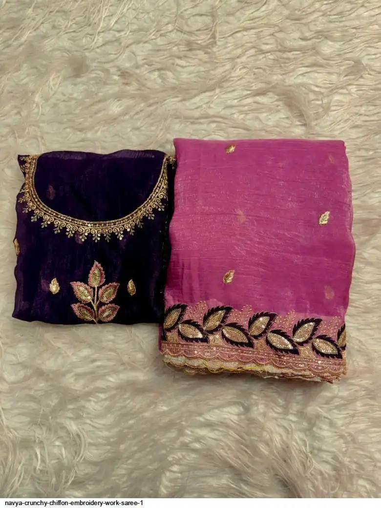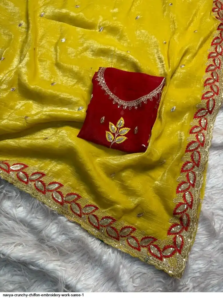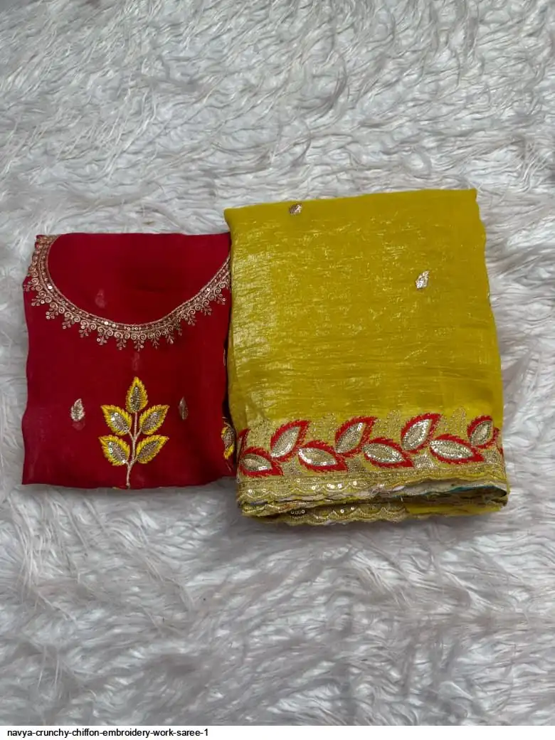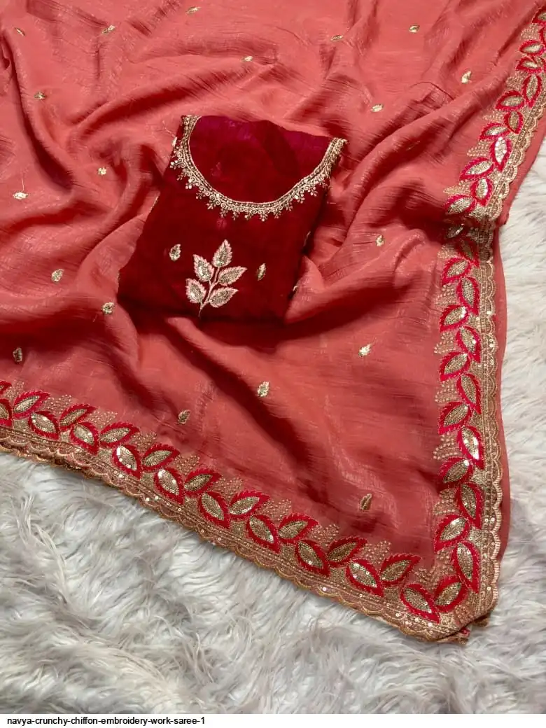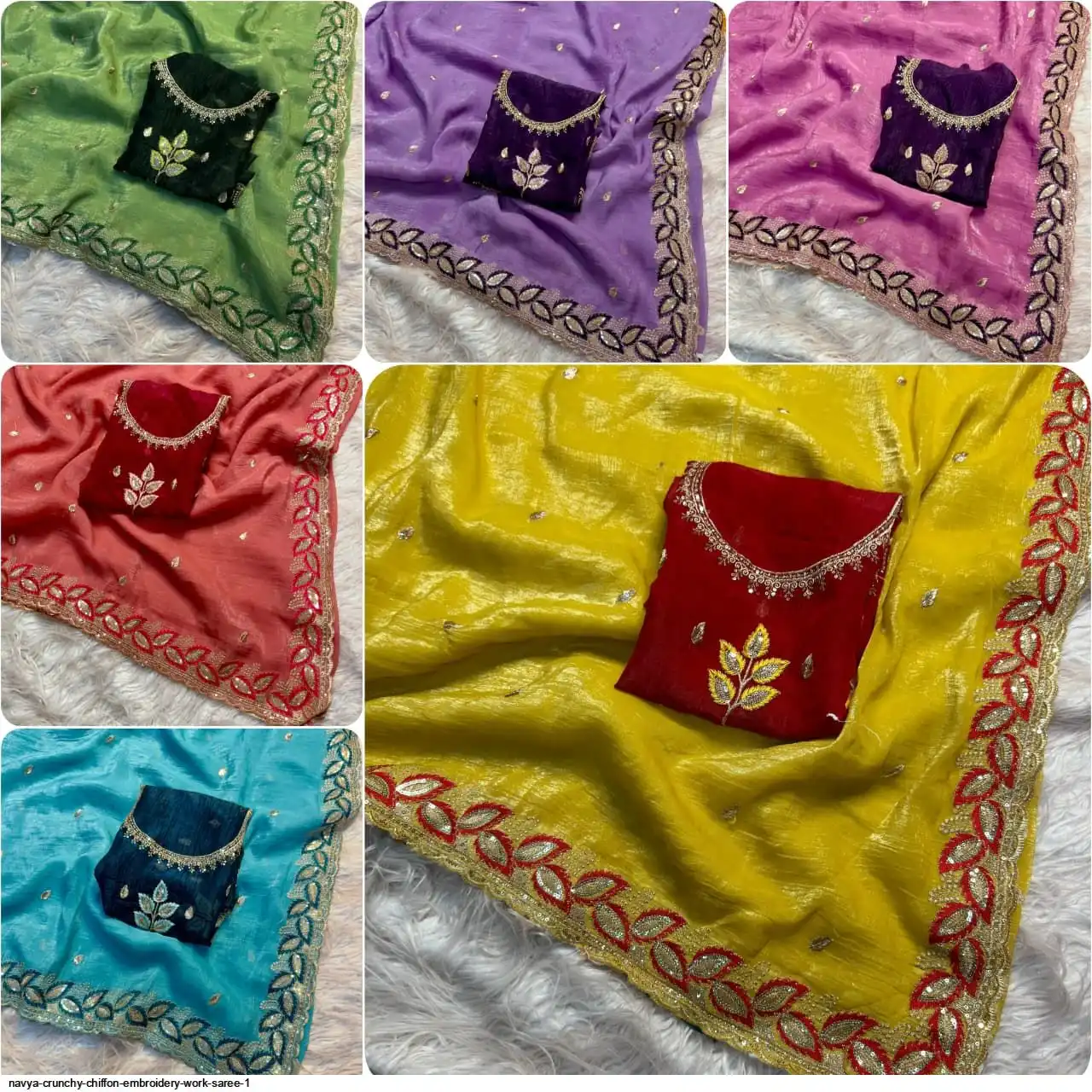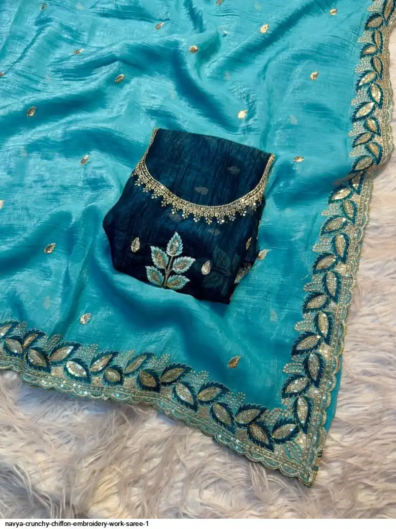 Saree fabric- crunchy ciffon saree with elegant scalap embroidery work.