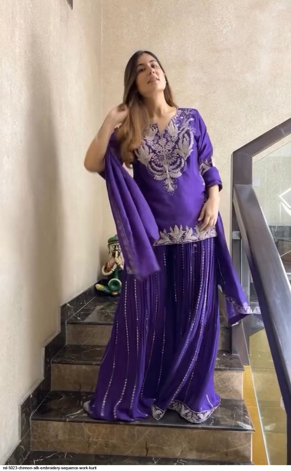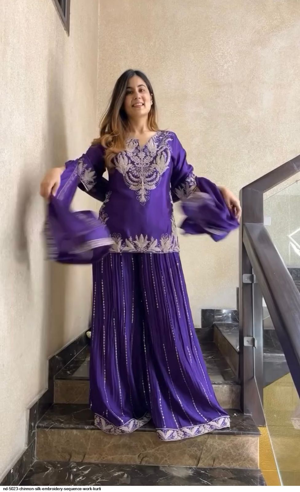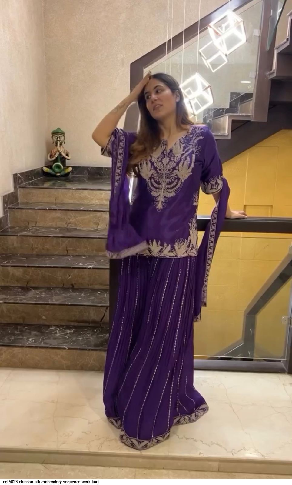 Sharara fabric :Pure Heavy Chinnon Silk With Heavy Embroidery Coding Sequence Work (FullyStitched)
